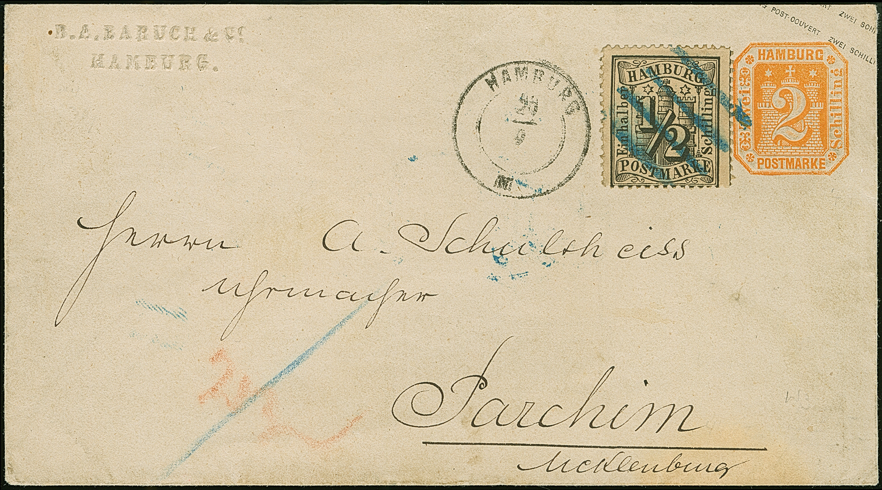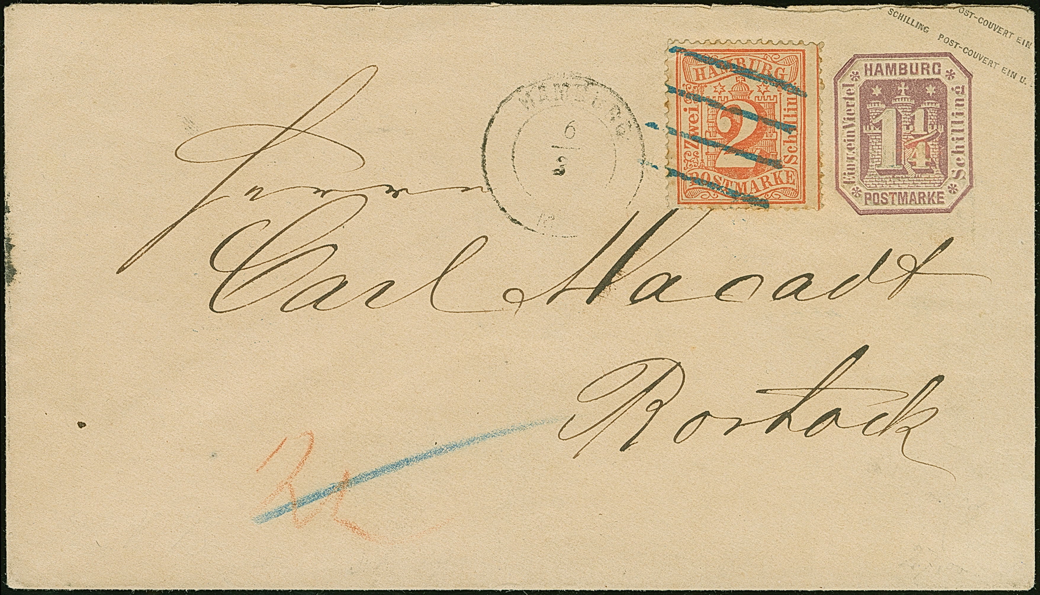 Umschlag 1¼ Sch. mit Zufrankatur 2 Sch. orangerot, mit blauem Strichstempel und nebengesetztem Mecklenburger DKr. "HAMBURG ST. P. 6/3" nach Rostock, mit Ausgabestempel. Die Marke kleine Zahnfehler und ein Zahn leicht stockig, der Wertstempel ganz kleine Verfärbung, sonst gute Erhaltung. Eine wohl einmalige Kombination.
