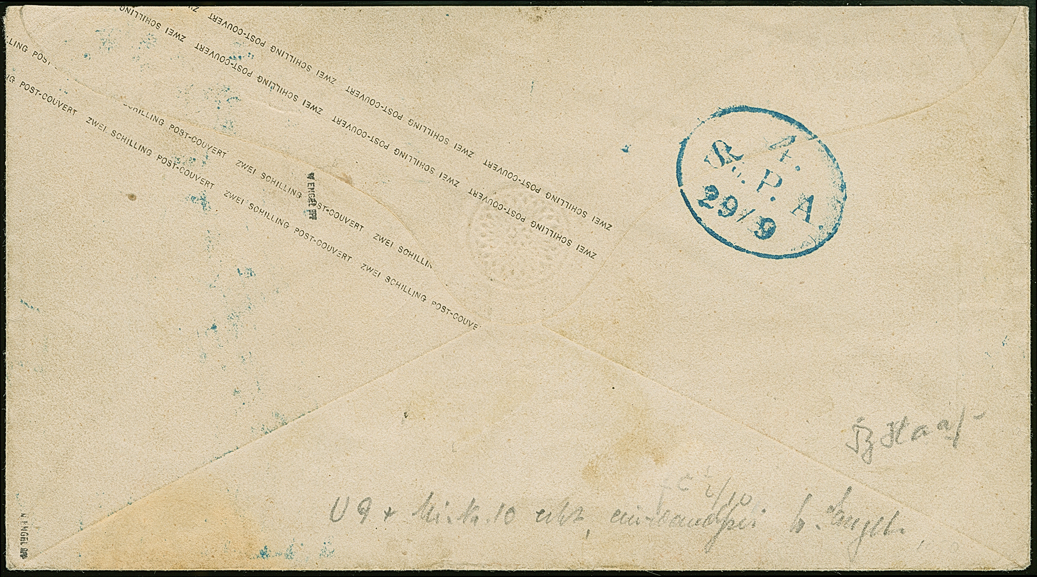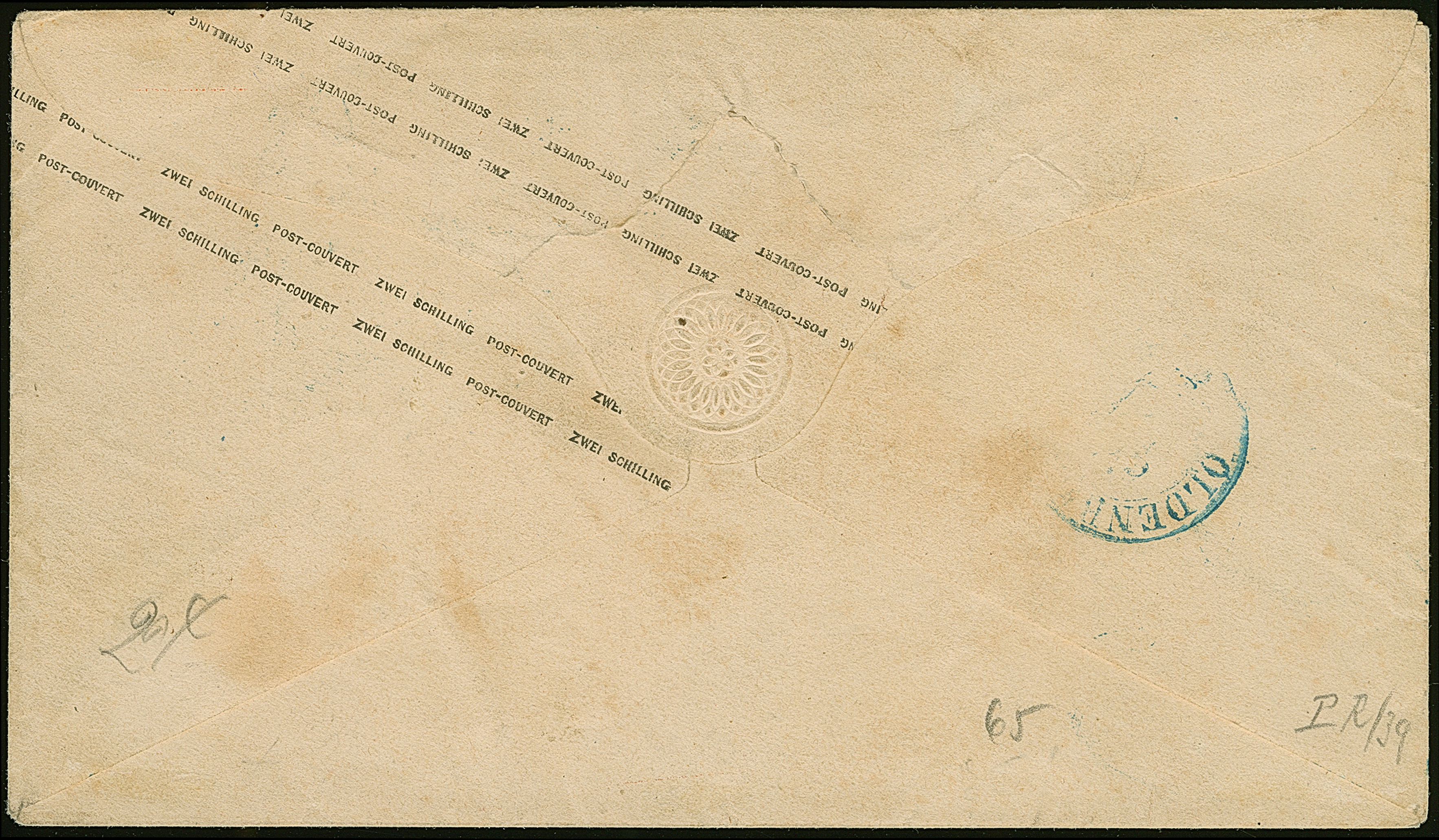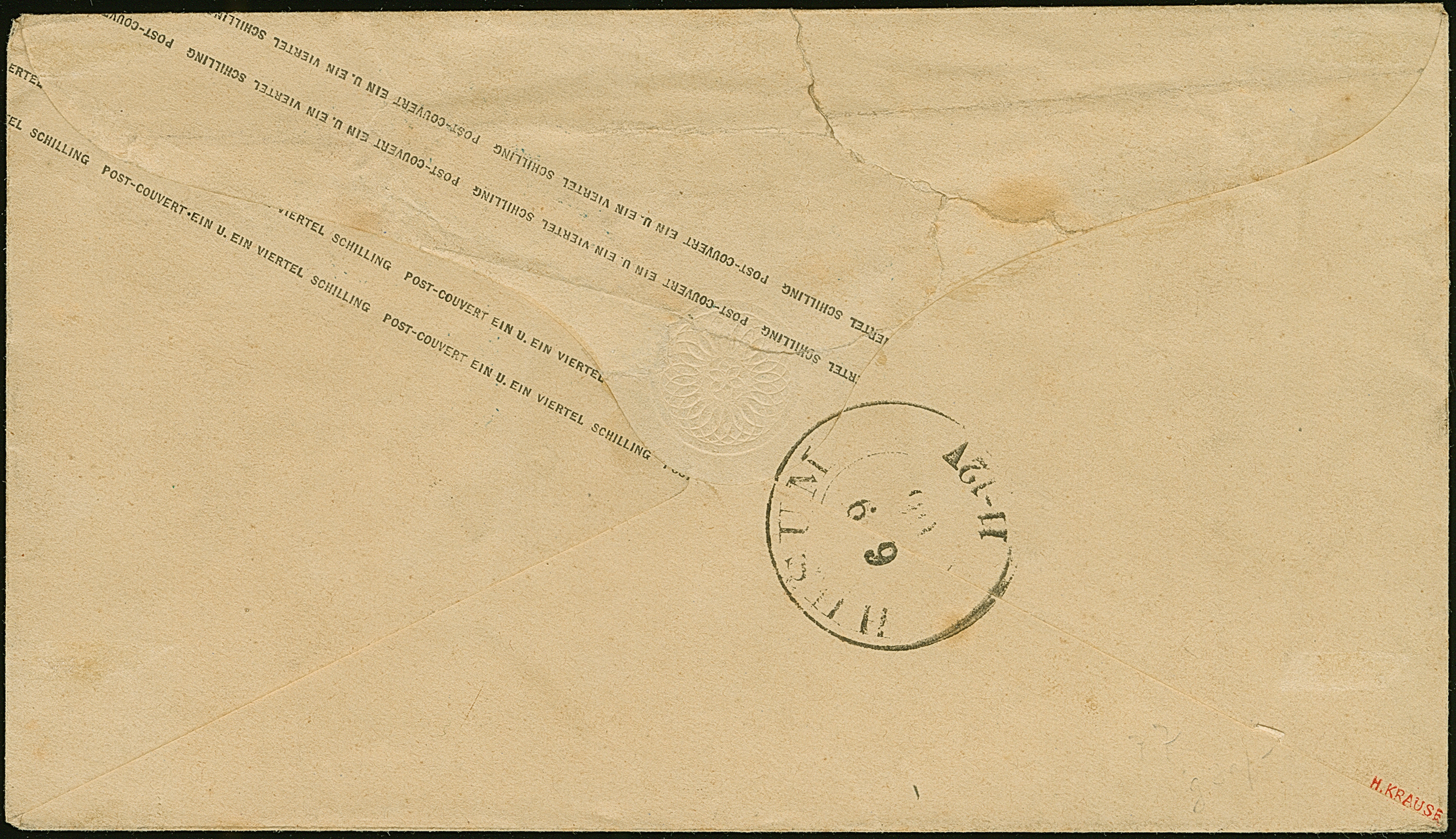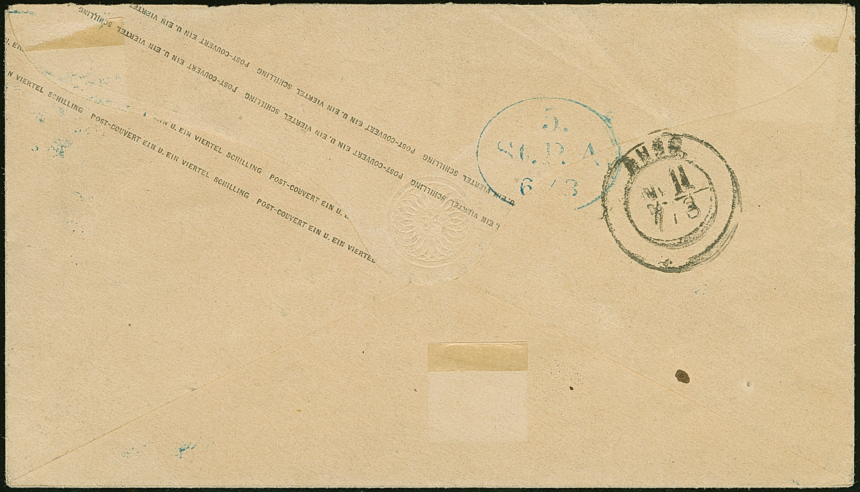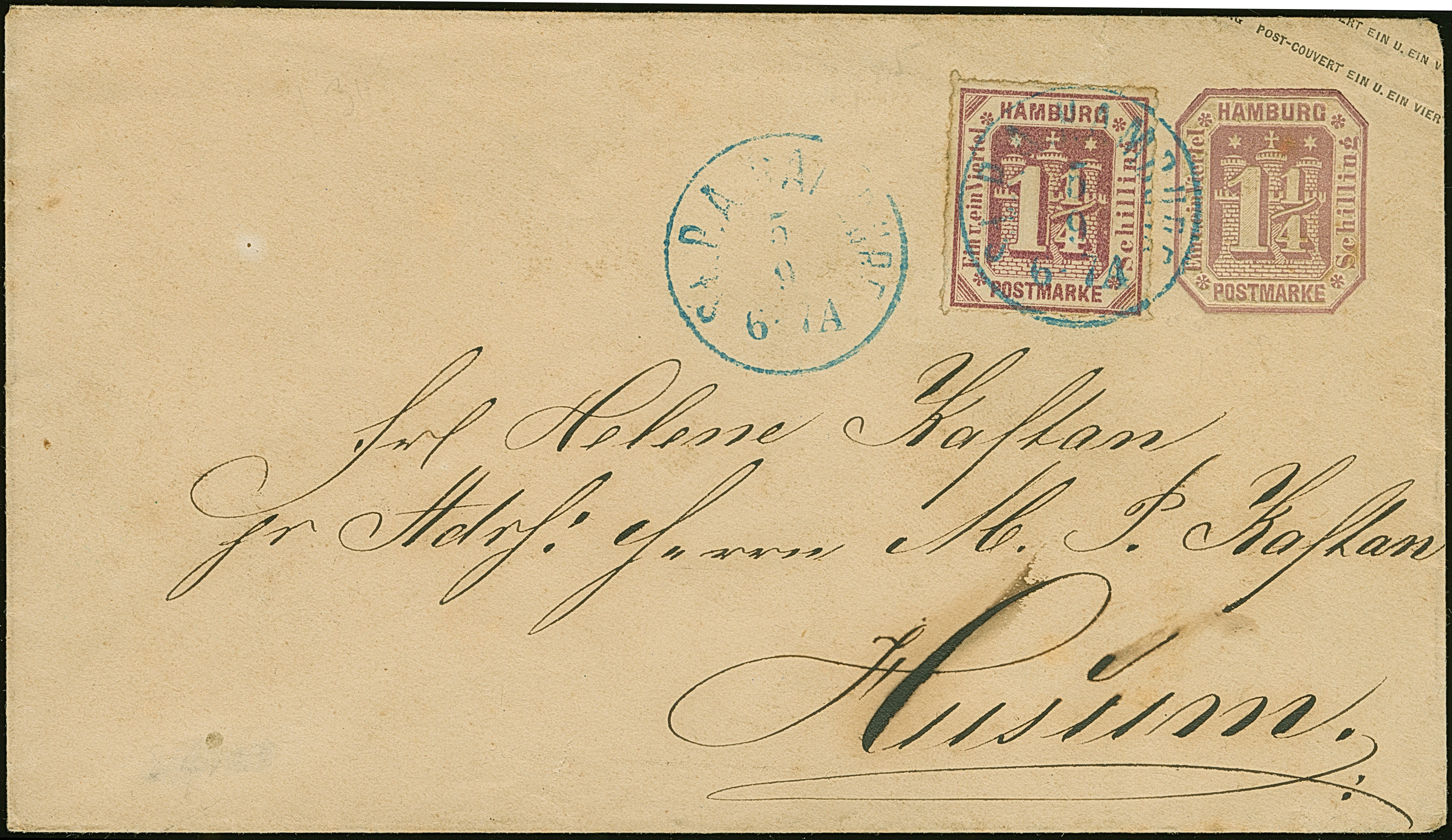 Umschlag 1¼ Sch. mit wertstufengleicher Zufrankatur, Prägedruck 1¼ Sch., mit blauem EKr. " ST. P.A. HAMBURG 5/9" nach Husum, mit Ankunftsstempel. Die rückseitige Verschlussklappe etwas fehlerhaft und der Umschlag unauffällig gereinigt, sonst gute Erhaltung. Eine sehr seltene Kombination; PROFI hat nur 2 weitere solche registriert.