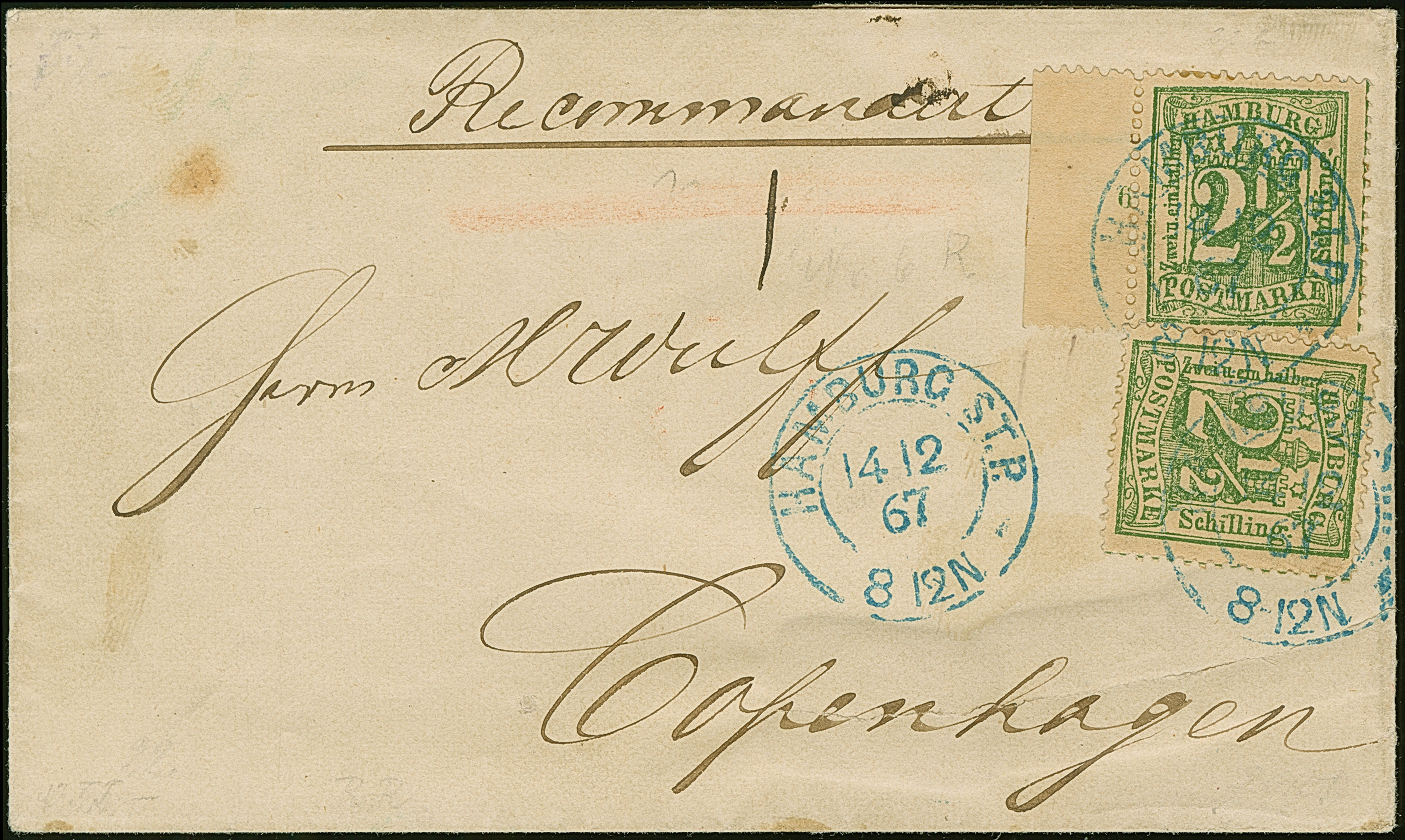 2½ Sch. dunkelolivgrün, 2 Einzelwerte in unterschiedlichen Nuancen, dabei einmal mit linkem Bogenrand mit Reihenzähler "6", mit sauber auf- und nebengesetztem blauen DKr. "HAMBURG ST. P. 14 12 67" auf recommandierter Briefhülle nach Kopenhagen. Im Kuvert unauffälliger längerer Einriss (mit Falzen gestützt) sonst gute Erhaltung. Eine sehr seltene Frankatur, insbesondere mit dem Randstück.