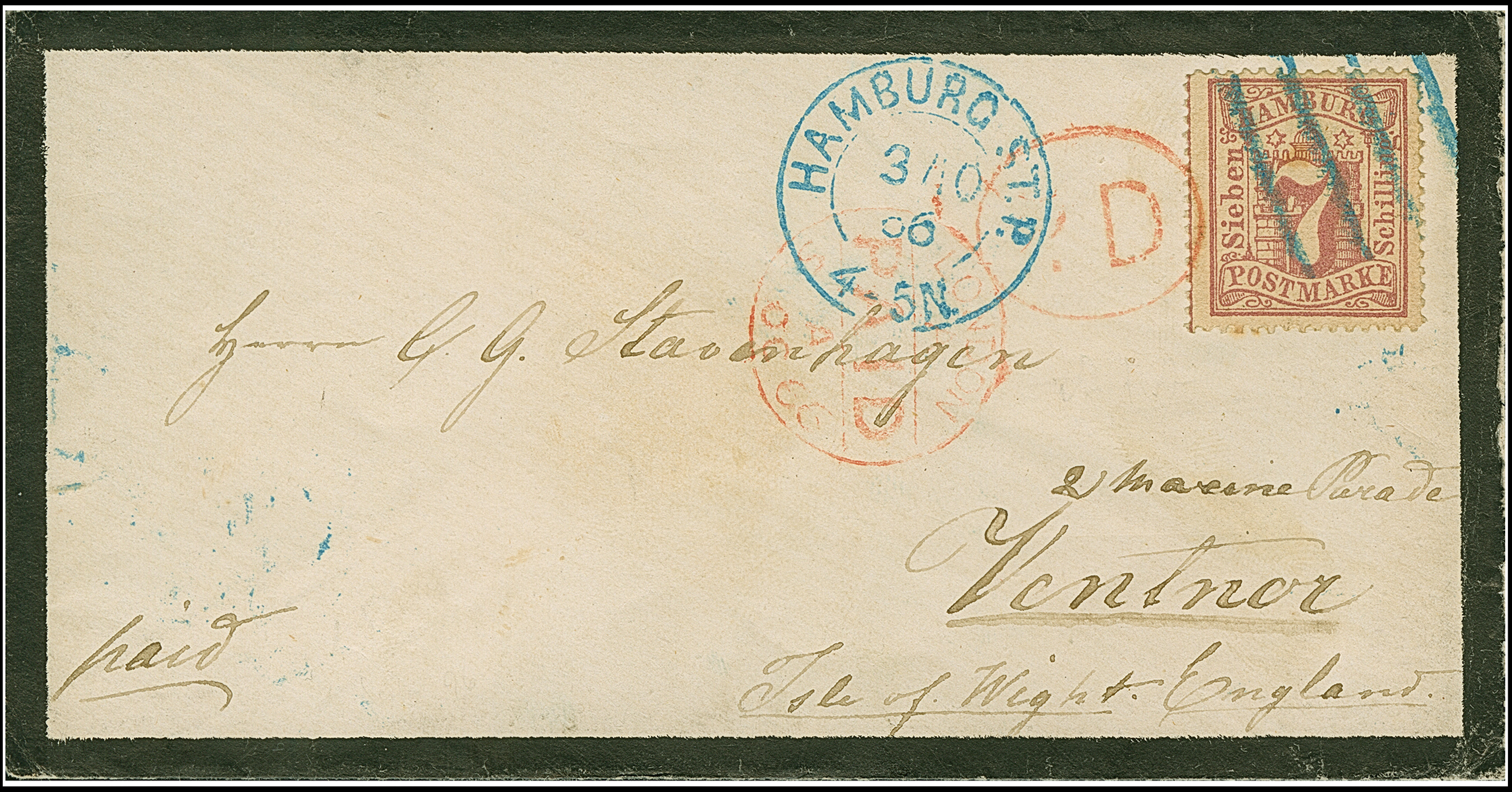 7 Sch. graulila, farbfrisch und gut gezähnt, mit blauem Strichstempel, übergehendem roten "P.D." und nebengesetztem blauen DKr. "HAMBURG ST.P. 3/10 66" auf kleinem Trauer-Briefkuvert auf die Isle of Wight.