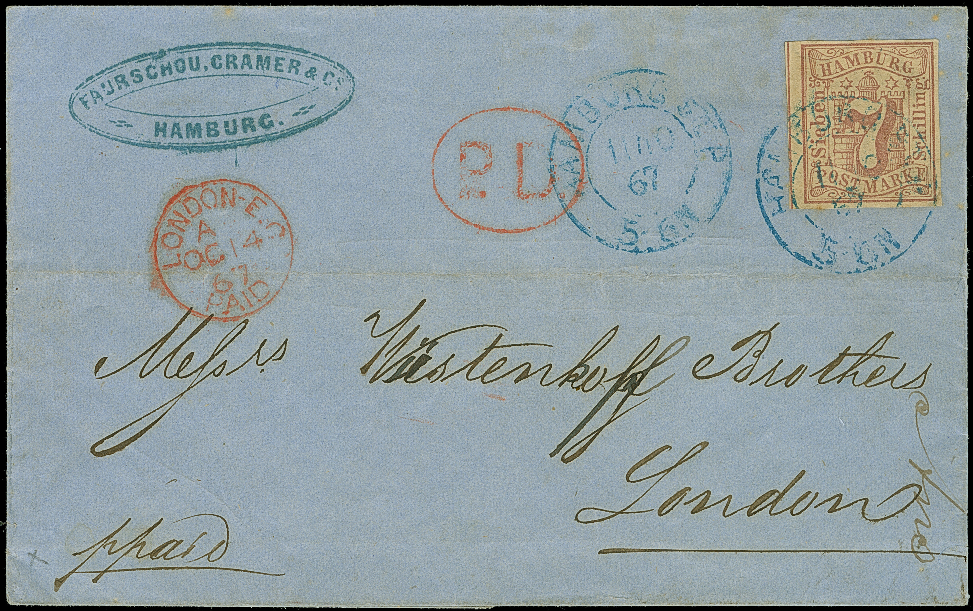 7 Sch. bräunlichlila, voll- bis breitrandig ungezähnt, mit sauber auf- und nebengesetztem blauen DKr. "HAMBURG ST. P. 11/10 67" auf Brief der bekannten "Wüstenkopf"-Korrespondenz nach London, mit vorderseitigen Ankunftsstempel. Ein interessantes Stück; jedoch kann aufgrund der Tatsache, dass die Marke mit Linienzähnung hergestellt wurde, eine sichere Bestätigung von 'ungezähnt' bei einer Einzelmarke nicht erfolgen. Der Verkauf erfolgt 'wie besehen'.