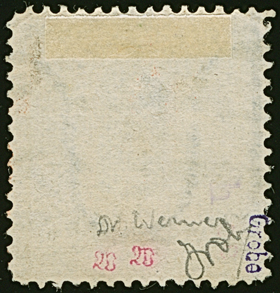 9 Sch. orangegelb, farbfrisch und gut gezähnt, sauber entwertet durch schwarzen Strichstempel. Obenwinzig geschürft, sonst tadellos. Signiert Dr. Werner und Grobe, Attest Engel BPP (1974)