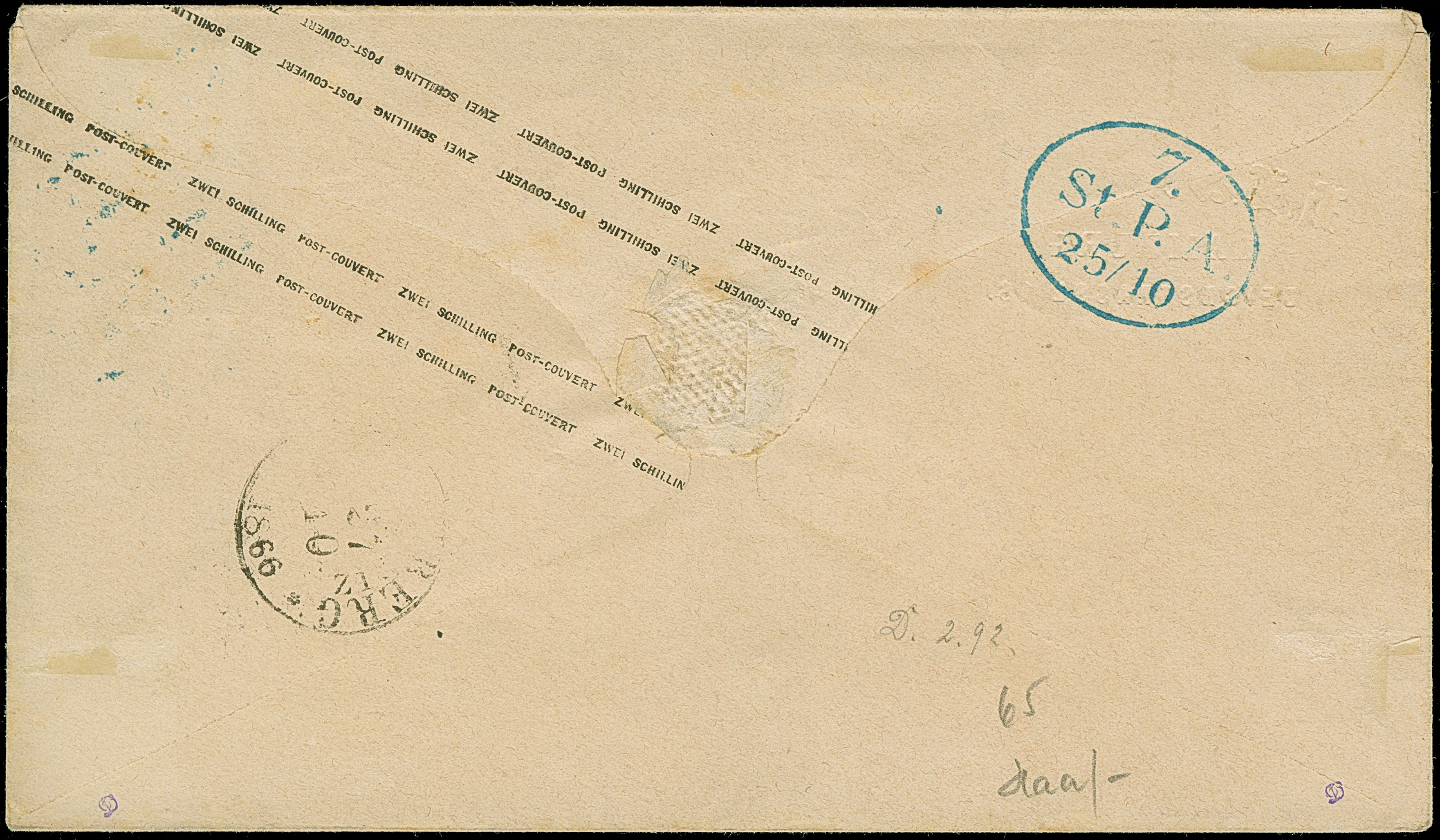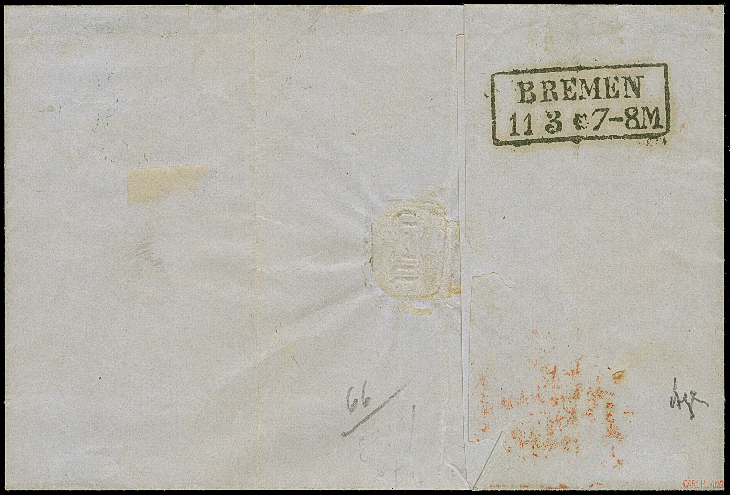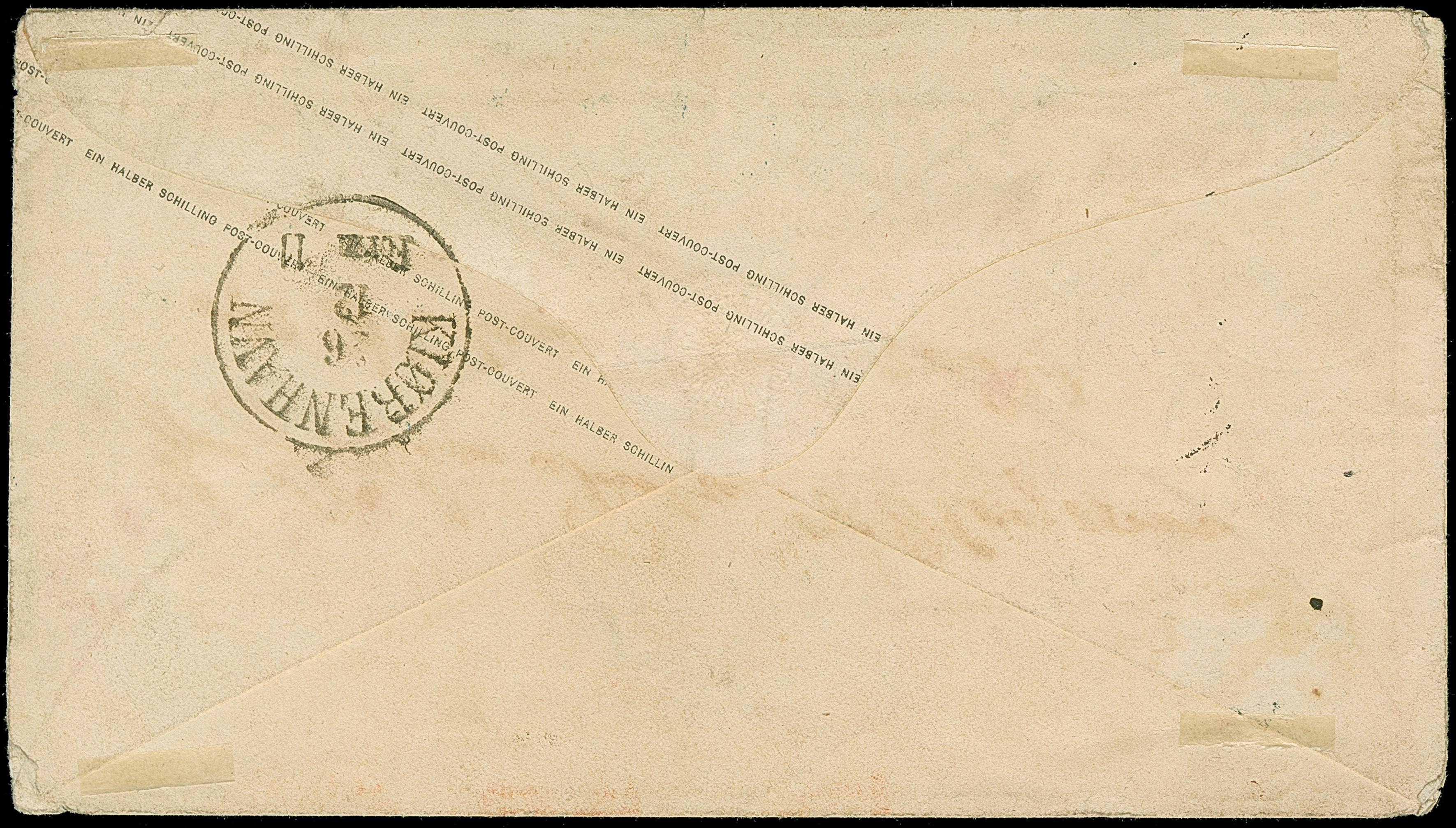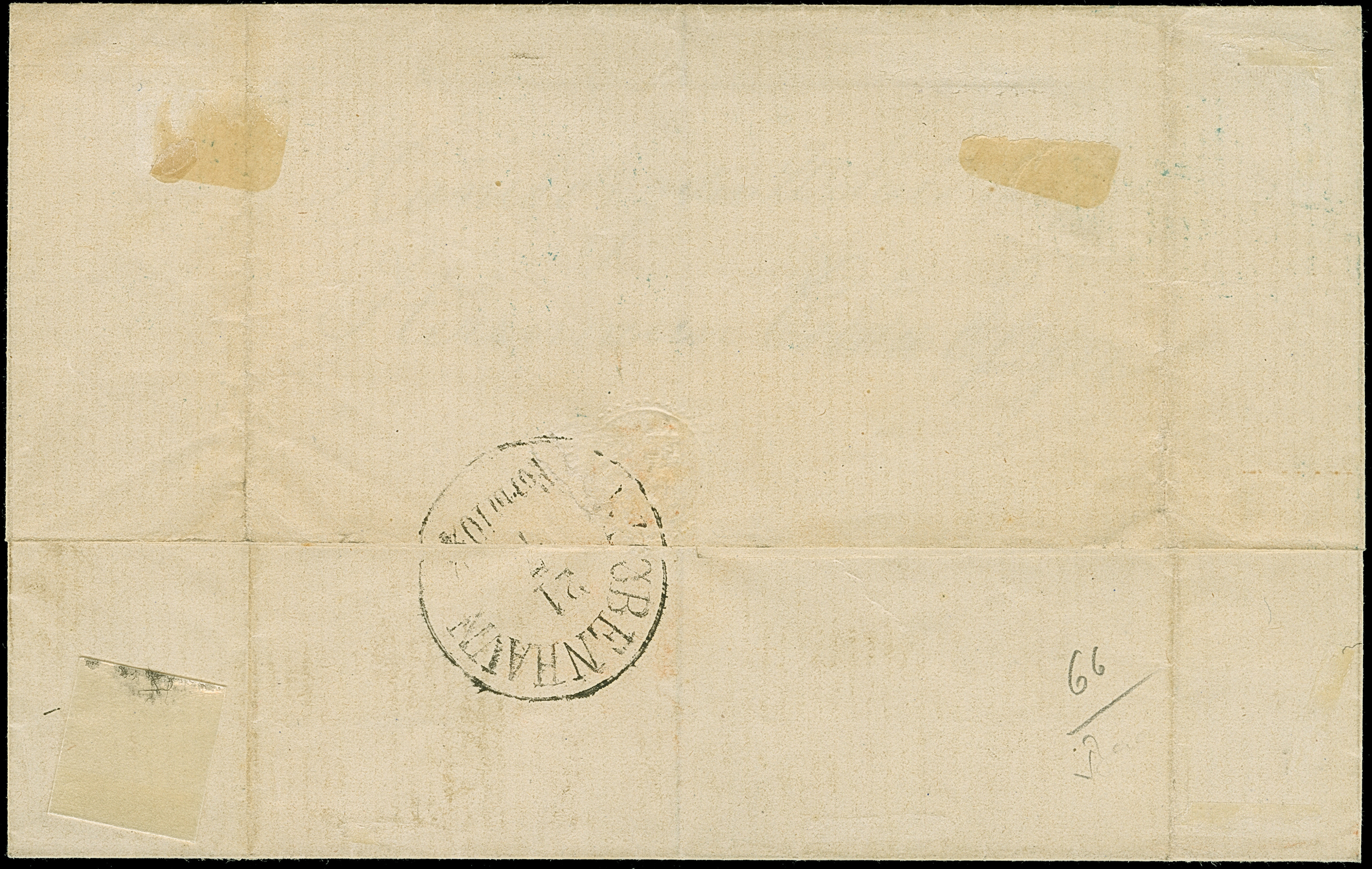 7 Sch. orange, drei Einzelwerte mit jeweils sauber aufgesetztem Strichstempel und nebengesetztem roten “HAMBURG P.D. NOV.14 1864” auf Briefhülle der 3. Gewichtsstufe der bekannten 'Wüstenkopf'-Korrespondenz nach London, mit vorderseitigem Ankunftsstempel. Leichte Beförderungsspuren und etwas gereinigt. Ein äußerst seltener Auslandsbrief; größte registrierte Mehrfachfrankatur dieser Marke und als solche Unikat.
