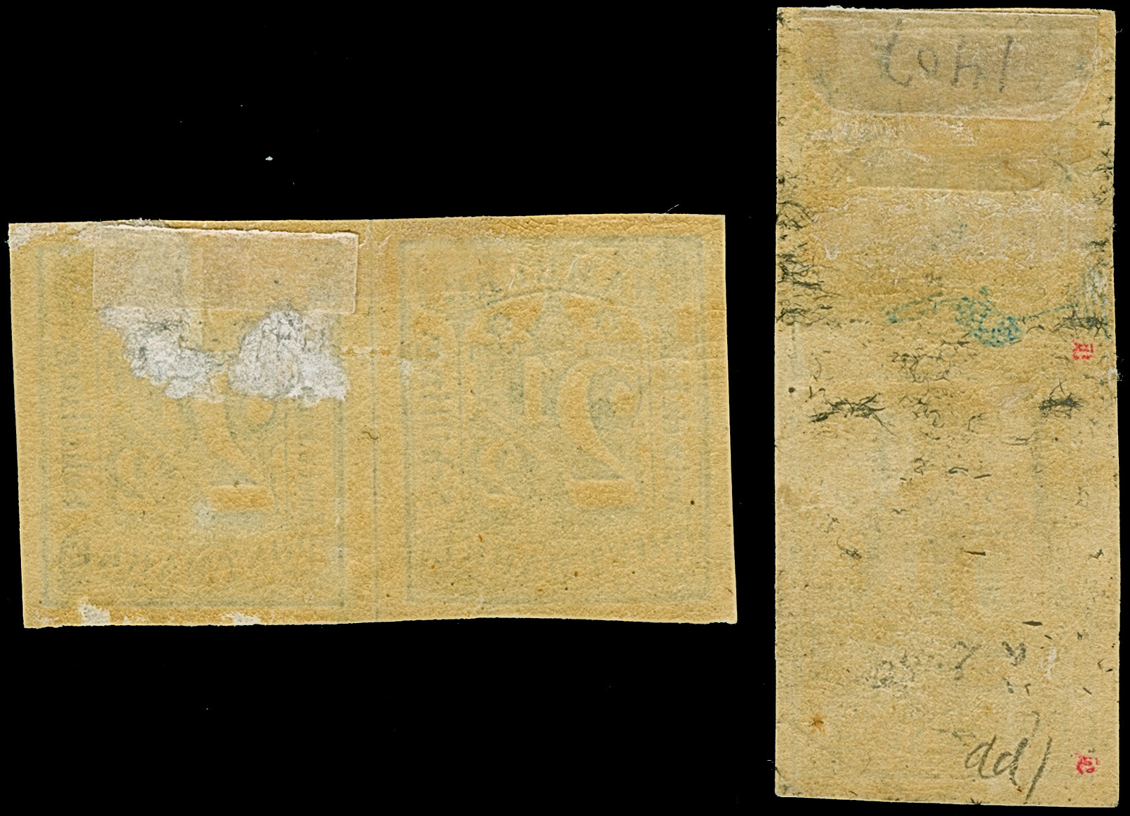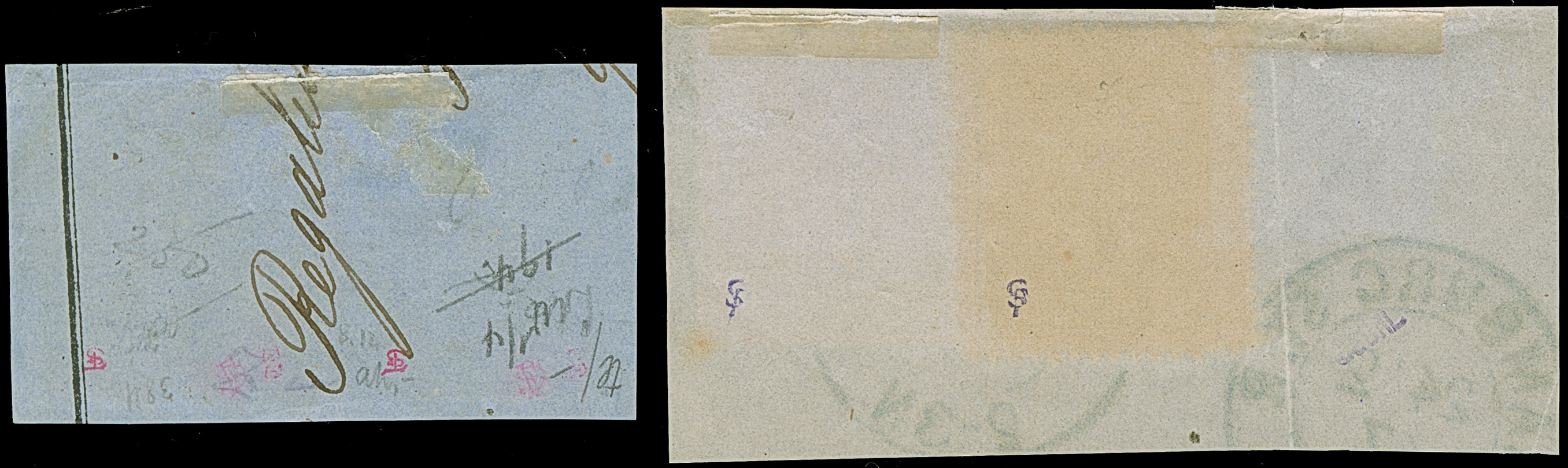 braun bzw. 4 Sch. grün, auf zwei Briefstücken.