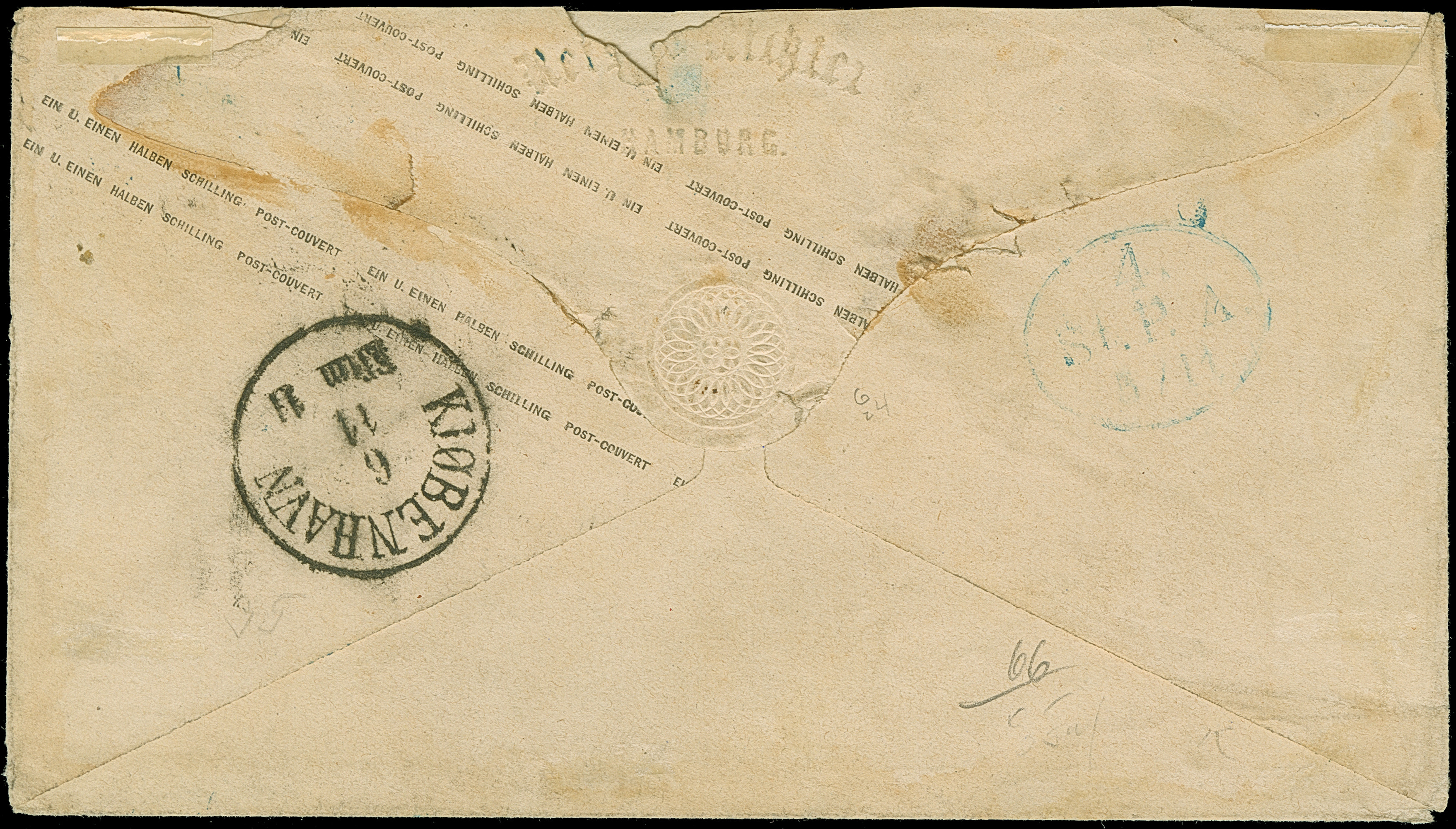 Umschlag 1½ Sch. mit Zufrankatur 1 Sch. braun, mit blauem Strichstempel und nebengesetztem DKr. "HAMBURG ST. P. 5/11 67" nach Kopenhagen, mit Ankunftsstempel. Umschlag etwas unfrisch, die Verschlussklappe etwas fehlerhaft. Eine seltene Kombination; PROFI hat nur eine weitere solche registriert.