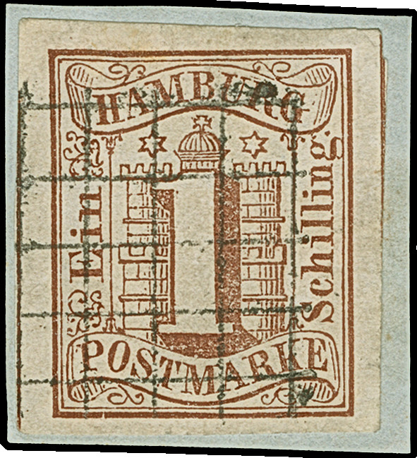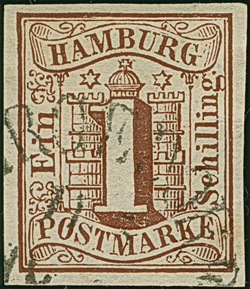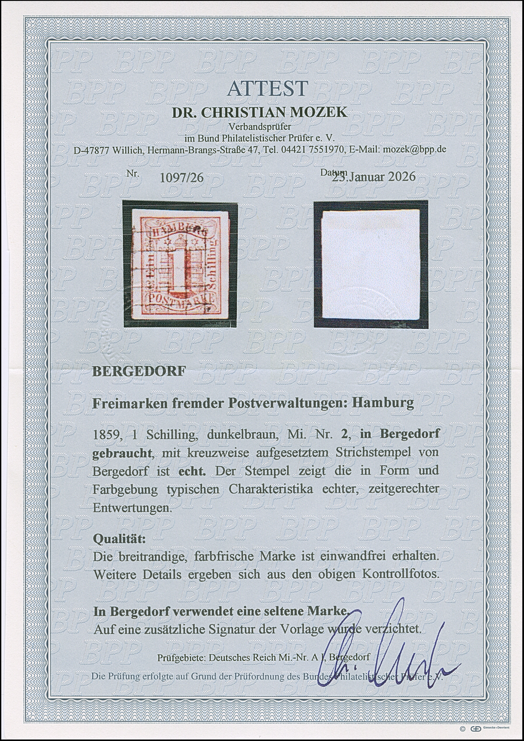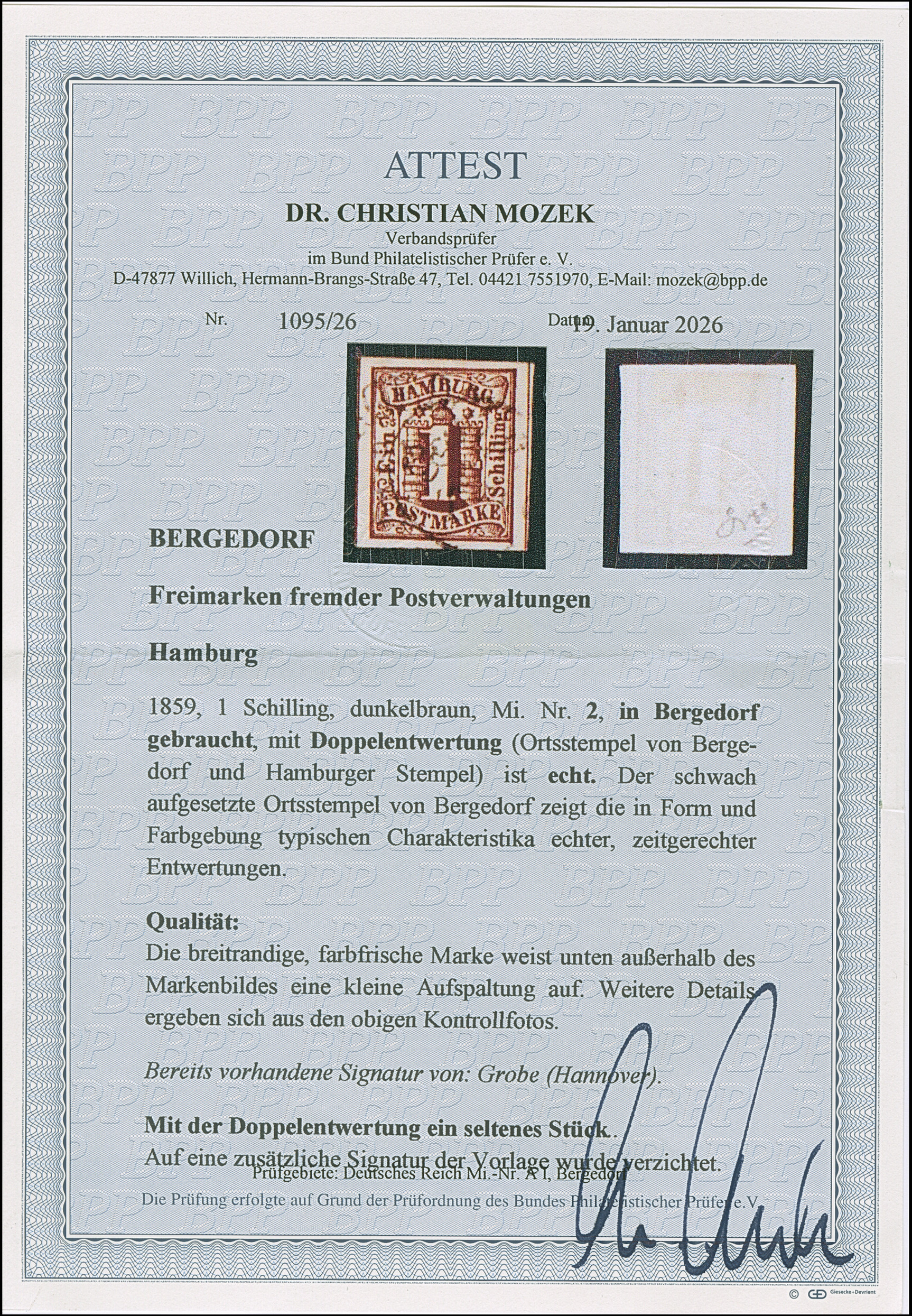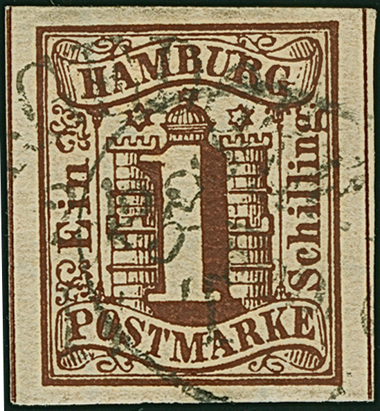 1 Sch. braun, voll- bis breitrandig mit Doppelentwertung durch Ortsstempel und Hamburger Ovalstempel. Im Unterrandd kleinne Aufspaltung außerhalb des Markenbildees, sonst tadellos. Fotoattest Dr. Mozek BPP (2026)