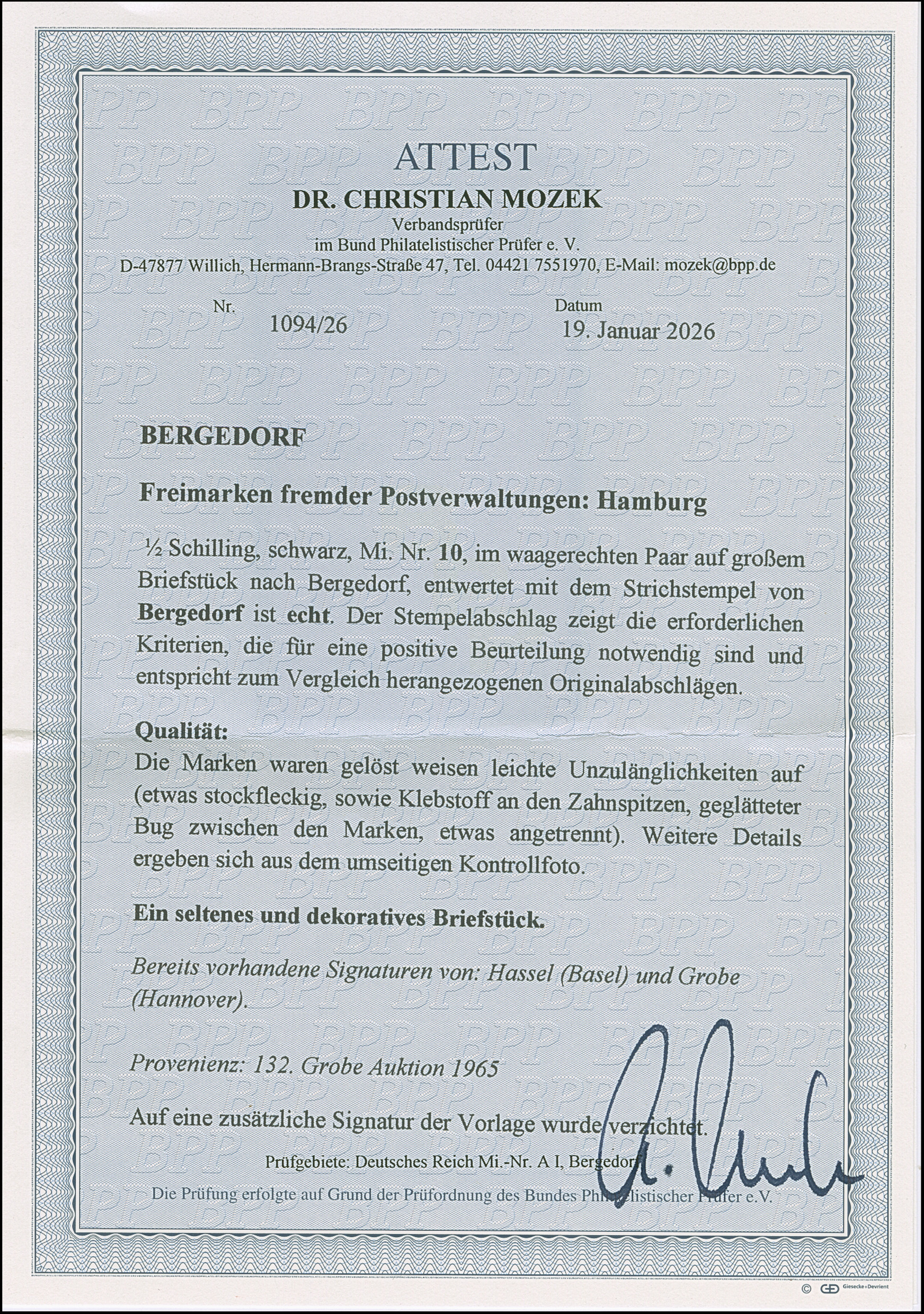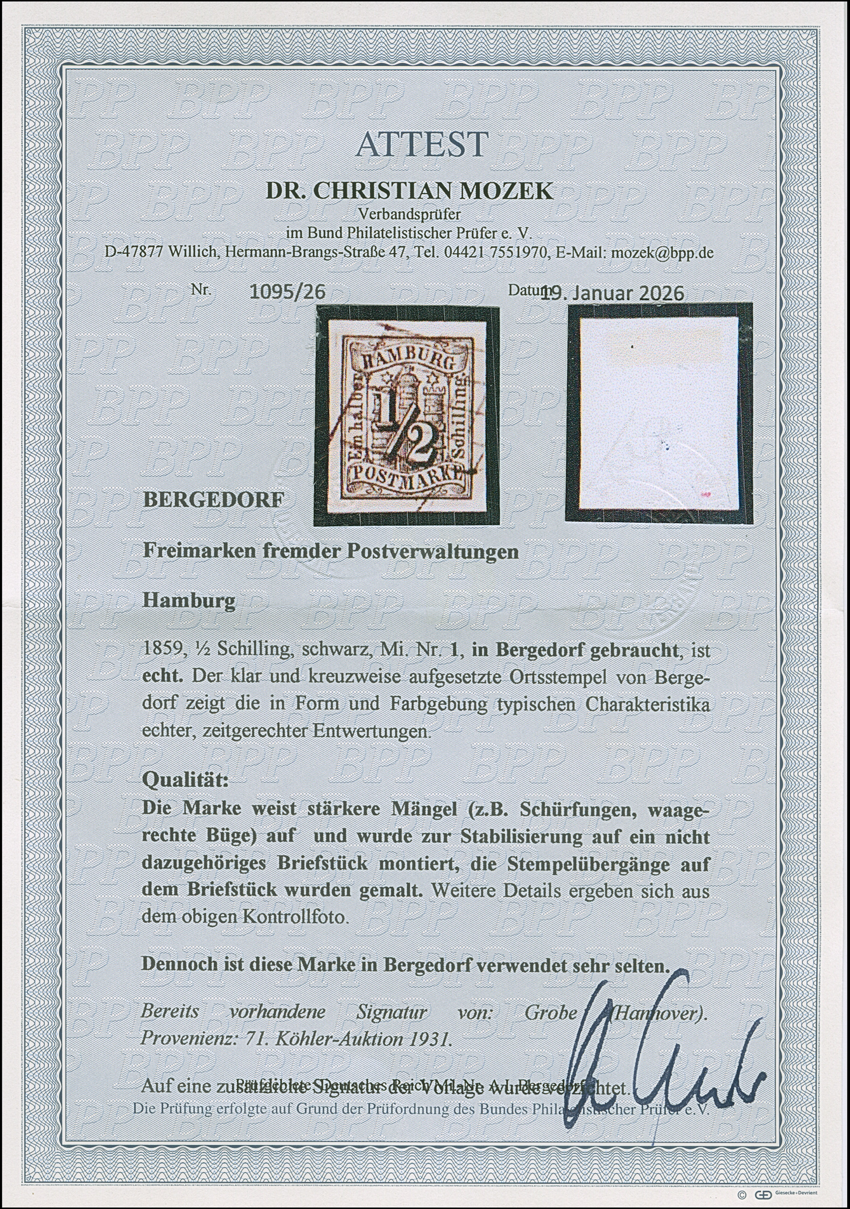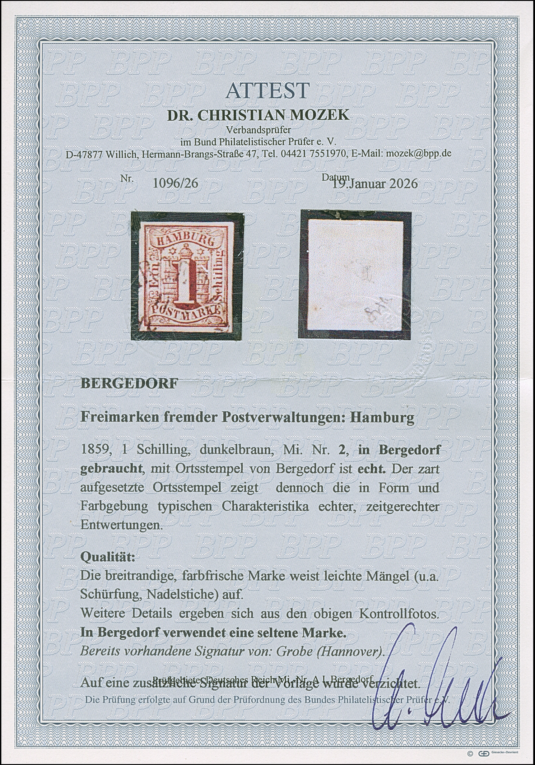 1 Sch. braun, voll- bis breitrandig mit Doppelentwertung durch Ortsstempel und Hamburger Ovalstempel. Im Unterrandd kleinne Aufspaltung außerhalb des Markenbildees, sonst tadellos. Fotoattest Dr. Mozek BPP (2026)
