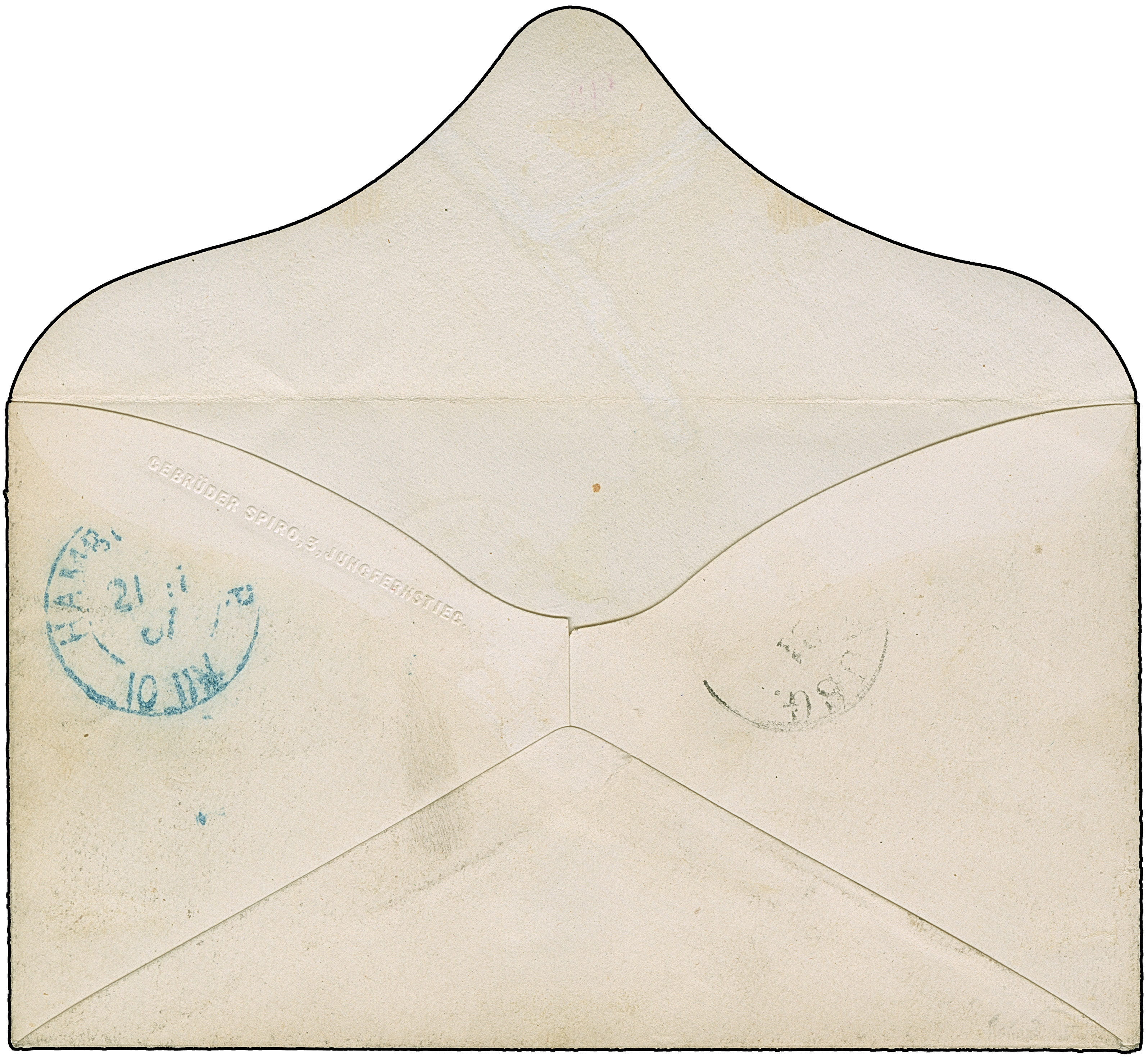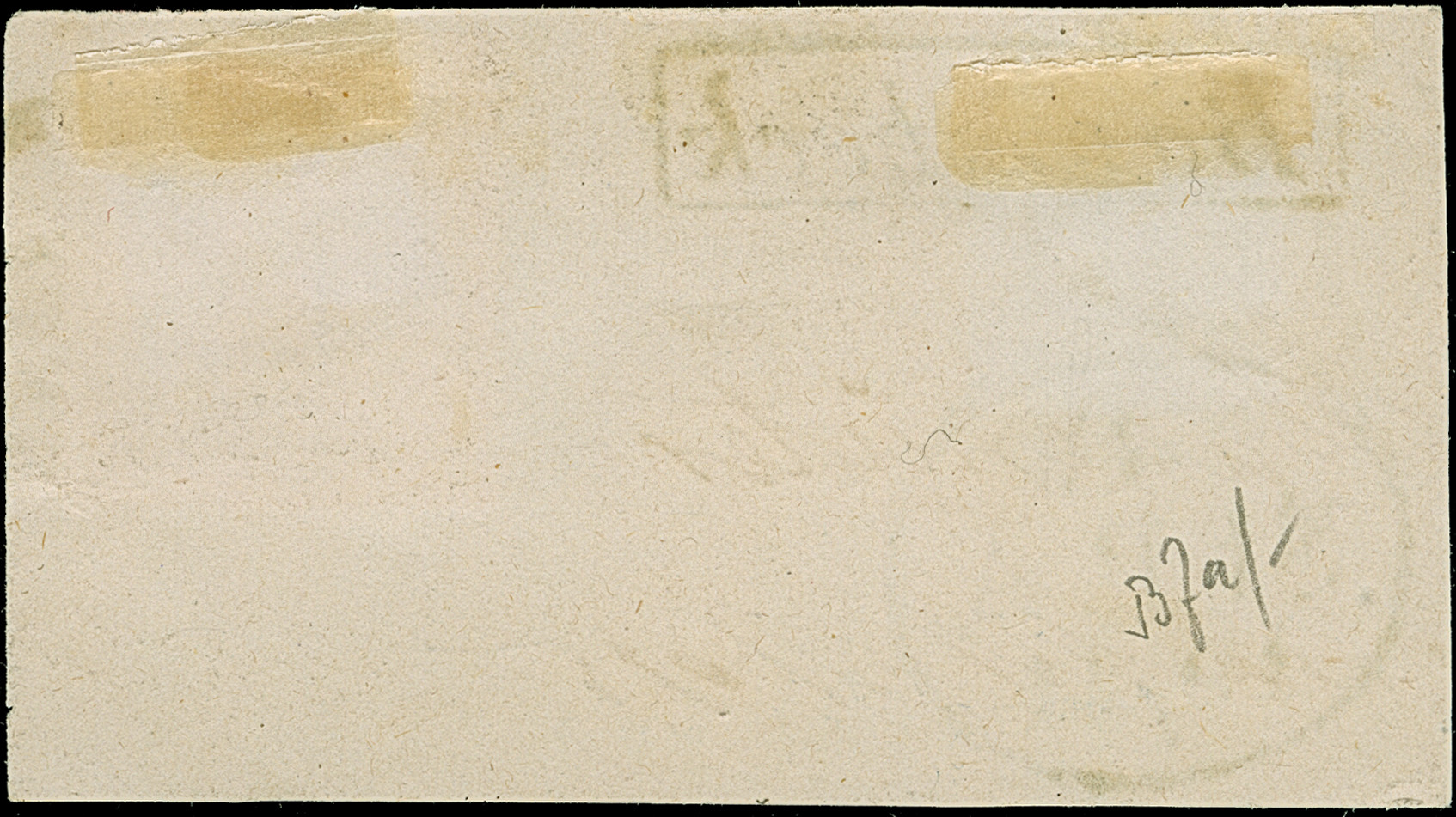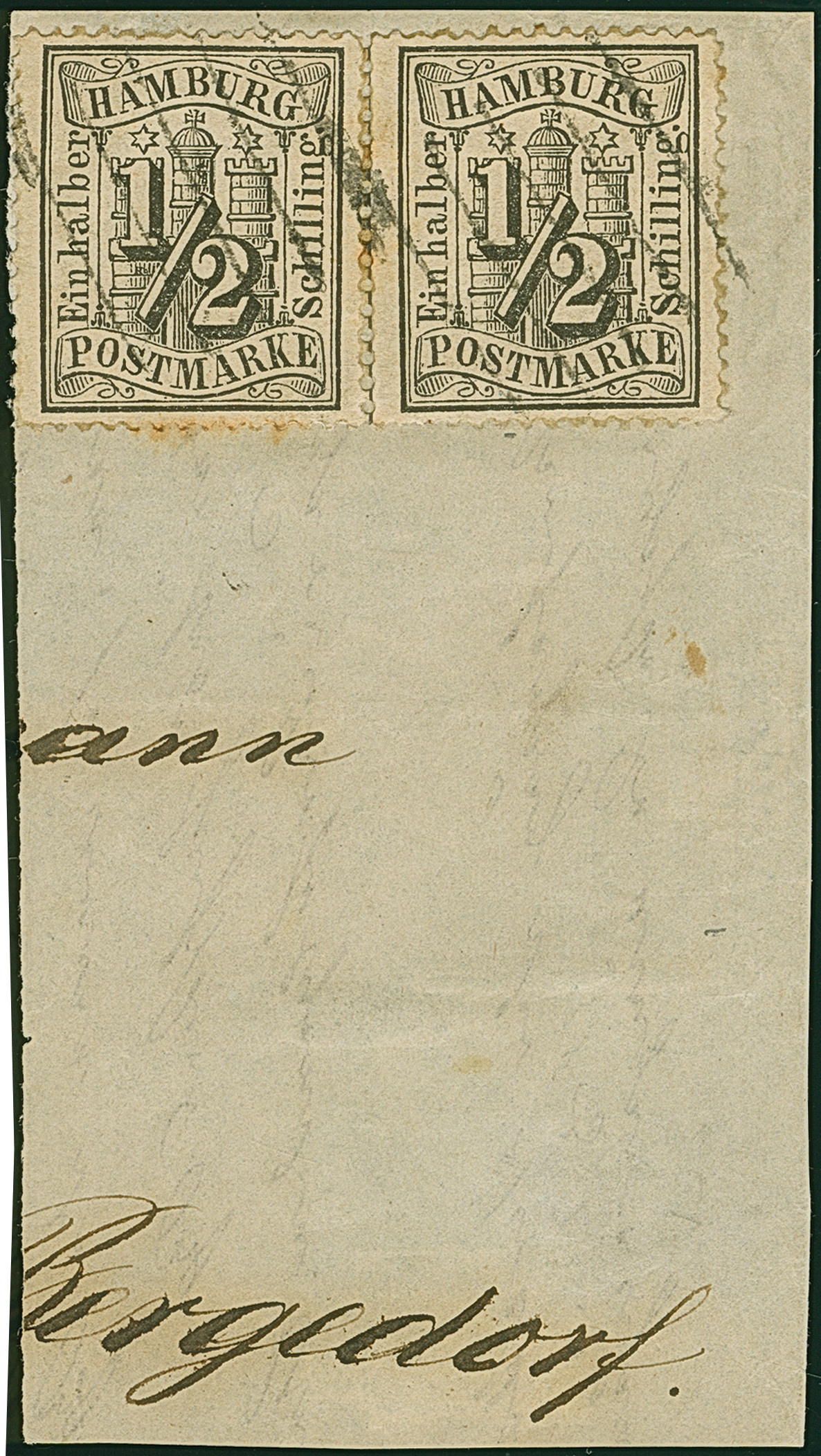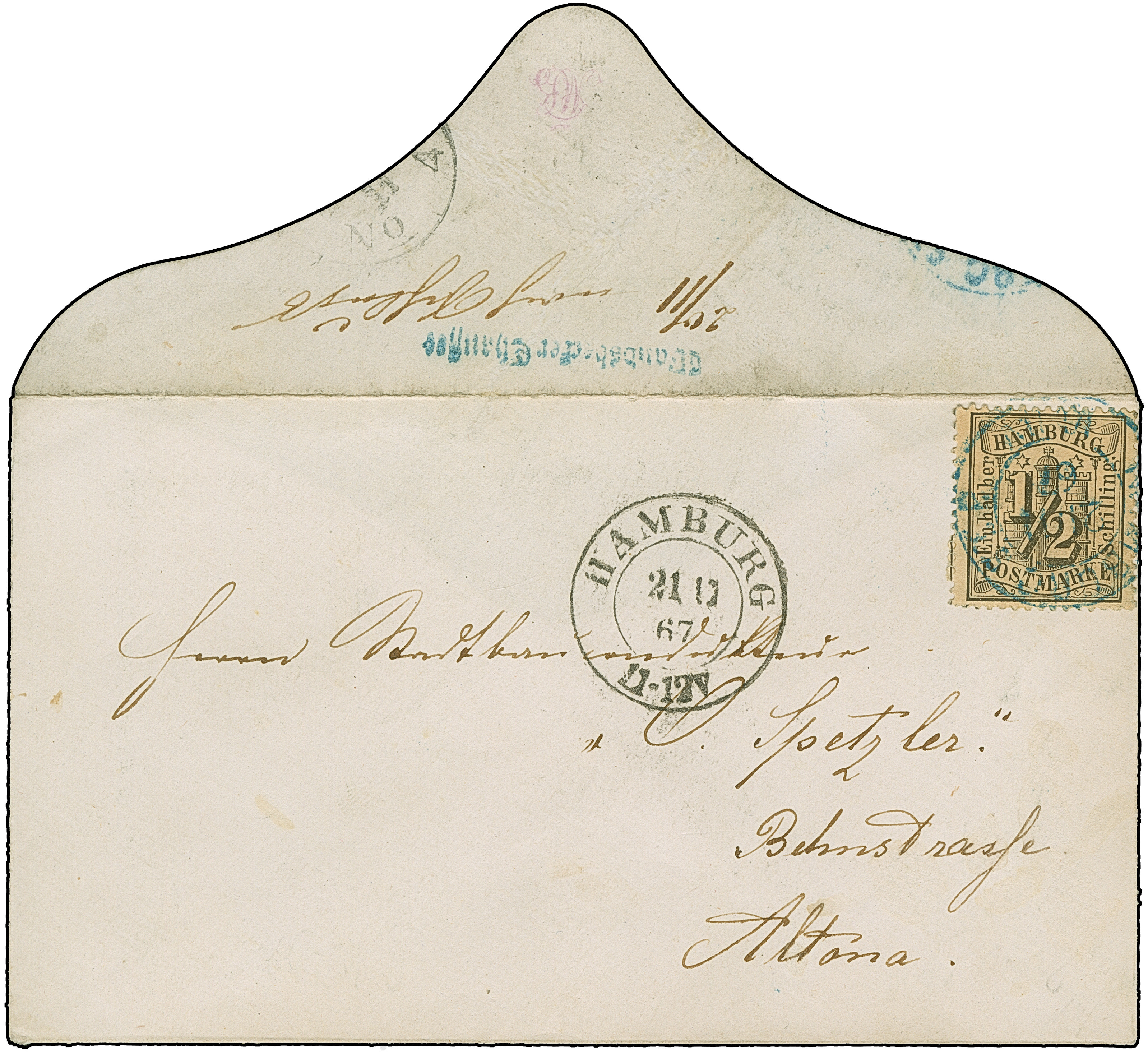 “Wandsbecker Chaussee”, kleiner blauer L1 mit handschriftlich zugefügten Datum “20/11” und “nach Schluss”, rückseitig auf Briefkuvert, frankiert mit ½ Sch. schwarz, farbfrisch und gut gezähnt, mit blauem DKr. "HAMBURG ST.P. 19.11.67" und nebengesetztem preußischen DKr. "HAMBURG 21 11 67", nach Altona. bei der rückseitigen Verschlussklappe ein kleiner Teil ergänzt und Einriss geschlossen, dabei der Stempel an einer Stelle winzig retuschiert. Die wohl größte Stempel-Seltenheit von Hamburg; PROFI hat nur zwei weitere Belege registriert.