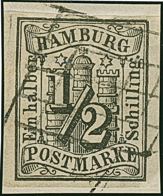 "2/12 HAMBURG 5-6 Nm", Hinrichsen-Maschinenstempel mit 2 parallelen Wellenlinien, klarer und vollständiger Abschlag auf ½ Schilling schwarz auf Briefstück. Eine große Stempel-Seltenheit; PROFI hat nur einen Brief, eine Vorderseite und ein weiteres Briefstück mit vollständigem Abschlag dieses versuchsweise vom 2. bis 9.12.1867 eingesetzten Stempels registriert.
