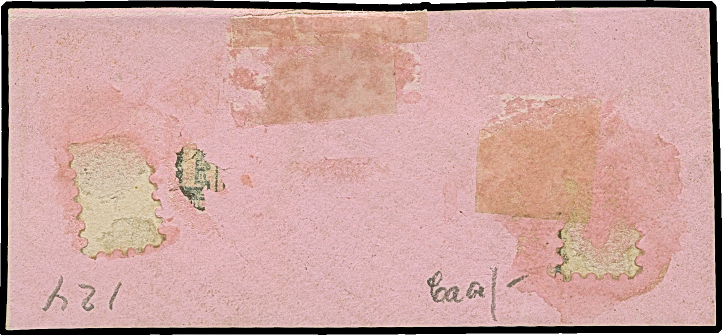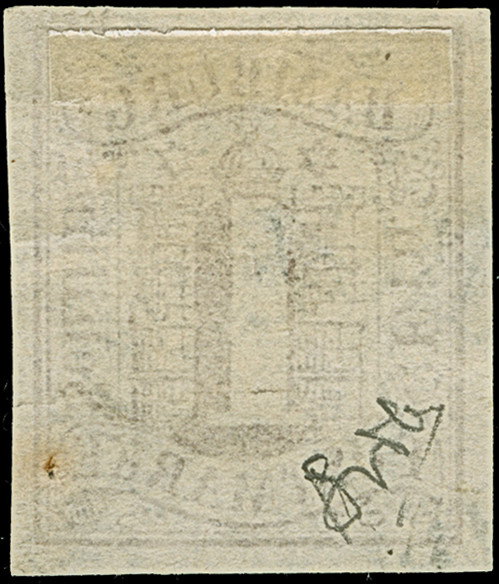 ½ Sch. schwarz, voll-bis breitrandig mit kreuzweise aufgesetzten Strichstempel. Fehlerhaft, auf kleines Briefstück montiert. Fotoattest Dr. Mozek BPP (2026)
