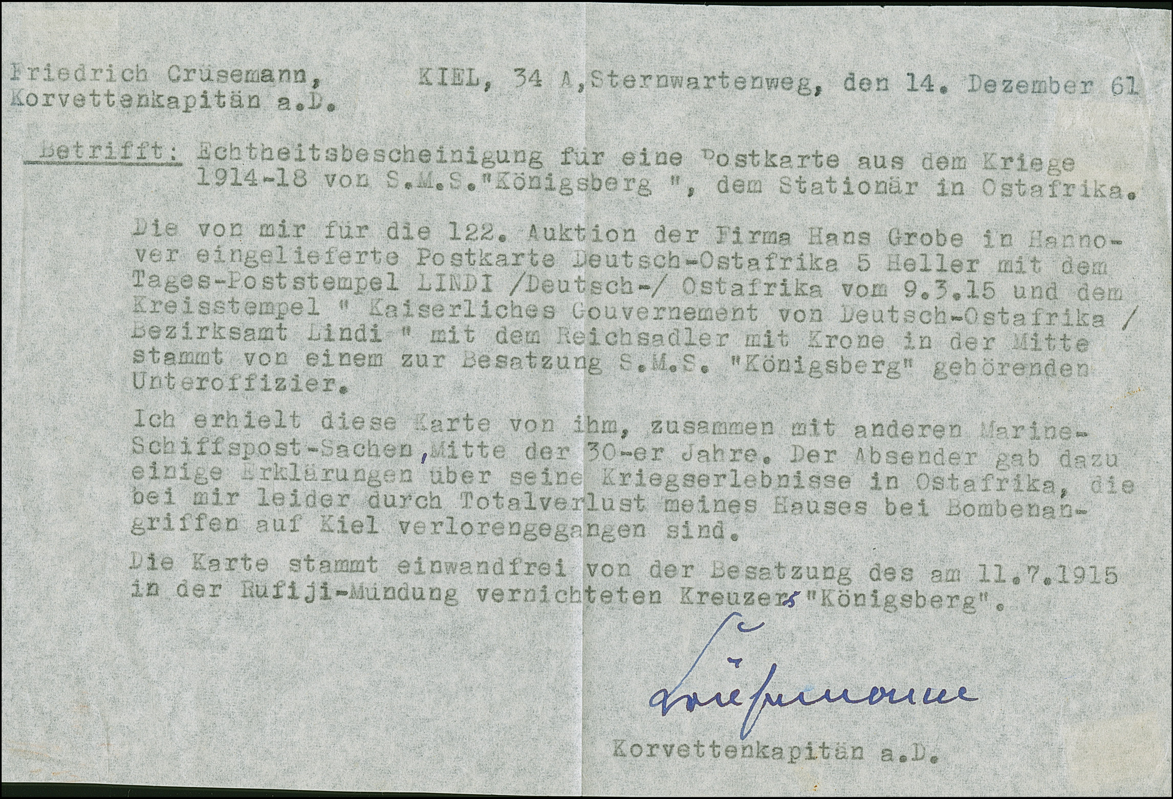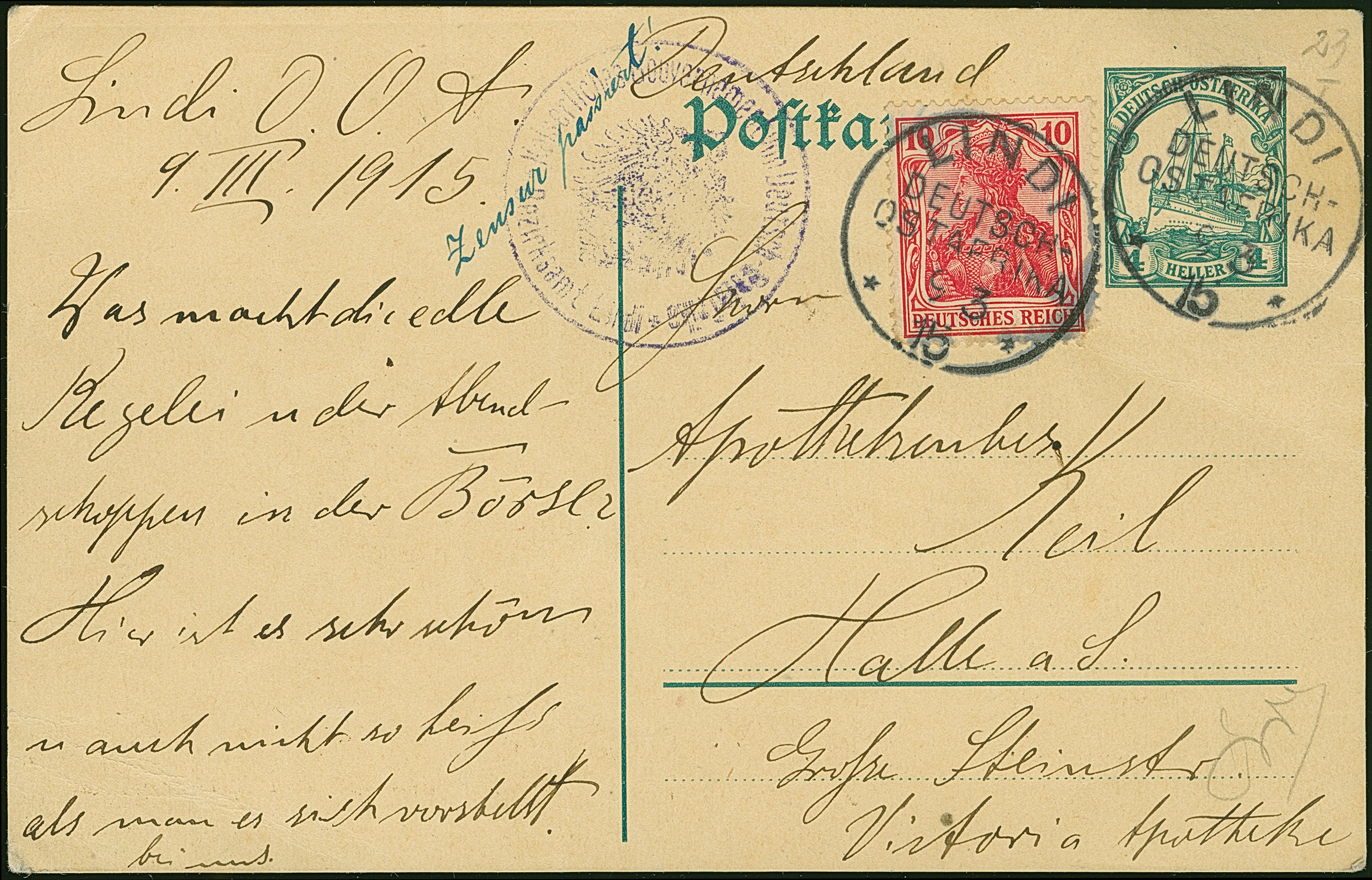 1915, Ganzsachenkarte 4 H. mit unötiger Zufrankatur Germania 10 Pfg. jeweils mit Stempel “LINDI DOA 9.3.15” und viel Text sowie Zensurstempel “Kaiserliches Gouvernement von Deutsch-Ostafrika Bezirksamt Lindi” und handschriftlichem Vermerk “Zensur passiert” nach Halle. Die Marke mit kleinem Eckfehler, ansonsten ist die Karte in guter Erhaltung. Der Schreiber war Unteroffizier der SMS Königsberg. Eine dekorative Karte mit sehr seltener Zensur, mit Echtheitsbescheinigung F. Crüsemann (1961)