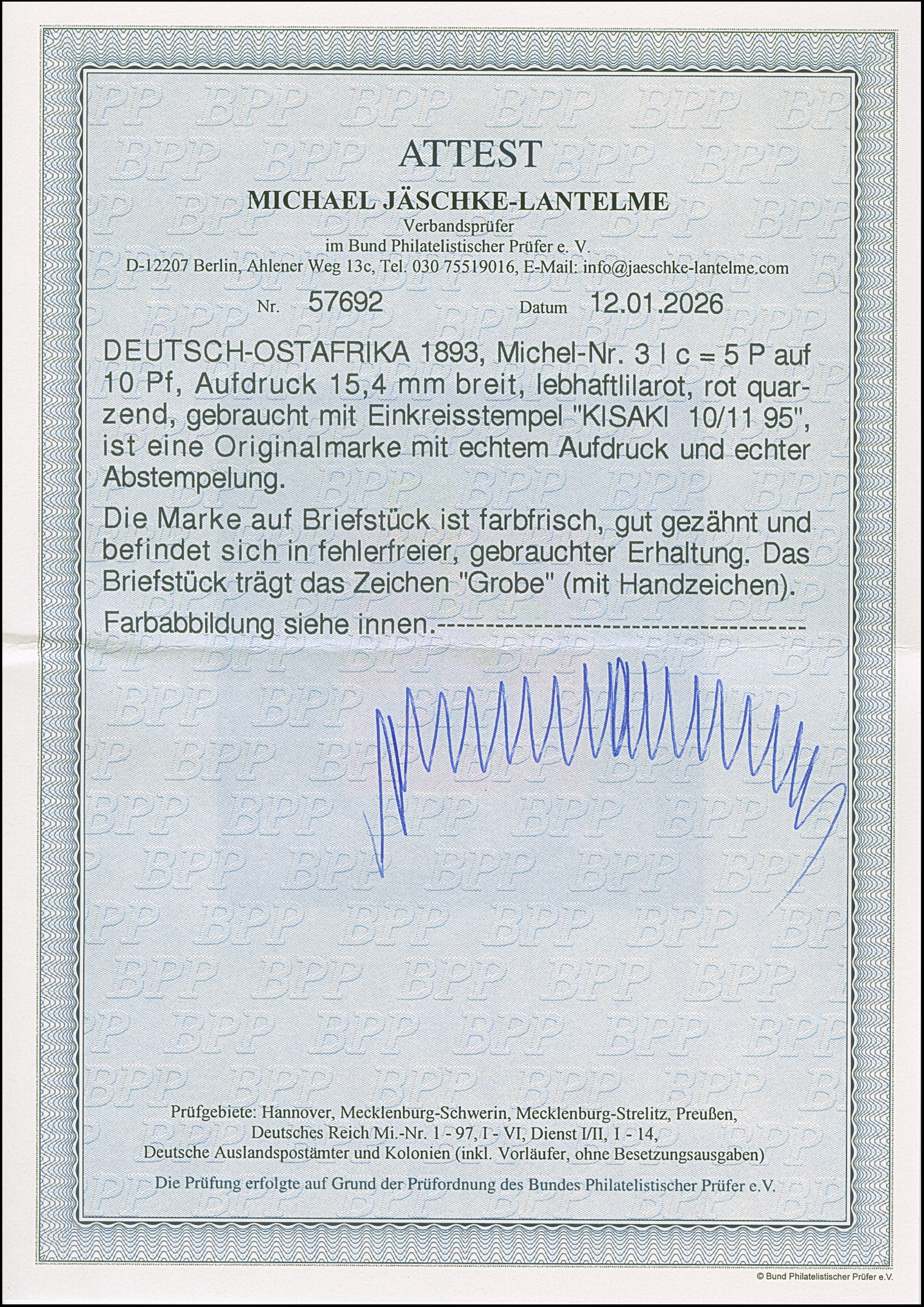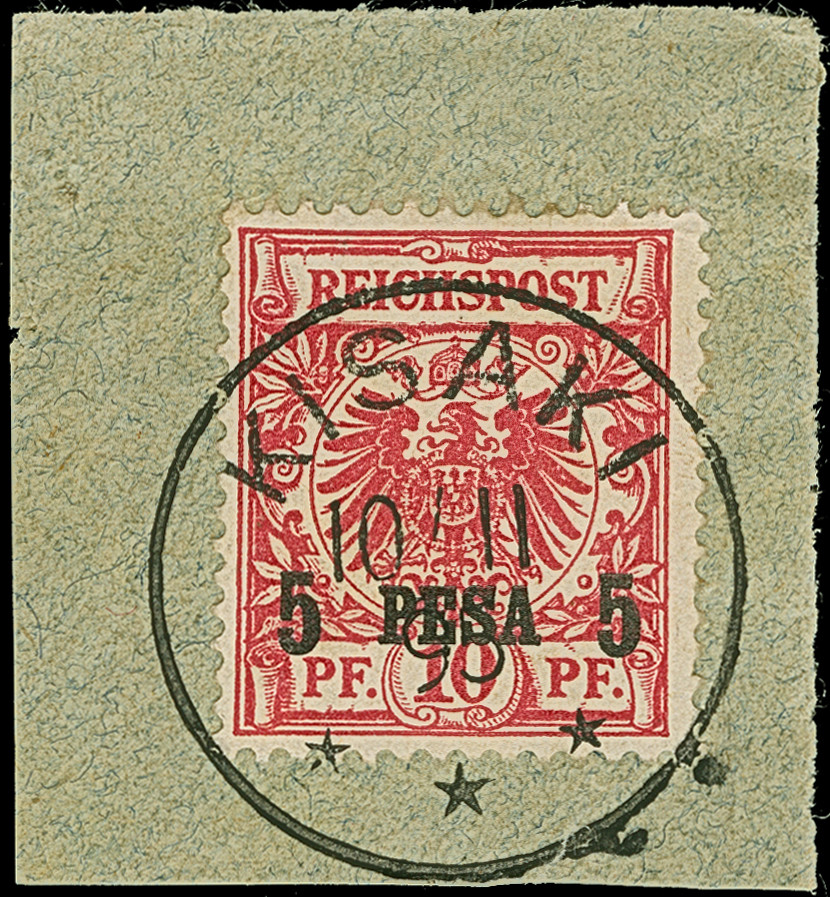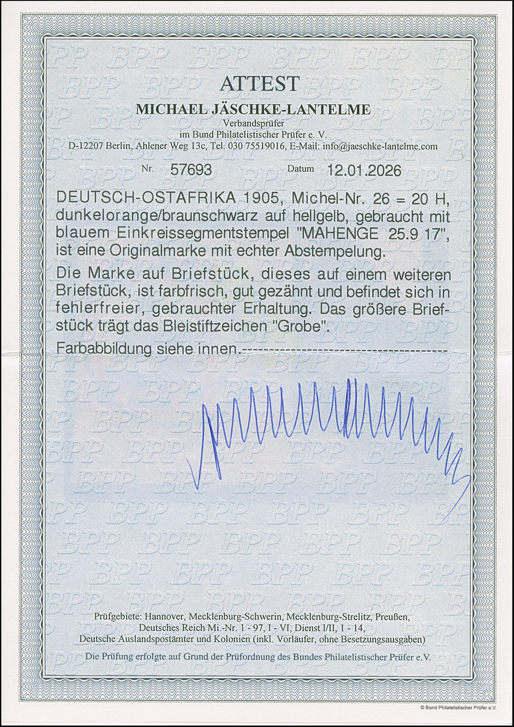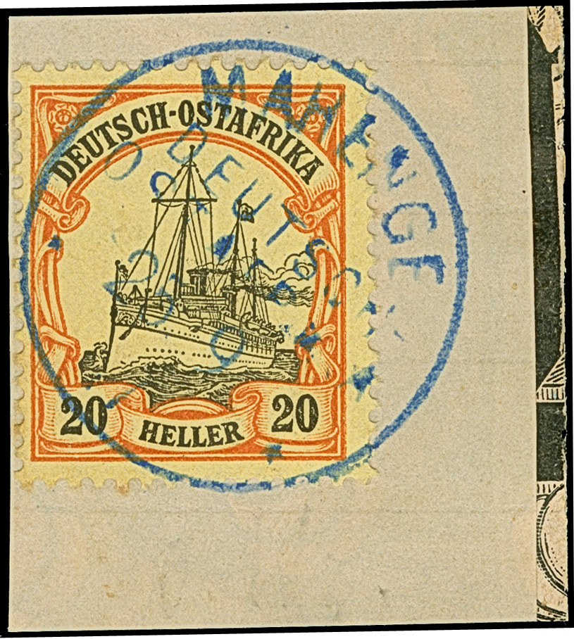 "MAHENGE 25.9.17" in blau, sauber abgeschlagen auf 25 Pfg. auf Briefstück. Einwandfrei. Auf Marken selten. Signiert Grobe und Fotoattest Jäschke-L. BPP (2026)