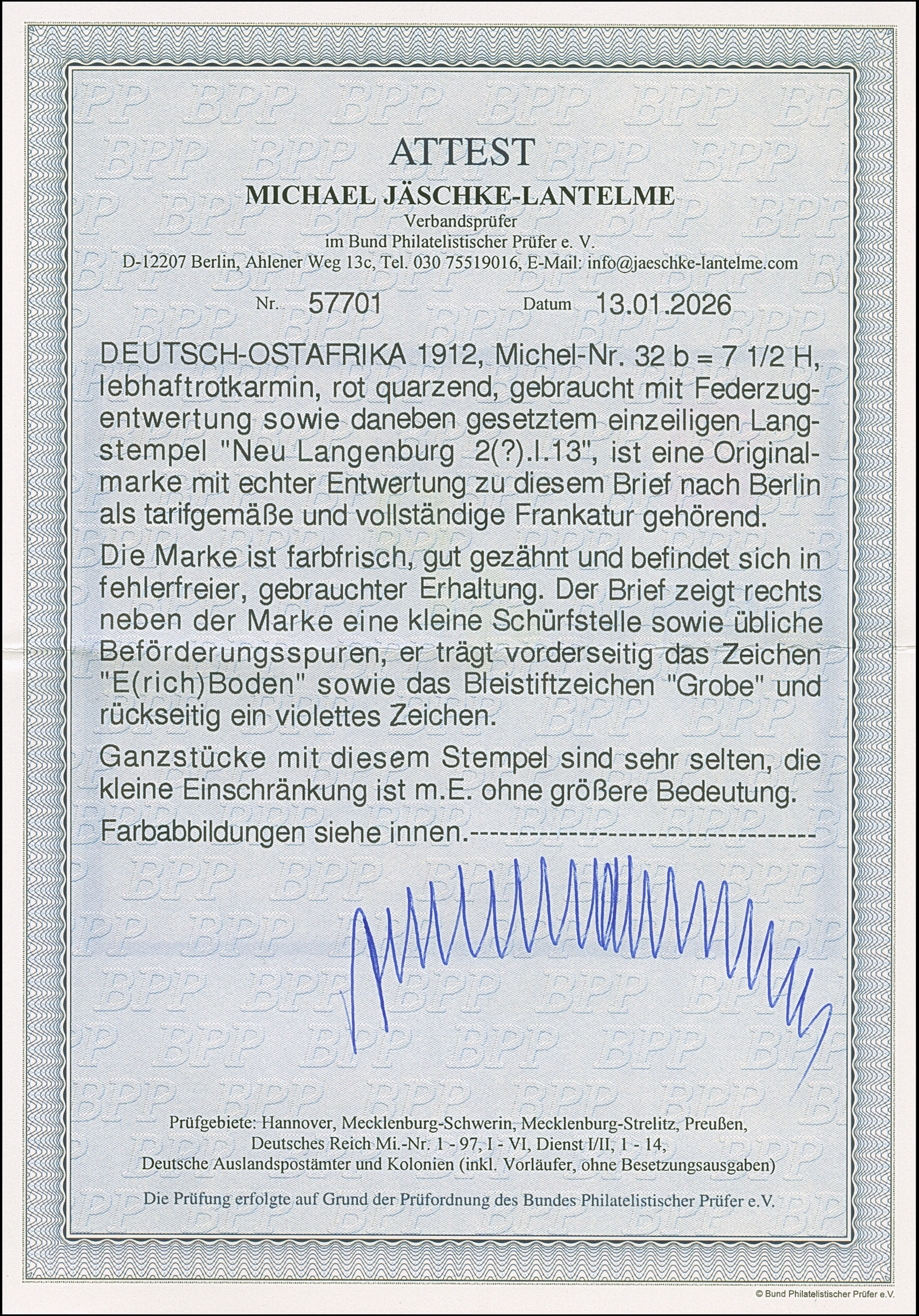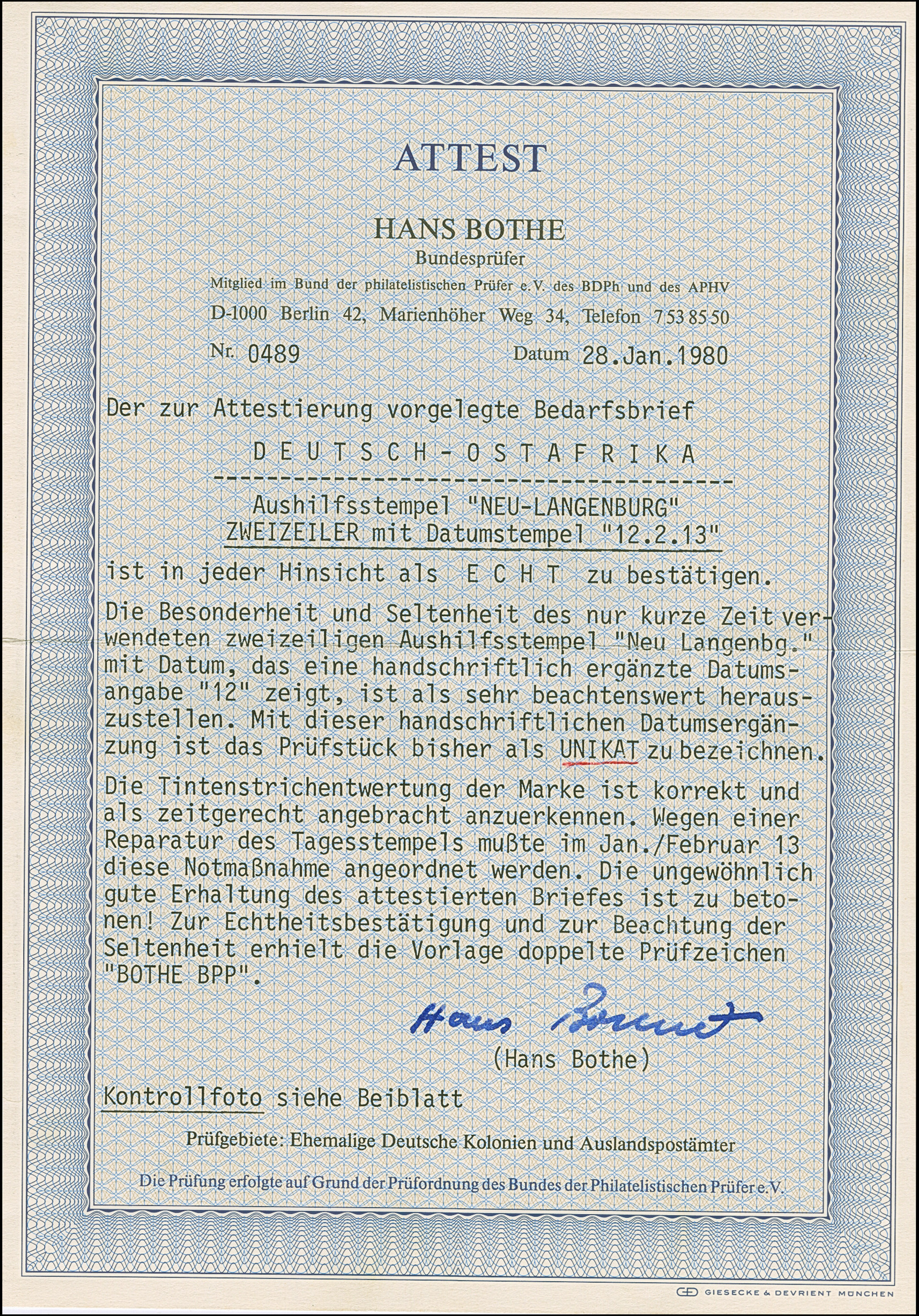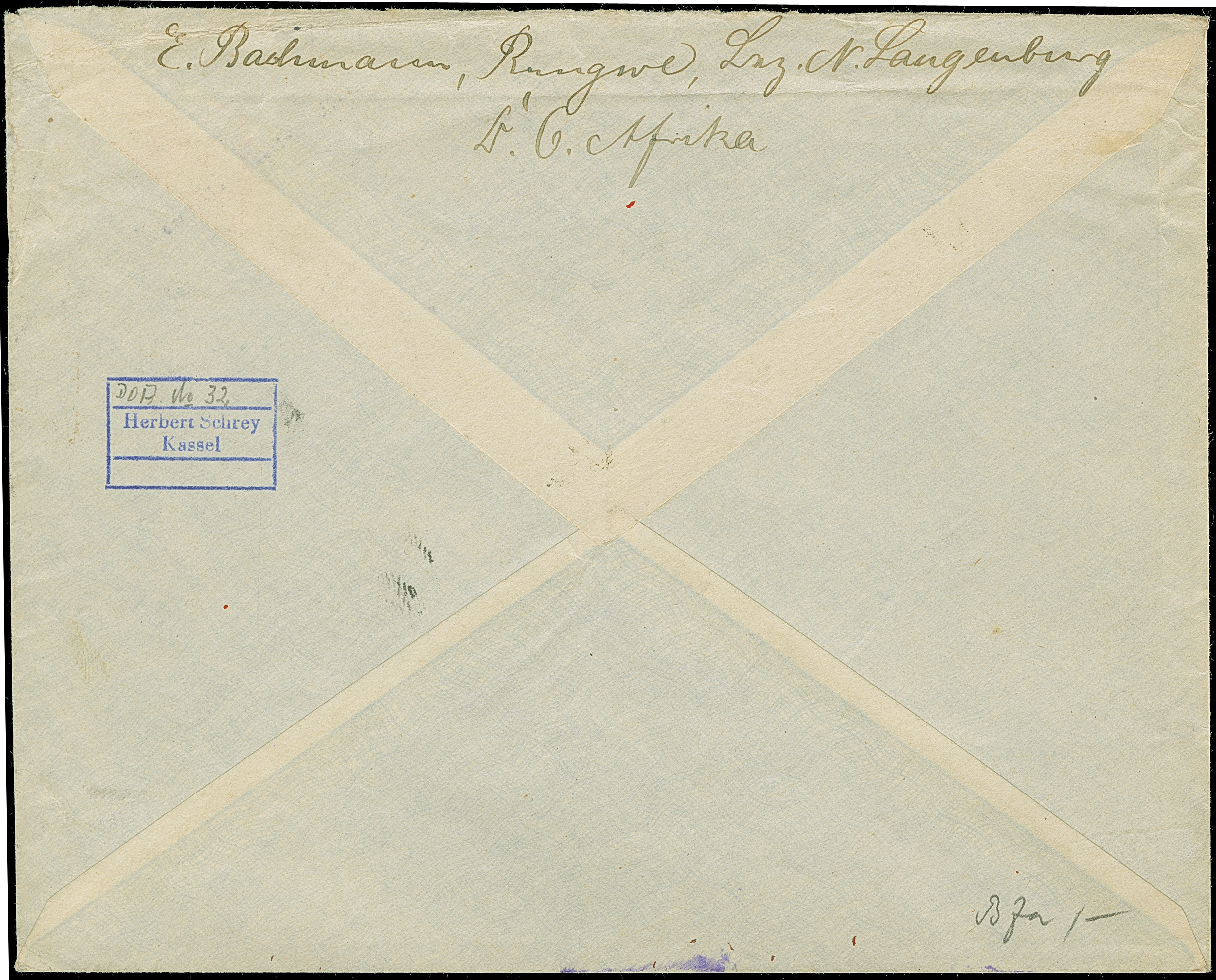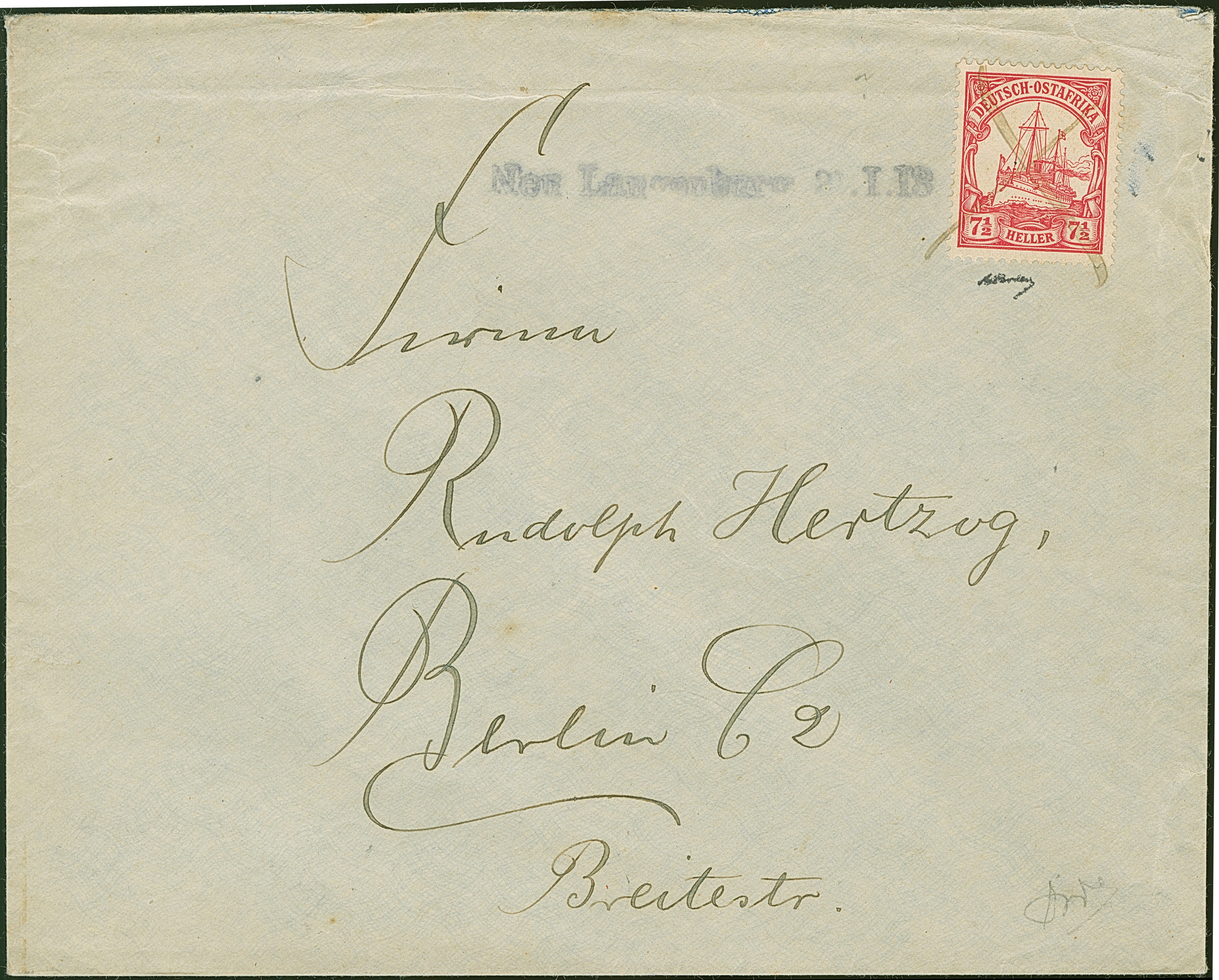 "Neu Langenburg 2(?).I.13" der einzeilige Notstempel, sauber nebengesetzt auf Briefkuvert, frankiert mit 7½ H., entwertet durch Federkreuz, mit rückseitiger Absenderangabe aus "Rungwe, Bez. N.Langenburg", an die bekannte Firma Rudolf Hertzog in Berlin. Ein schönes Bedarfsstück dieser großen Stempel-Seltenheit. Signiert Erich Boden und Grobe, Fotoattest Jäschke-L. BPP (2026)