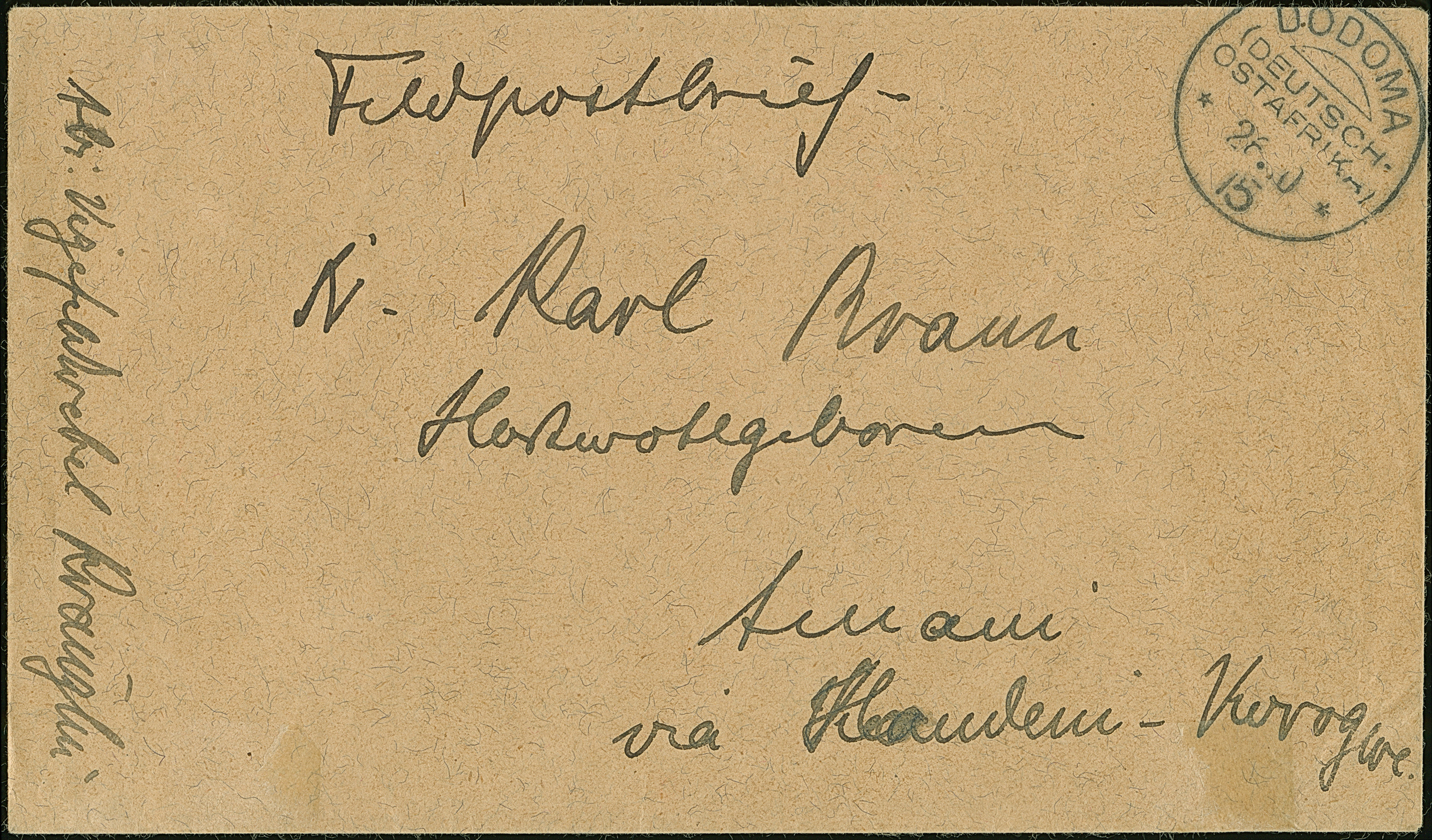 "DODOMA 26.10.15" (verwendet beim östlichen Restteil der Mittellandbahn) sauber auf Feldpostbrief nach "Amani via Handeni-Korogwe"