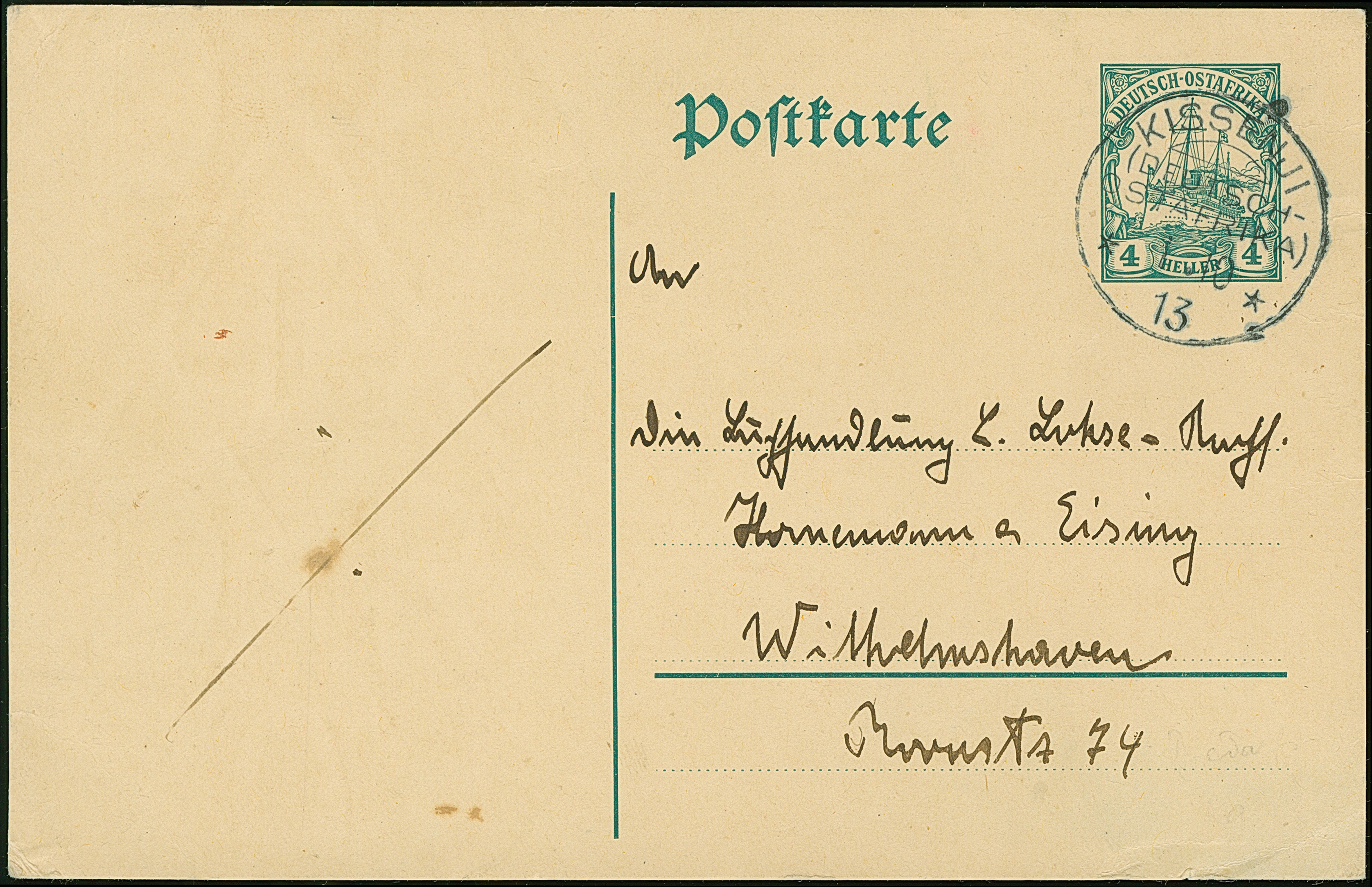 "KISSENJI 1.10 13" sauber Ganzsachenkarte 4 H. bedarfsgebraucht nach Wilhelmshaven. Rückseitig Schürfung (Adresse entfernt)