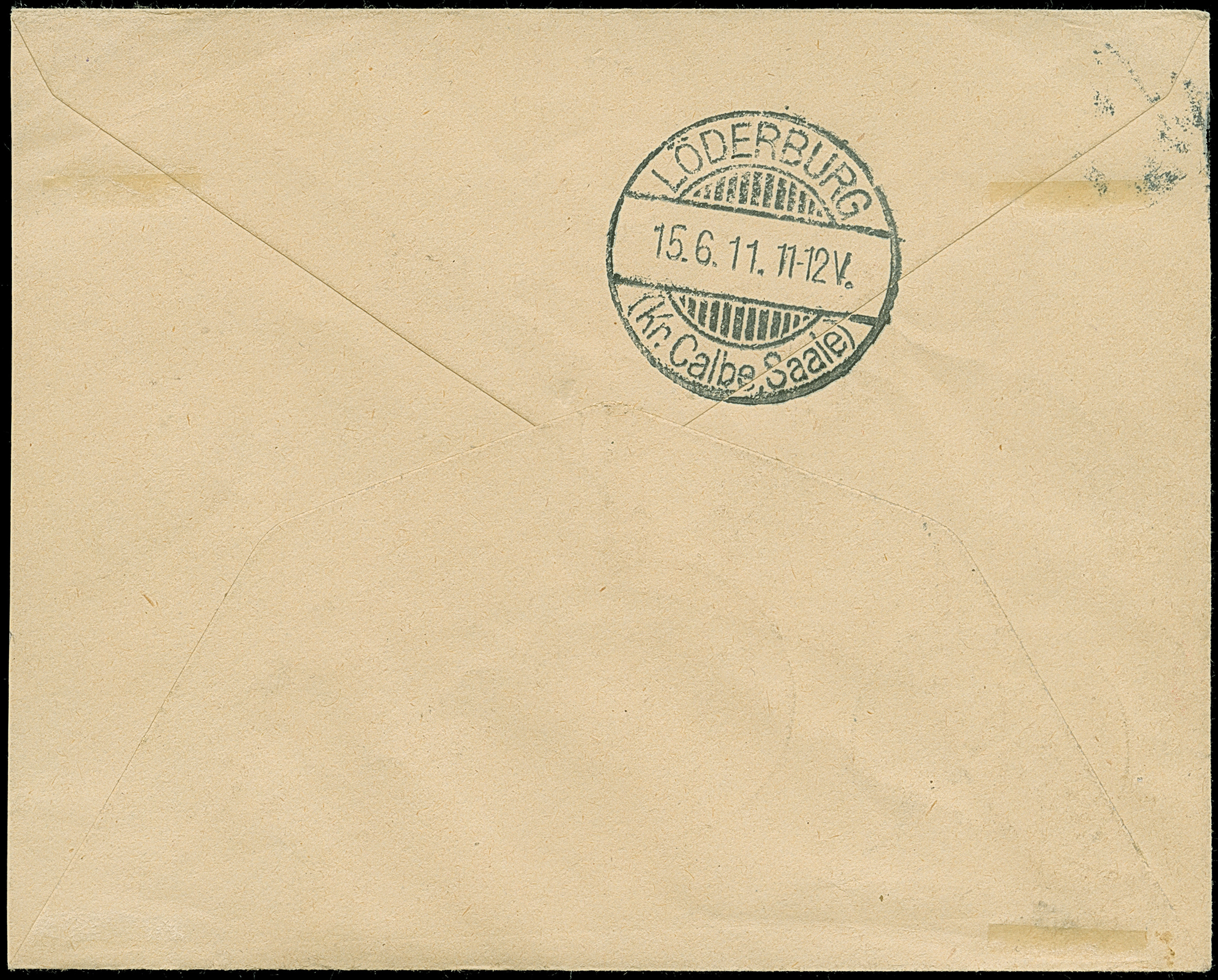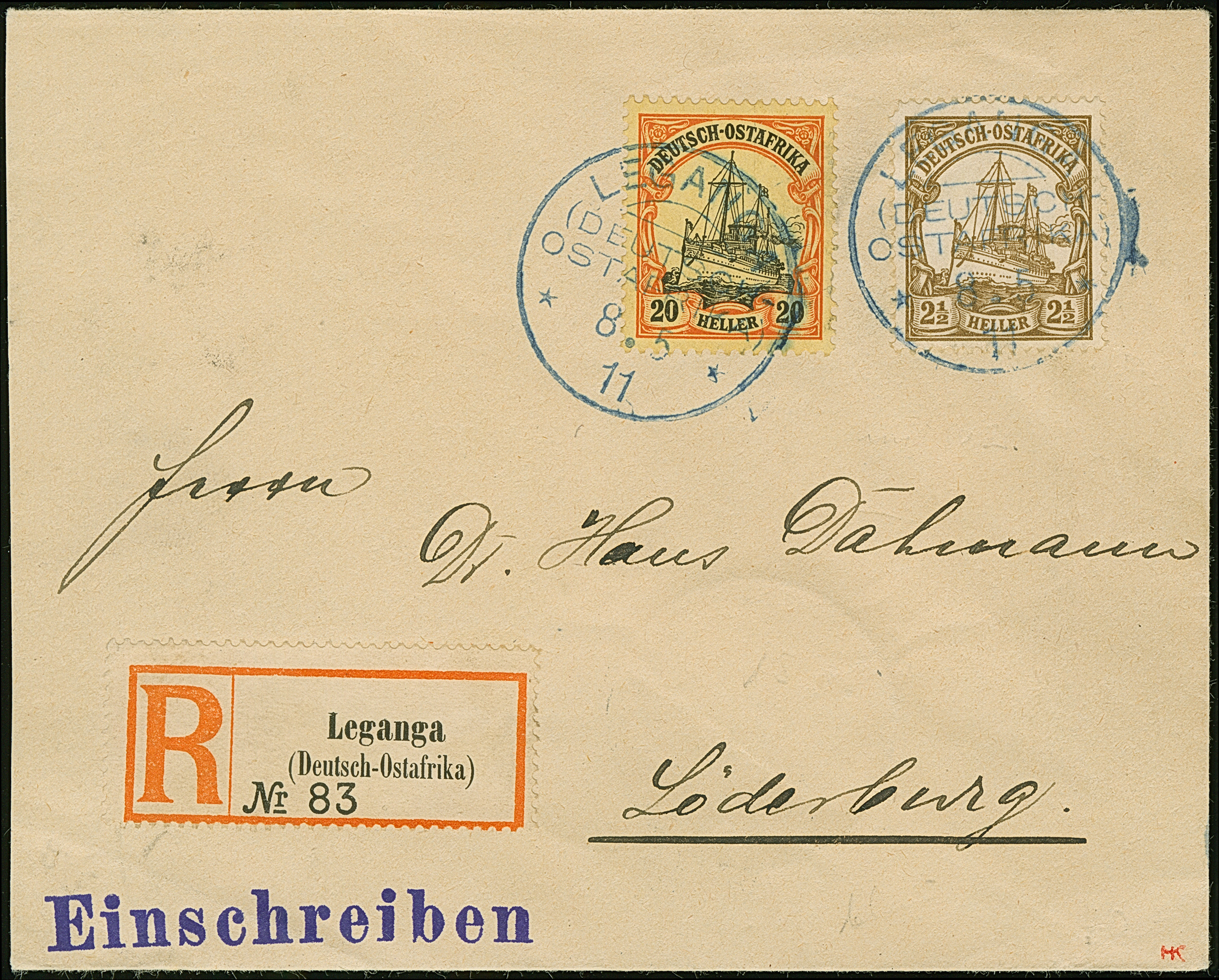 "LEGANGA 8.5 11" sauber auf 1905/20, 2½ H. auf kleinem R-Brief nach Löderburg mit Ankunftsstempel. 2½ H. kleiner Eckzahnfehler.