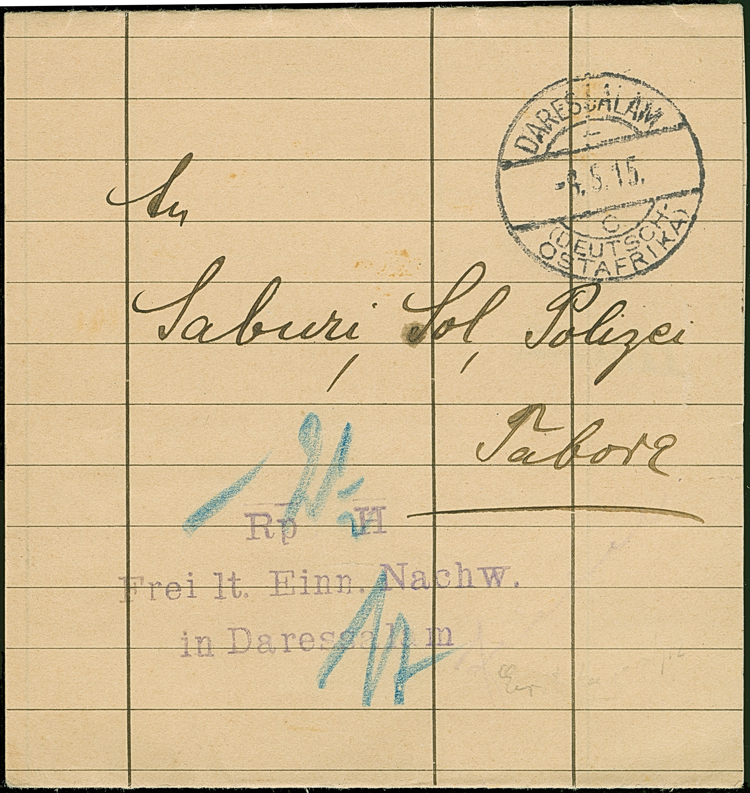 1915, “Rp (2½) H. Frei lt. Einn. Nachw. in Daressalam” violetter L4 klar auf Drucksachen-Streifband von “DARESSALAM (DOA) c 8.5.15” nach Tabora in einwandfreier Erhaltung. Eine interessante Verwendung des 2. Barfrankierungsstempels mit neuem Frühdatum
