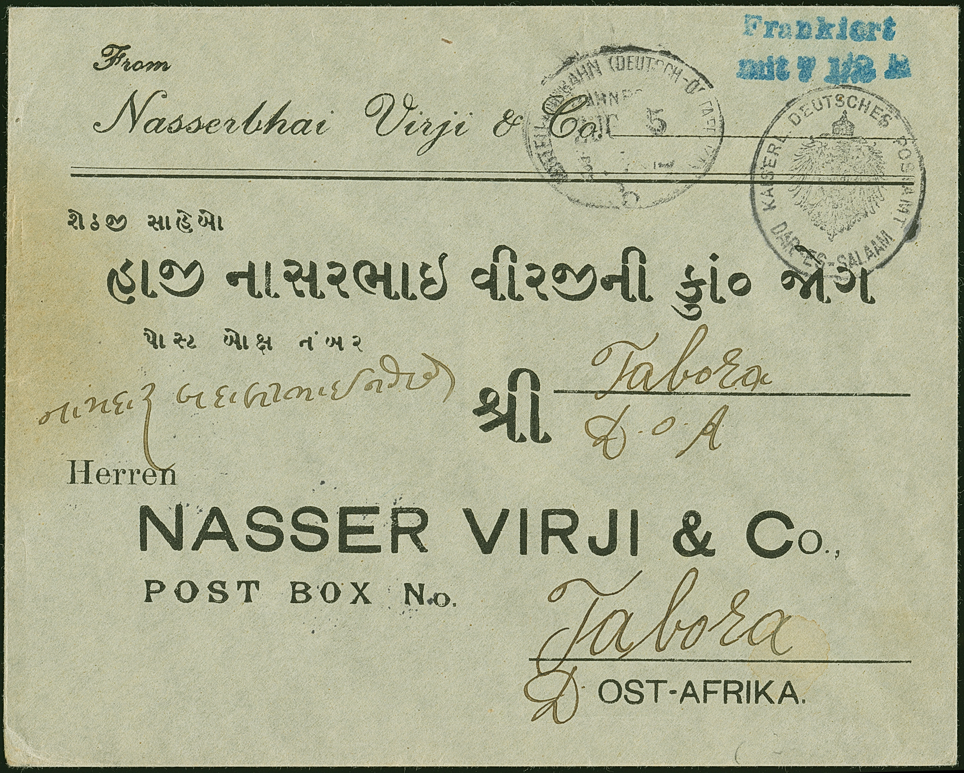 1915, “MITTELLANDBAHN (DOA) b ZUG 5 3.7.15” recht klar auf Privat-Ganzsachenumschlag “Nassenbhai Virji & Co.” mit blauem L2 “Frankiert mit 7½ H.” und Dienstsiegel von Daressalam nach Tabora mit Ankunftsstempel. Der Umschlag mit leichten Beförderungsspuren ist in guter Erhaltung