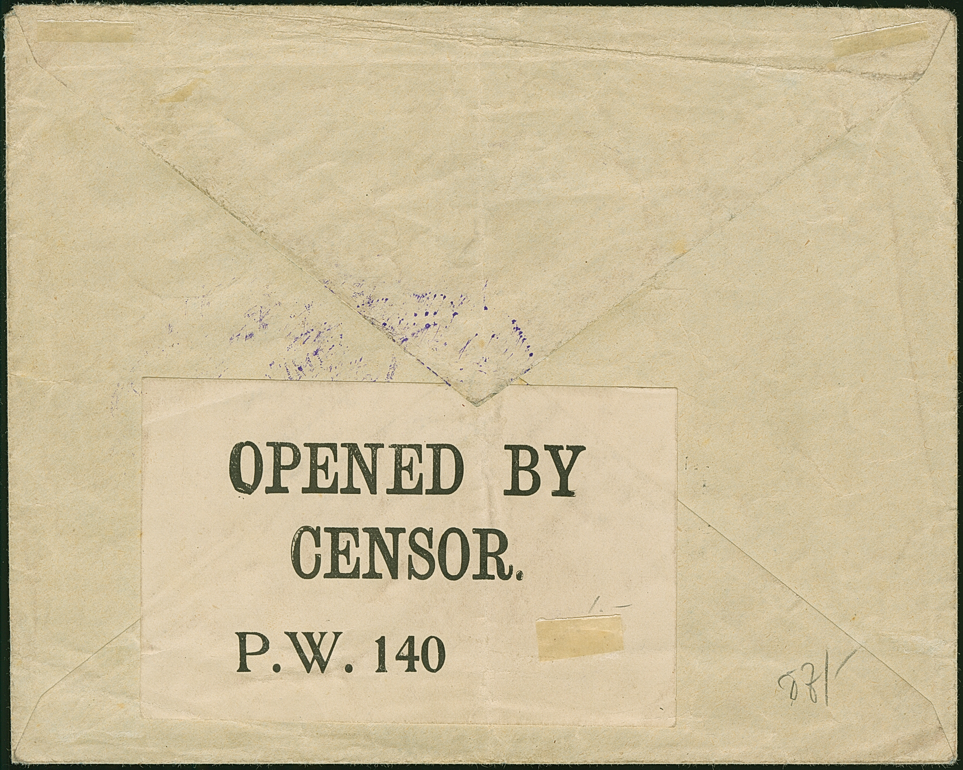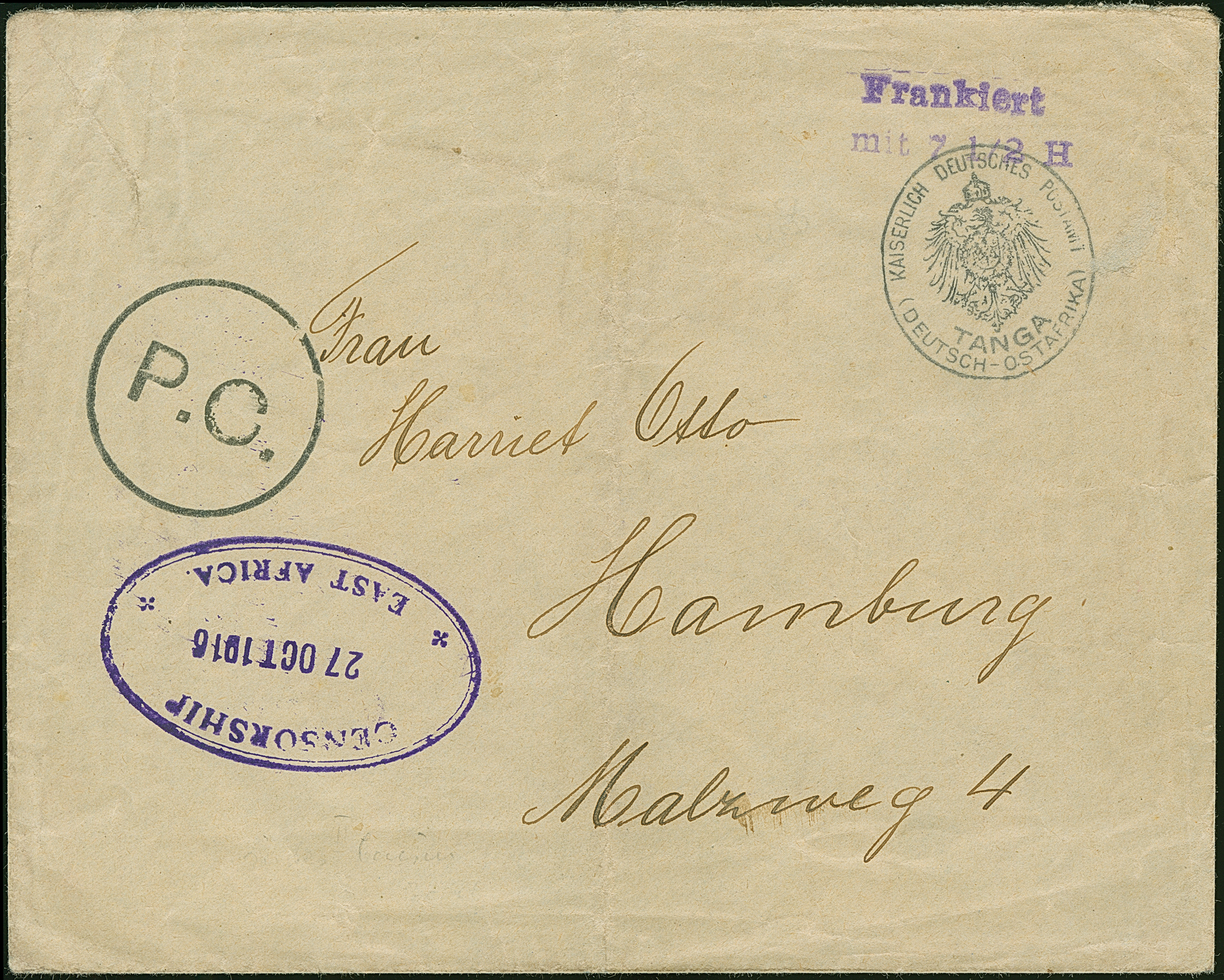 1916, “CENSORSHIP EAST AFRICA 27.OCT.1916” klar in Violett auf Privat-Ganzsachenumschlag mit violettem L2 “Frankiert mit 7½ H” und Dienstsiegel von Tanga als Formblatt mit schwarzem Kreisstempel “P.C.” und rückseitigem Zensur-Label “OPENED BY CENSOR P.W.140” als portofreie Sendung nach Hamburg. Der Umschlag mit senkrechter Faltung und stärkere Beförderungsspuren im Rand. Interessante Verwendung als Kriegsgefangenen-Brief aus einem britischen Lager in Ostafrika (Strahlendorf/Mette PU3)