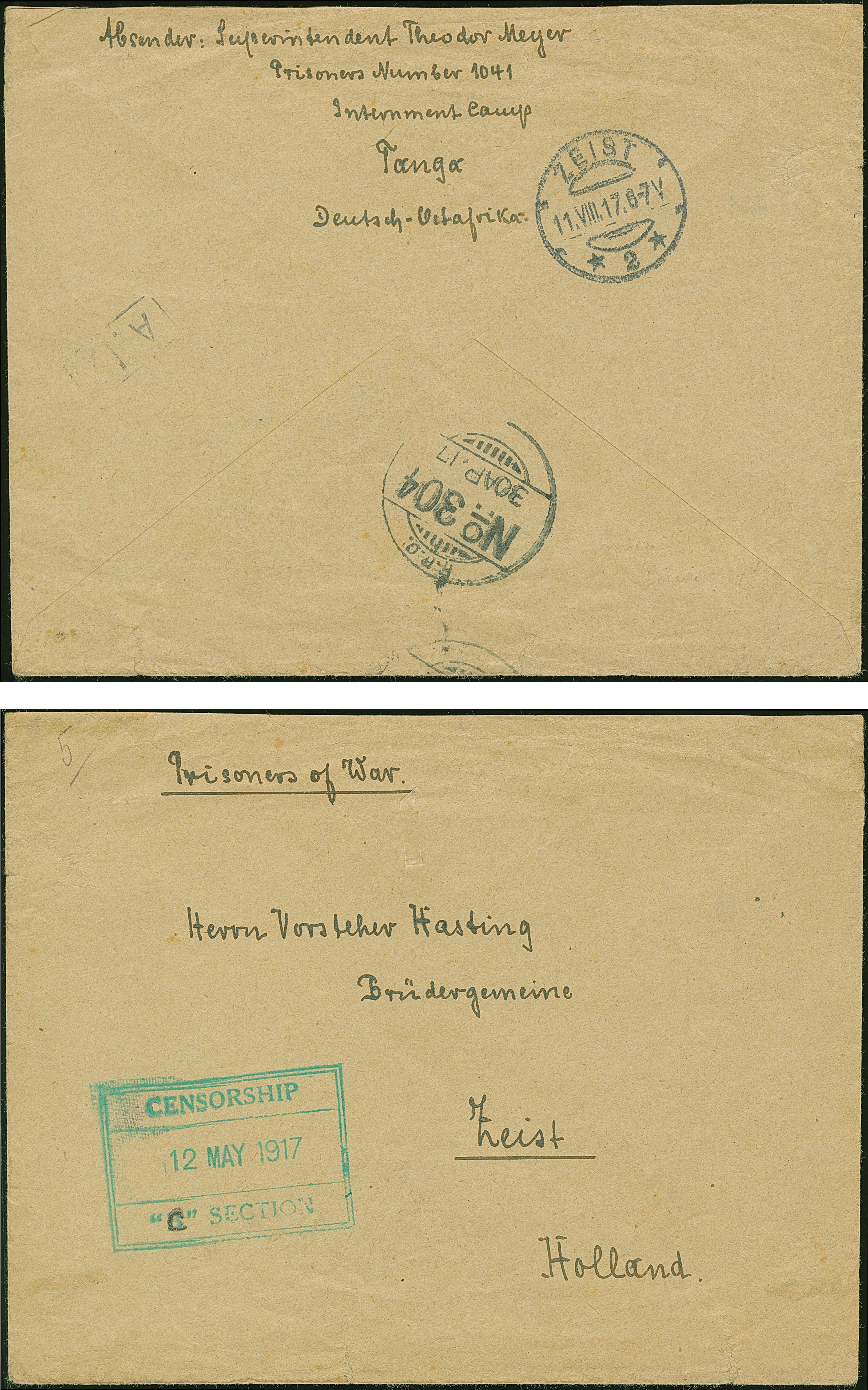 1917, “CENSORSHIP ”C" SECTION 12.MAY.1917" grüner Rahmenstempel mit handschriftlich geändertem “C” statt “B” auf Kriegsgefangenpost-Brief mit rückseitigem Absendervermerk “….Superintendent Theodor Meyer Prisoners Number 1041 Internment Camp Tanga DOA” und mit britischem Feldpoststempel “F.P.O. No. 304 30.AP.17” nach Zeist, Holland mit Ankunftsstempel. Der Umschlag mit Beförderungsspuren im Rand, ansonsten in guter Erhaltung