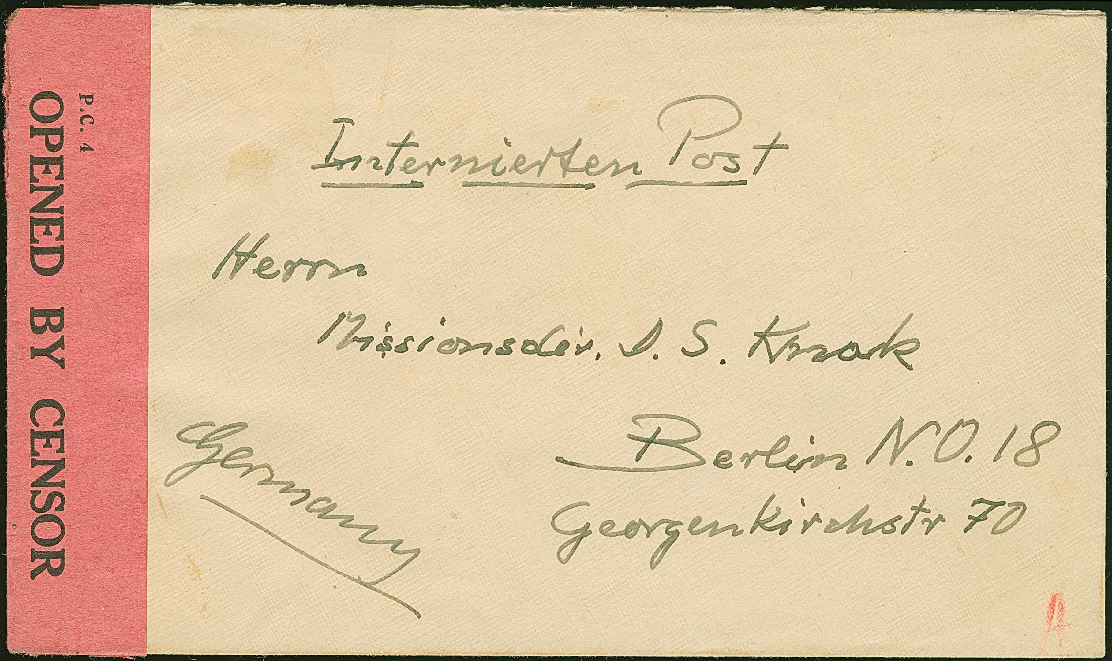 1917 (ca.), Internierten-Briefumschlag mit rückseitigem Absendervermerk “H. Krelle, Oldeani Camp Tanz. Terr.” und Zensur-Verschlusslabel links “OPENED BY CENSOR P.C.4” nach Berlin in einwandfreier Erhaltung