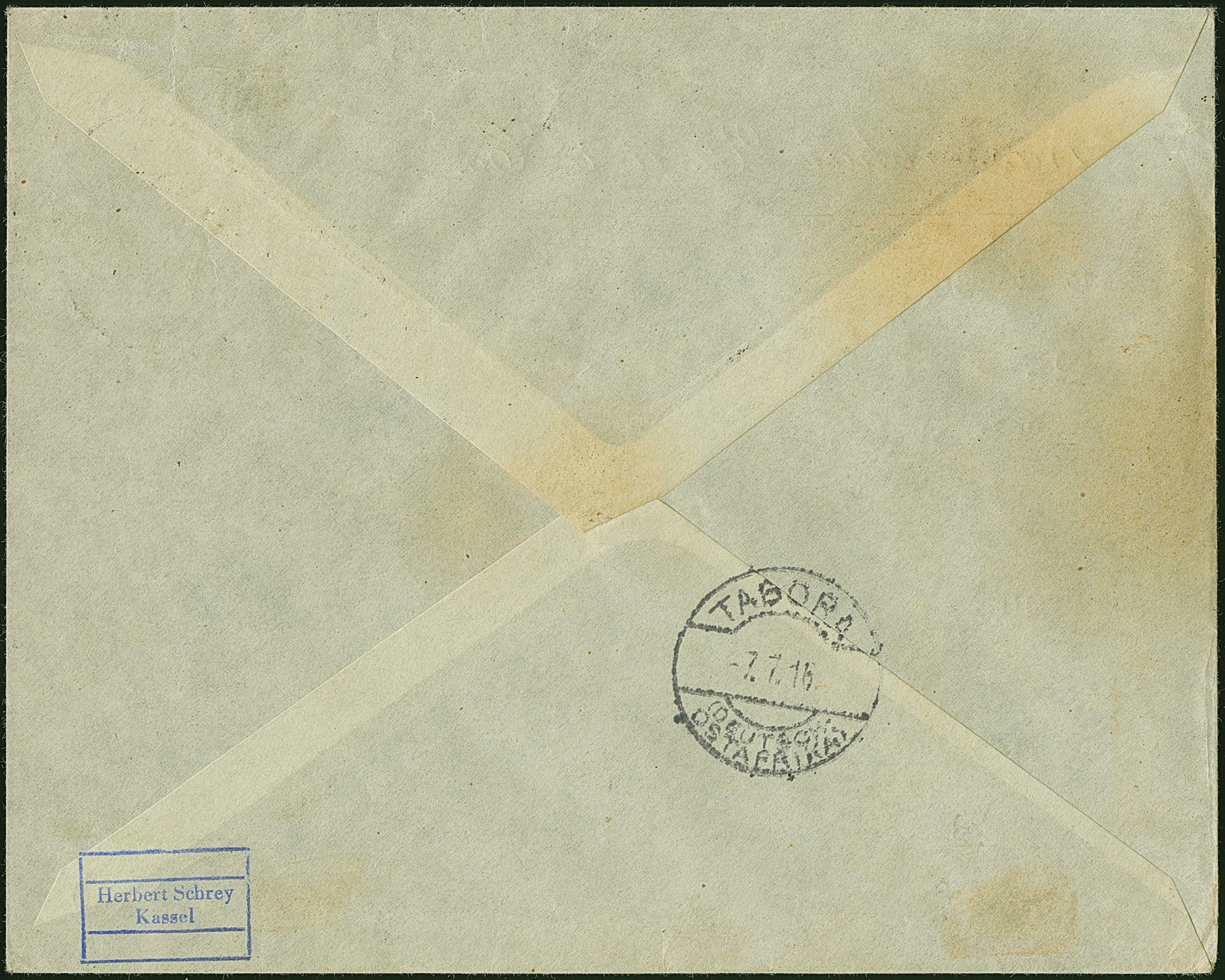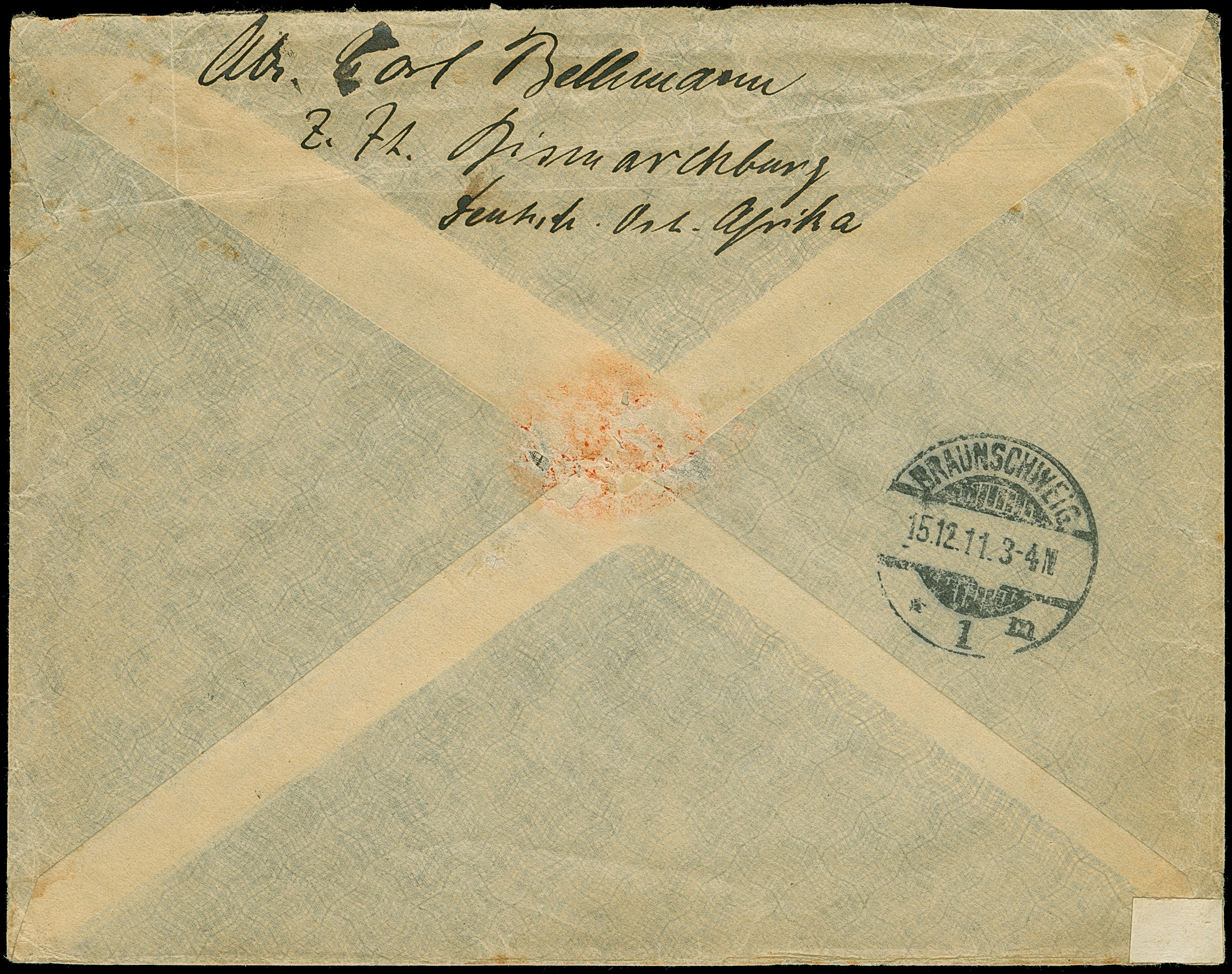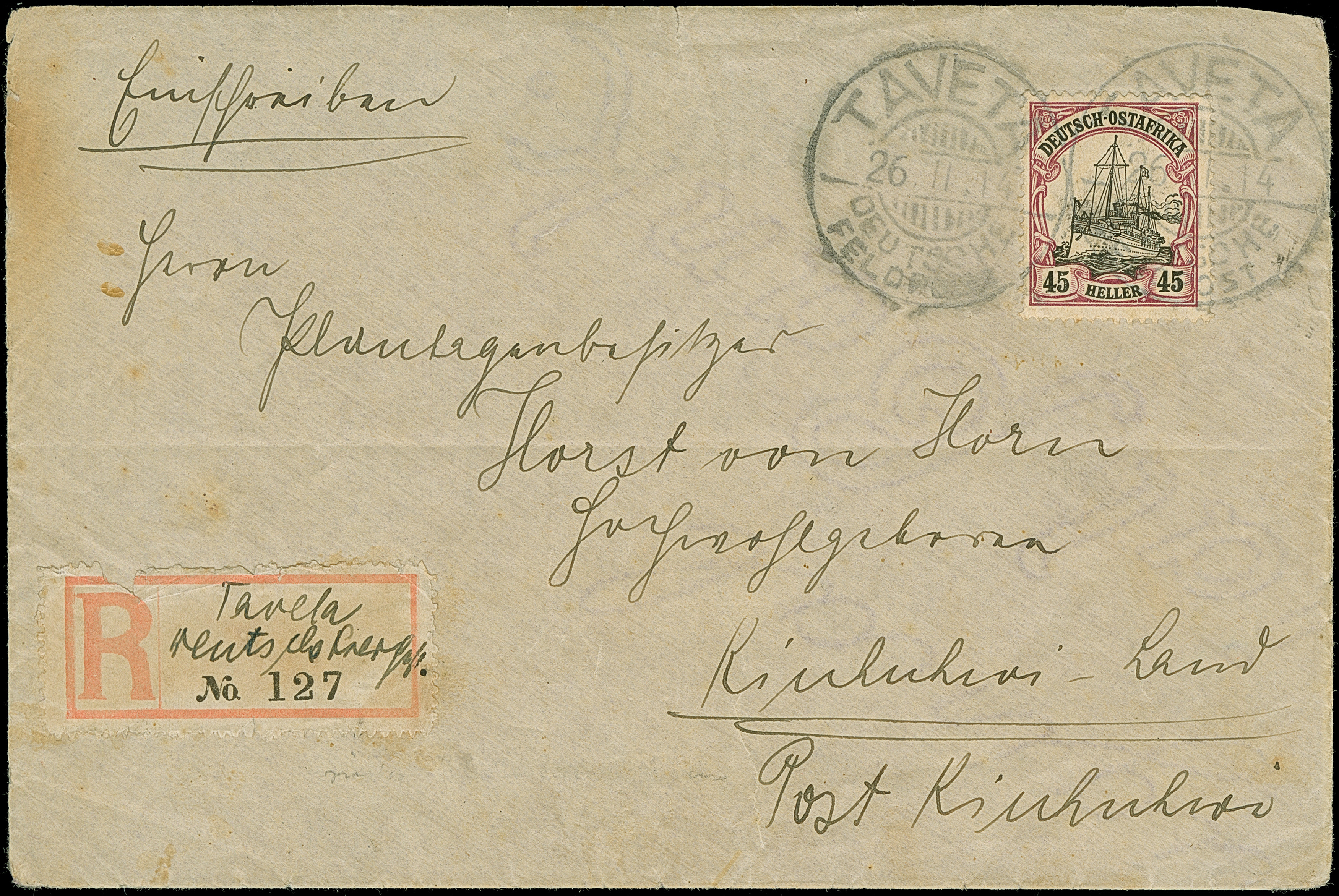 1914, “TAVETA DEUTSCHE FELDPOST 26.11.14” klar auf Kaiseryacht 45 H. mit Wasserzeichen auf R-Brief mit fehlerhaftem Blanko-R-Zettel mit handschriftlichem Vermerk “Taveta Deutsche Feldpst.” an einen Plantagenbesitzer in Kiuhuroi Land mit rückseitigem Bahnpoststempel “USAMBARA (DOA) ZUG 6 2,12,14”. Der Umschlag rückseitig oben nicht komplett (oberer Teil kpl. ausgeschnitten) und mit waagerechter Faltung unterhalb der Frankatur, ansonsten in guter Erhaltung und ein interessanter R-Brief aus dem Bedarf