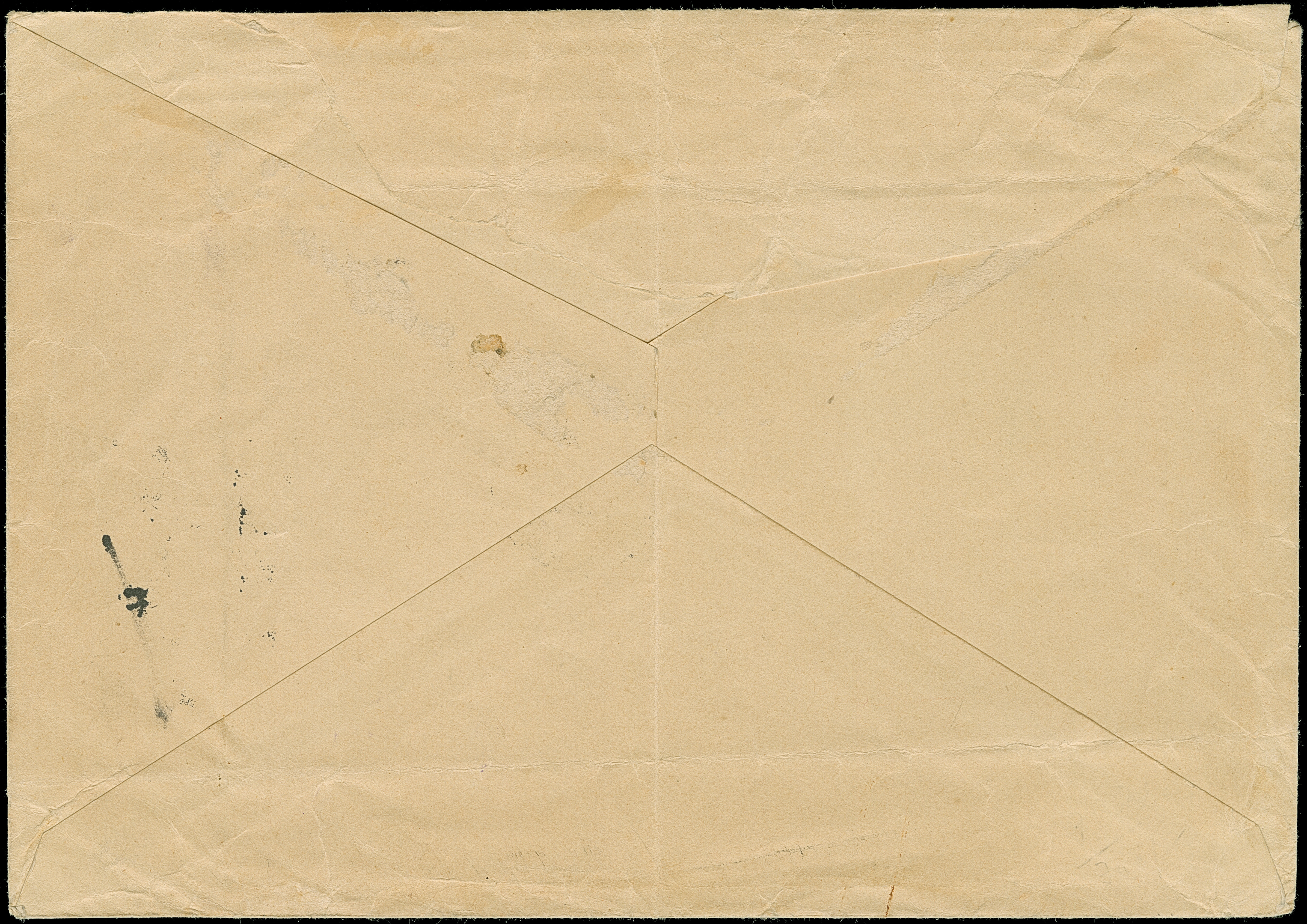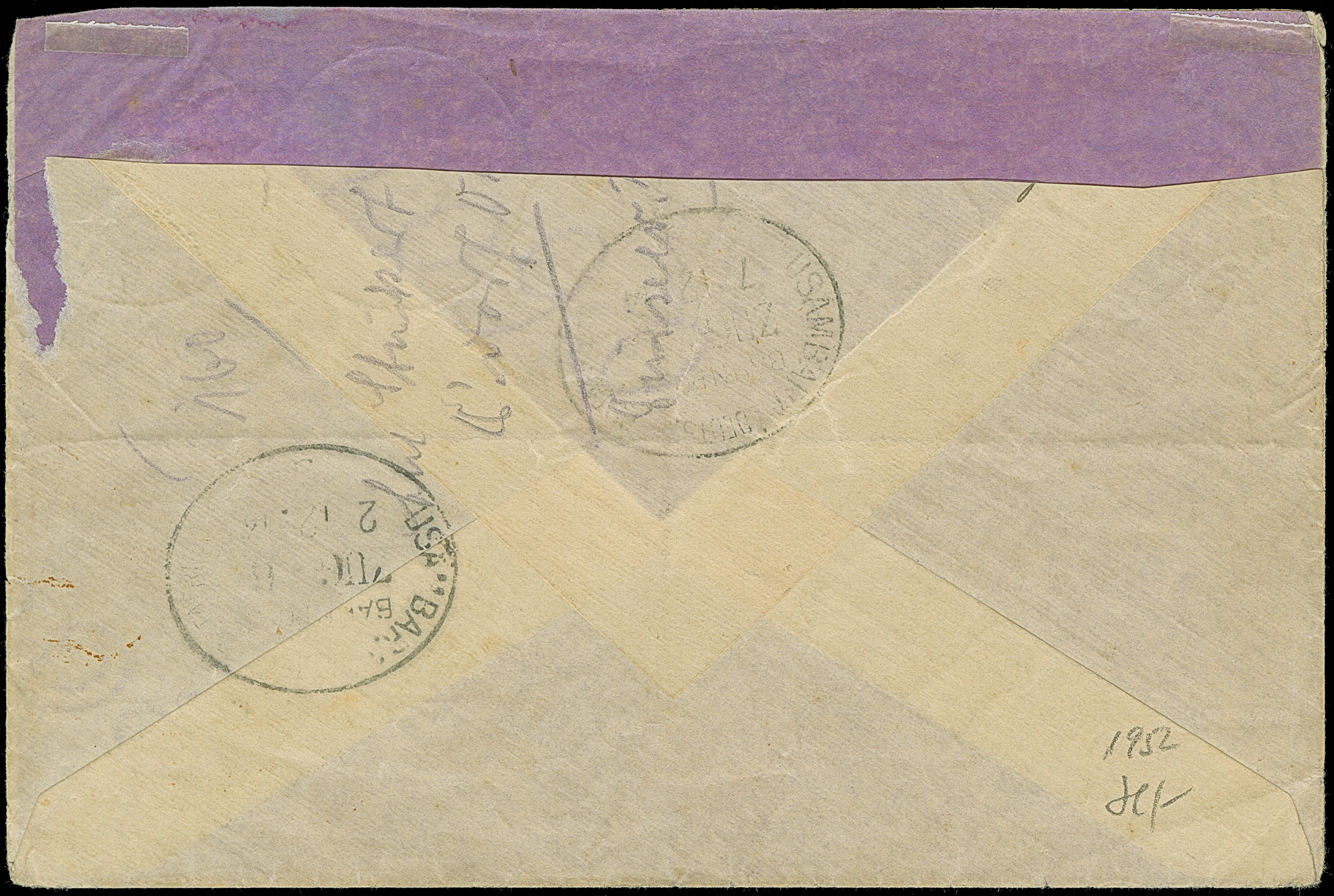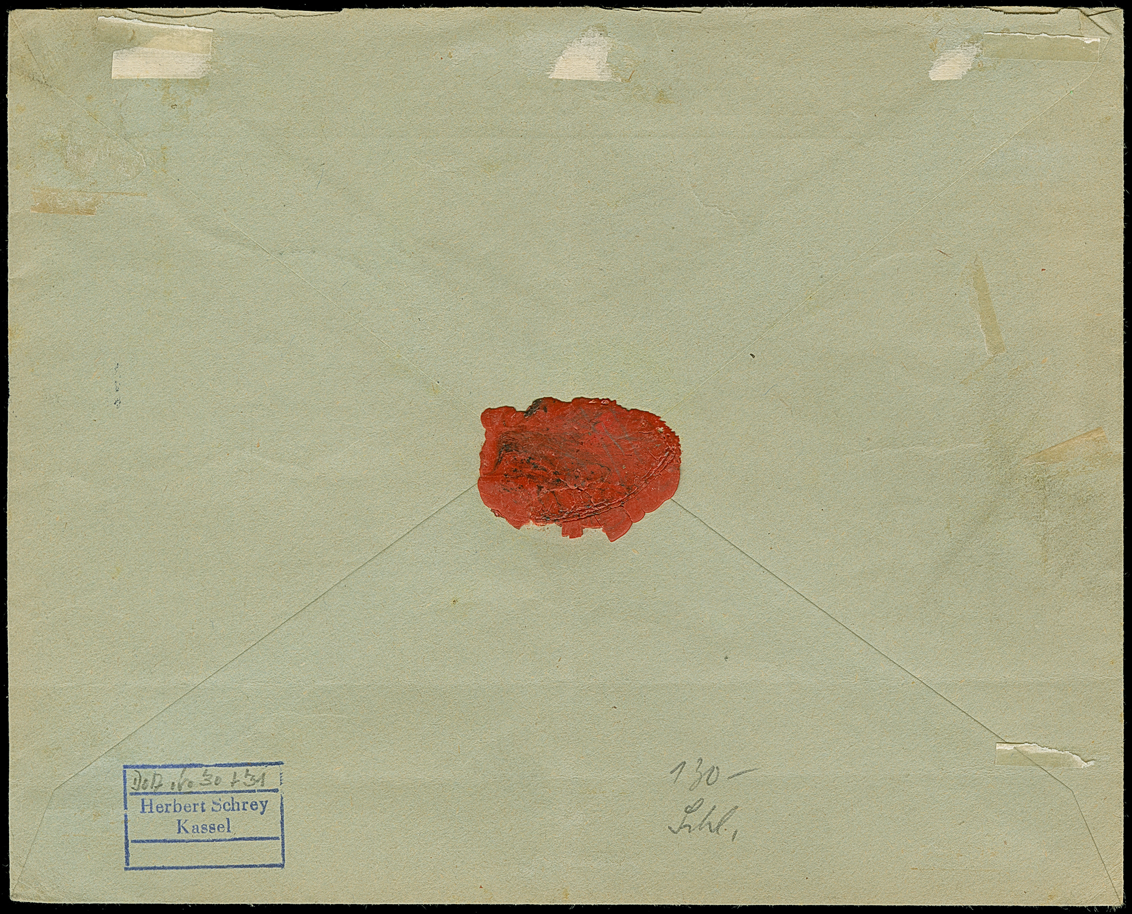 1914, “TAVETA DEUTSCHE FELDPOST 26.11.14” klar auf Kaiseryacht 45 H. mit Wasserzeichen auf R-Brief mit fehlerhaftem Blanko-R-Zettel mit handschriftlichem Vermerk “Taveta Deutsche Feldpst.” an einen Plantagenbesitzer in Kiuhuroi Land mit rückseitigem Bahnpoststempel “USAMBARA (DOA) ZUG 6 2,12,14”. Der Umschlag rückseitig oben nicht komplett (oberer Teil kpl. ausgeschnitten) und mit waagerechter Faltung unterhalb der Frankatur, ansonsten in guter Erhaltung und ein interessanter R-Brief aus dem Bedarf