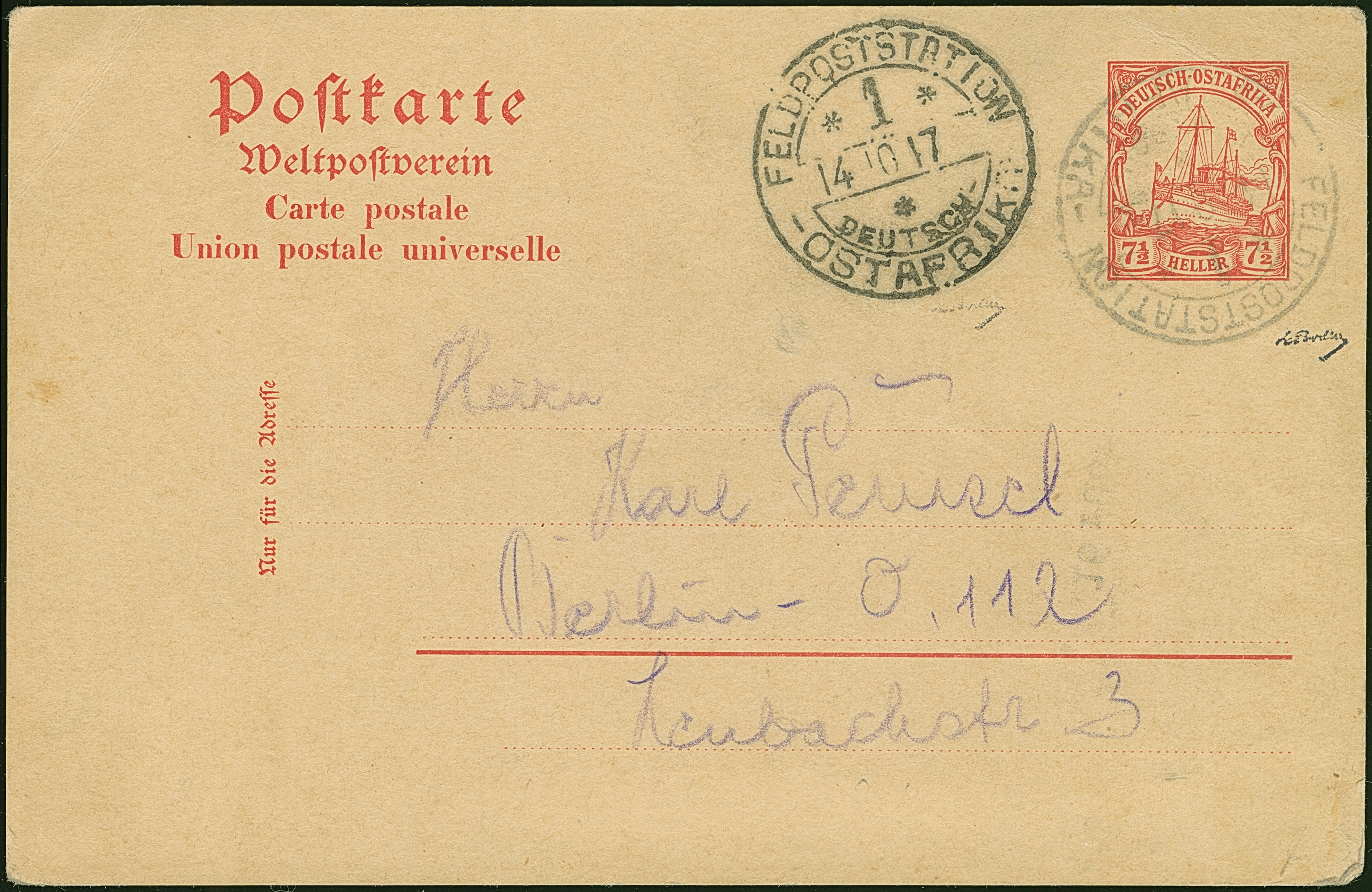 1917, “FELDPOSTSTATION DEUTSCH OSTAFRIKA 1 14.10.17” einmal etwas schwach auf Ganzsachenkarte 10 Pfg. mit nebengesetztem 2. klaren Abschlag und viel Text und Datierung “D.O.A.-Fpst. 1 13.X.17” nach Berlin. Die Karte mit Eckbügen, ansonsten in guter Erhaltung. Eine sehr späte Verwendung mit neuem Spätdatum, die Beförderung nach Deutschland erfolgte vermutlich nicht mehr, sign. E. Boden