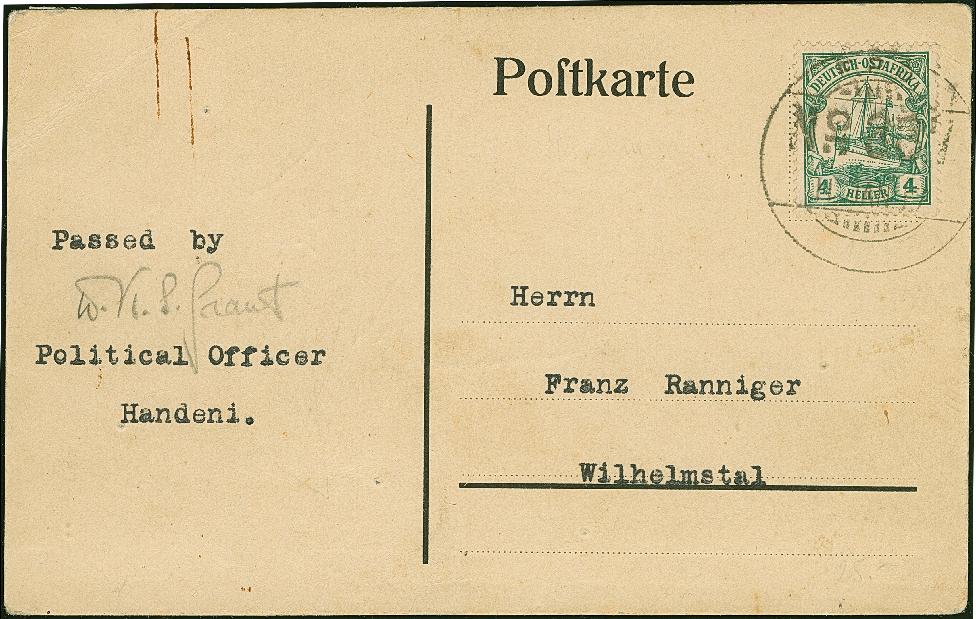 1917, “F.P.O. No. 337 11.JAN.17” auf Kaiseryacht 4 H. mit Wasserzeichen auf Postkarte mit Text und Datierung “Post Handeni 4.Januar” sowie Zensur-Vermerk vom Political Officer Handeni mit Unterschrift nach Wilhelmstal. Die Karte links mit Eckbug und Klammerspuren, ansonsten in guter Erhaltung. Eine ganz ungewöhnliche Verwendung aus dem Bedarf
