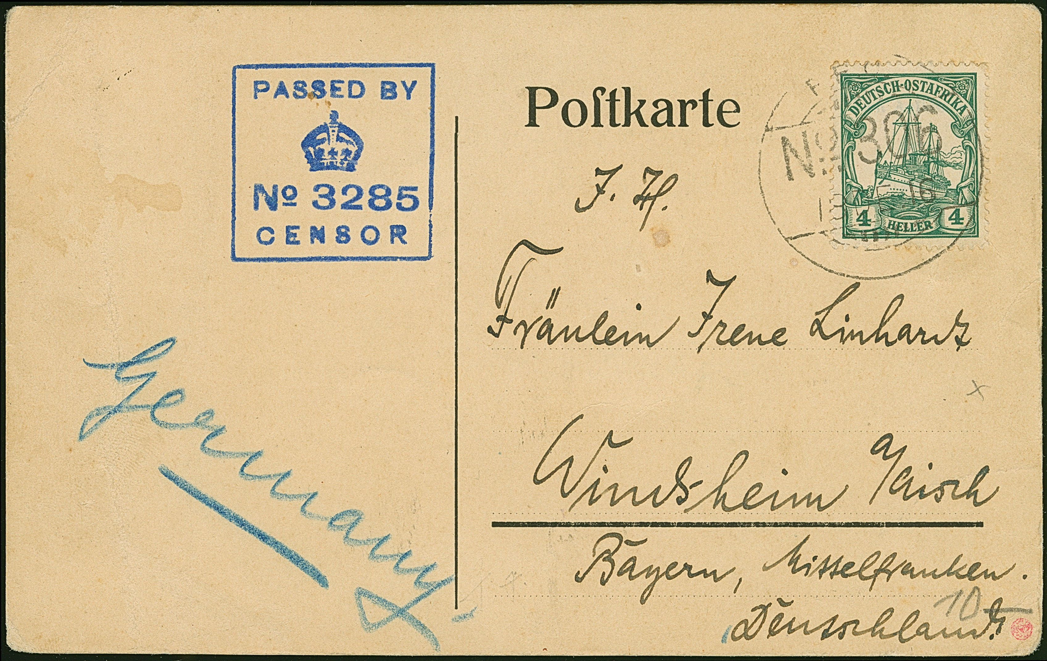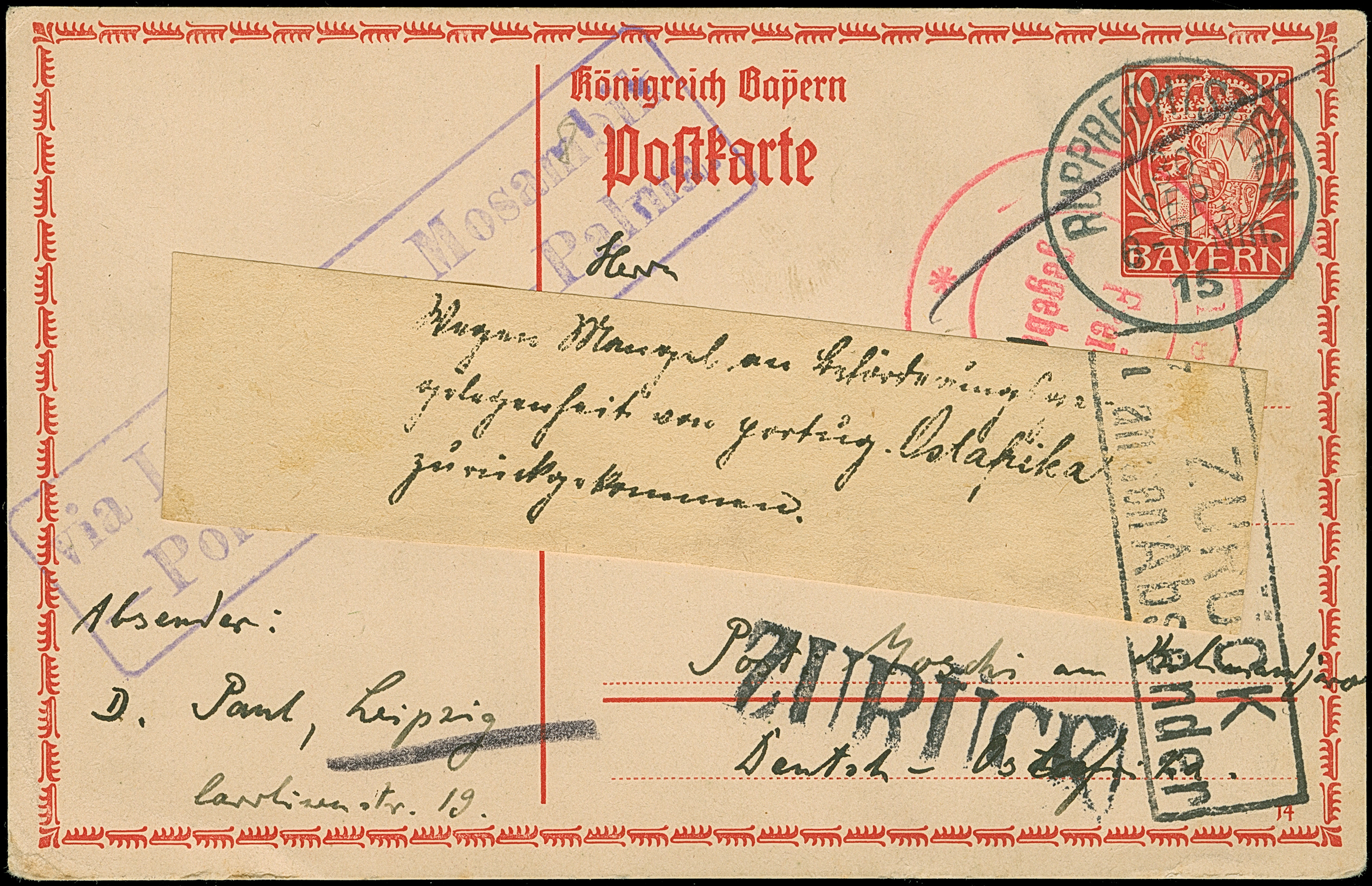 Incoming Mail: 1915, Bayern Ganzsachenkarte 10 Pfg. mit Stempel “RUPPRECHTSTEIN 30.SEP.15” mit rotem Zensurstempel von Emmerich und Leitstempel “via Lissabo-Mosambik-Porto Ameila-Palma”, adressiert nach Moschi. Dann zurück mit Klebezettel “Wegen Mangel an Beförderungs-gelegenheit von portug. Ostafrika zurückgekommen” und übergehendem Rahmenstempel “ZURÜCK an den Absender”. In Kombination mit dem Leitstempel und dem Klebezettel ein außerordentlich seltene Retour-Karte in guter Erhaltung
