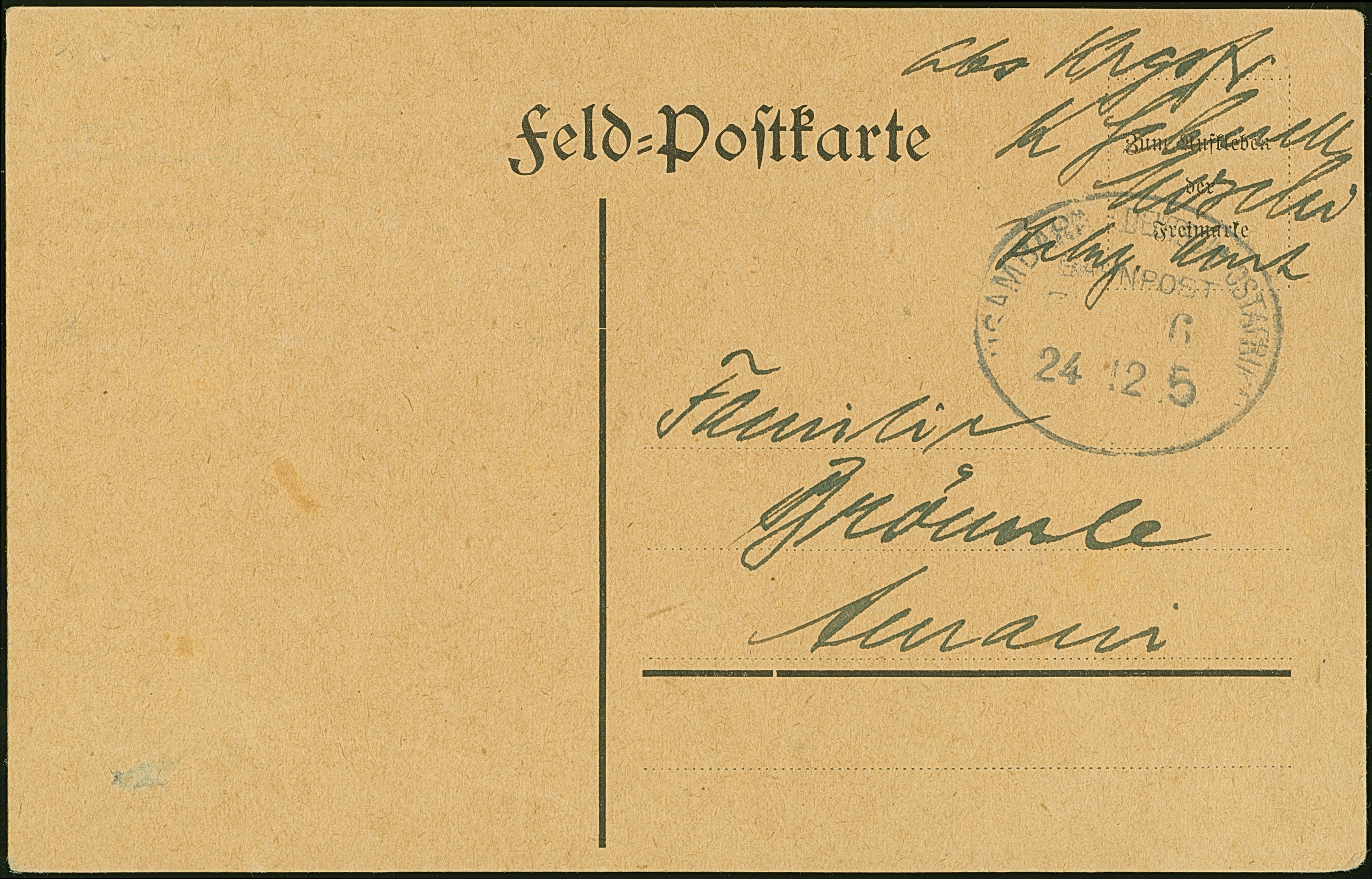 1915, “USAMBARA (DOA) ZUG 6 24.12.15” etwas undeutlicher Bahnpoststempel auf Vordruckkarte “feld-Postkarte” ohne Formular-Nummer, mit Text und Datierung “Moschi 23.12.15” nach Amani, in guter Erhaltung