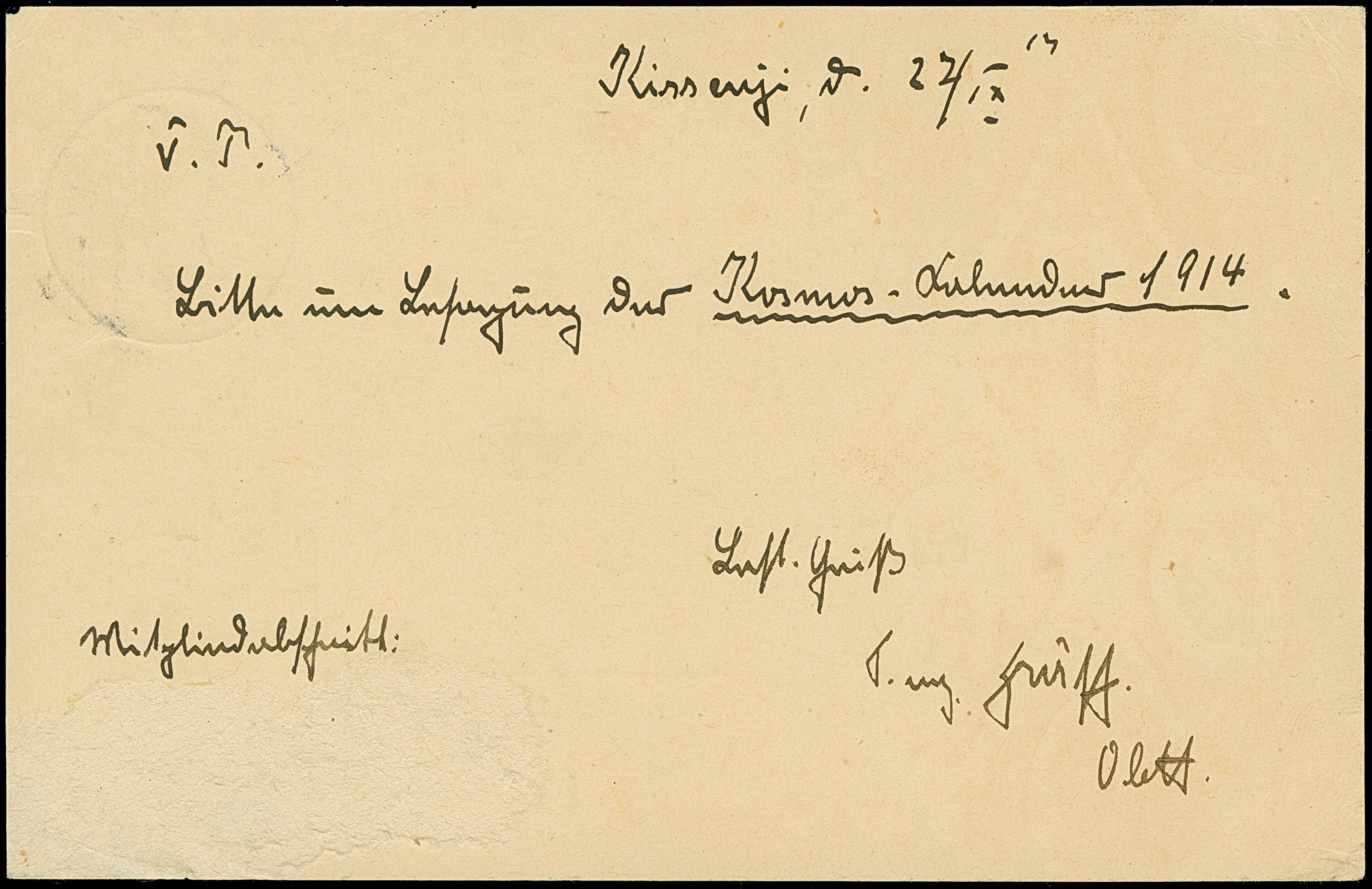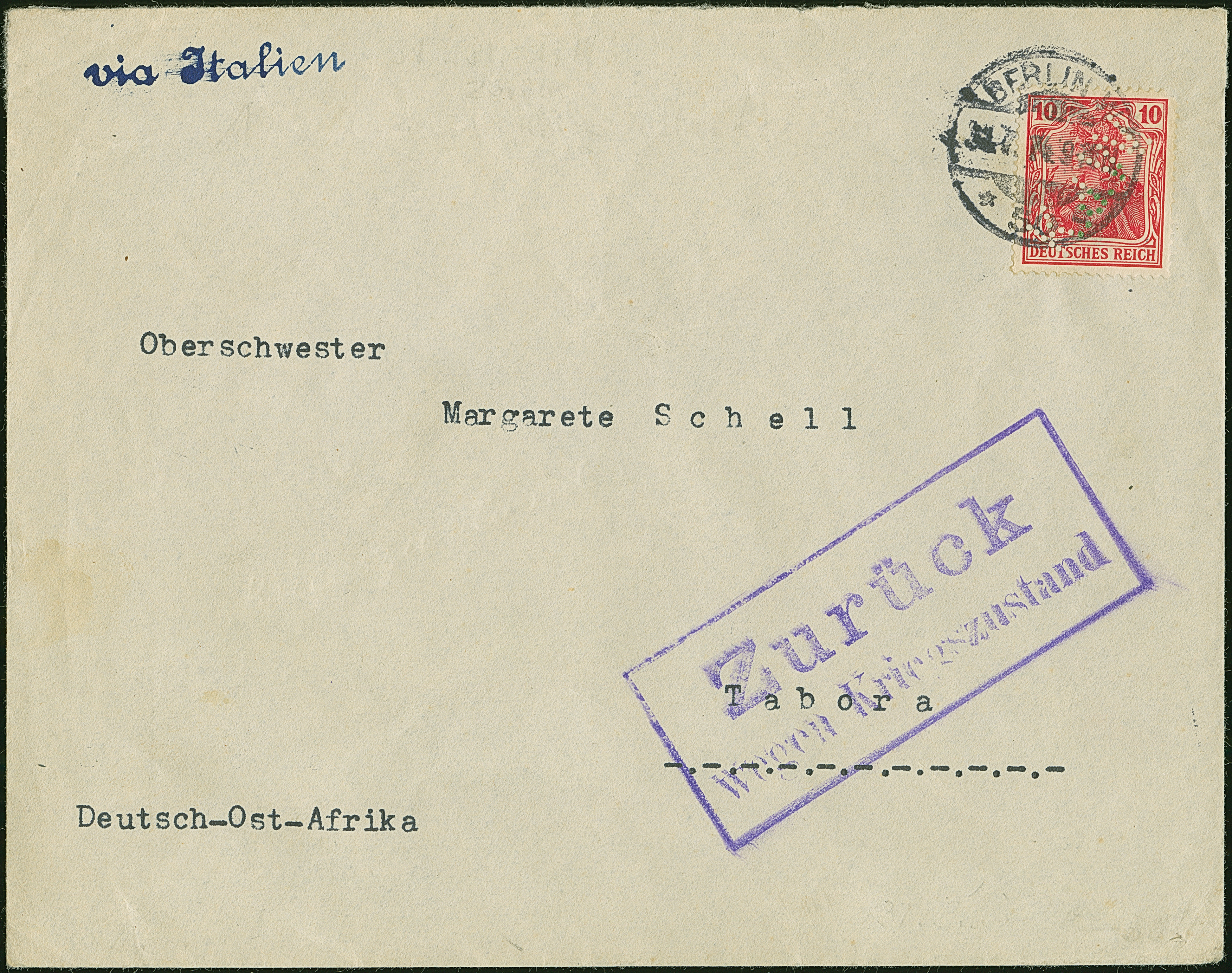 Incoming Mail: 1914, Germania 10 Pfg. mit Firmenlochung “K.d.W” (= Kaufhaus des Westen) und Stempel “BERLIN W50 31.7.14” auf Vordruckbrief mit Leitvermerk “via Italien” und Rahmenstempel “Zurück wegen Kriegszustand”, adressiert nach Tabora. Der Umschlag mit leichten Beförderungsspuren und die Marke mit Eckzahnfehler, ansonsten in guter Erhaltung