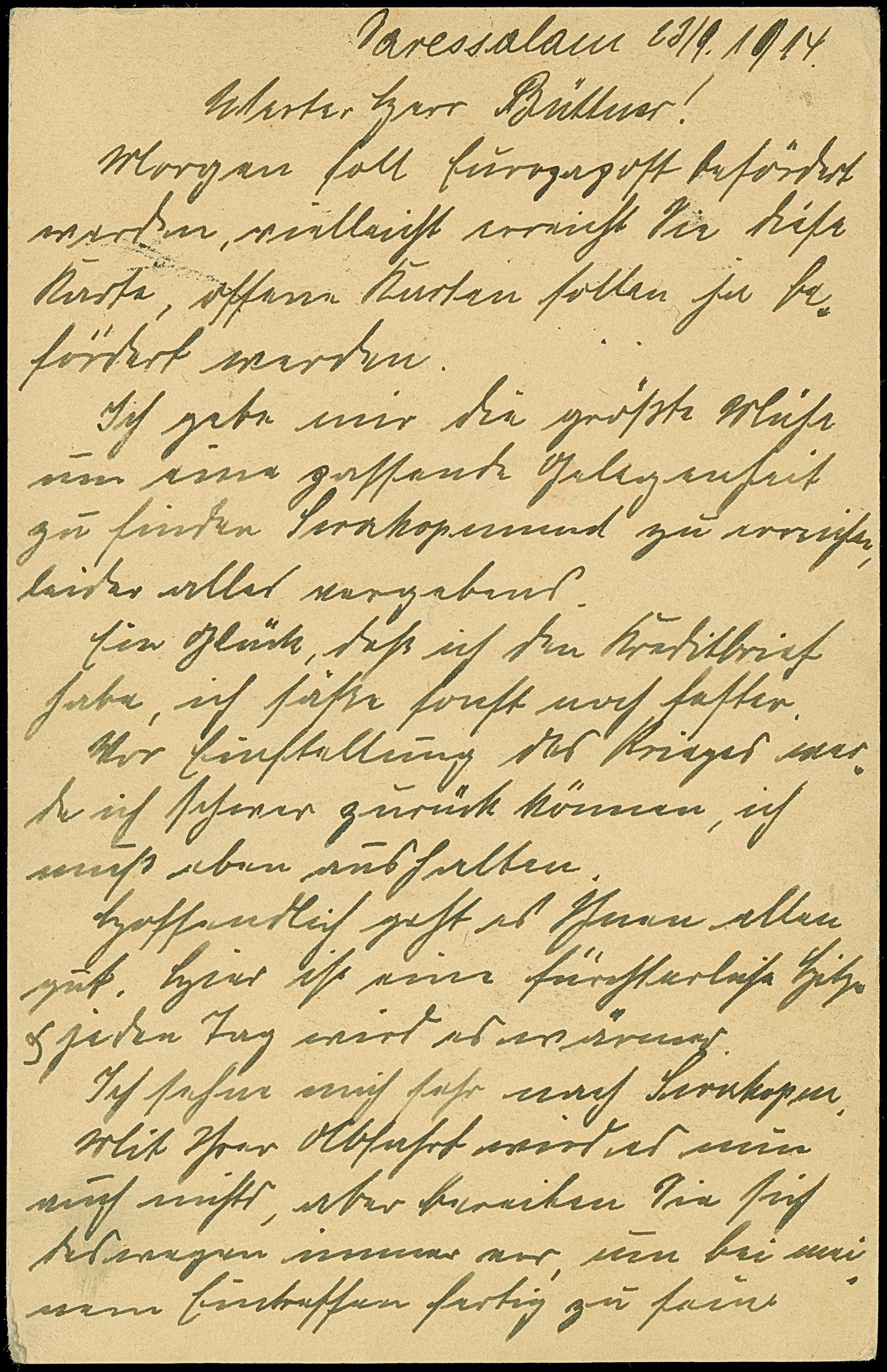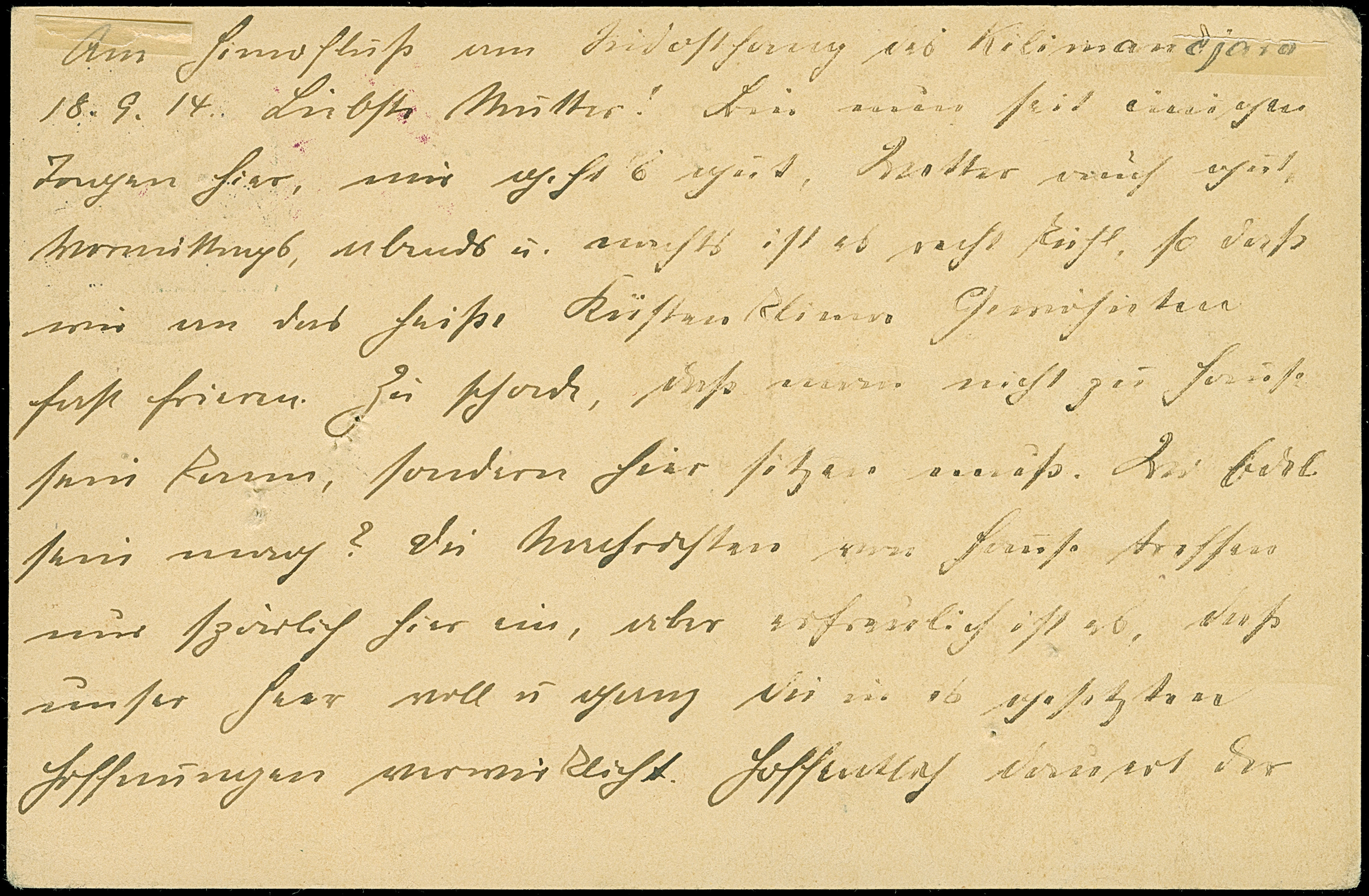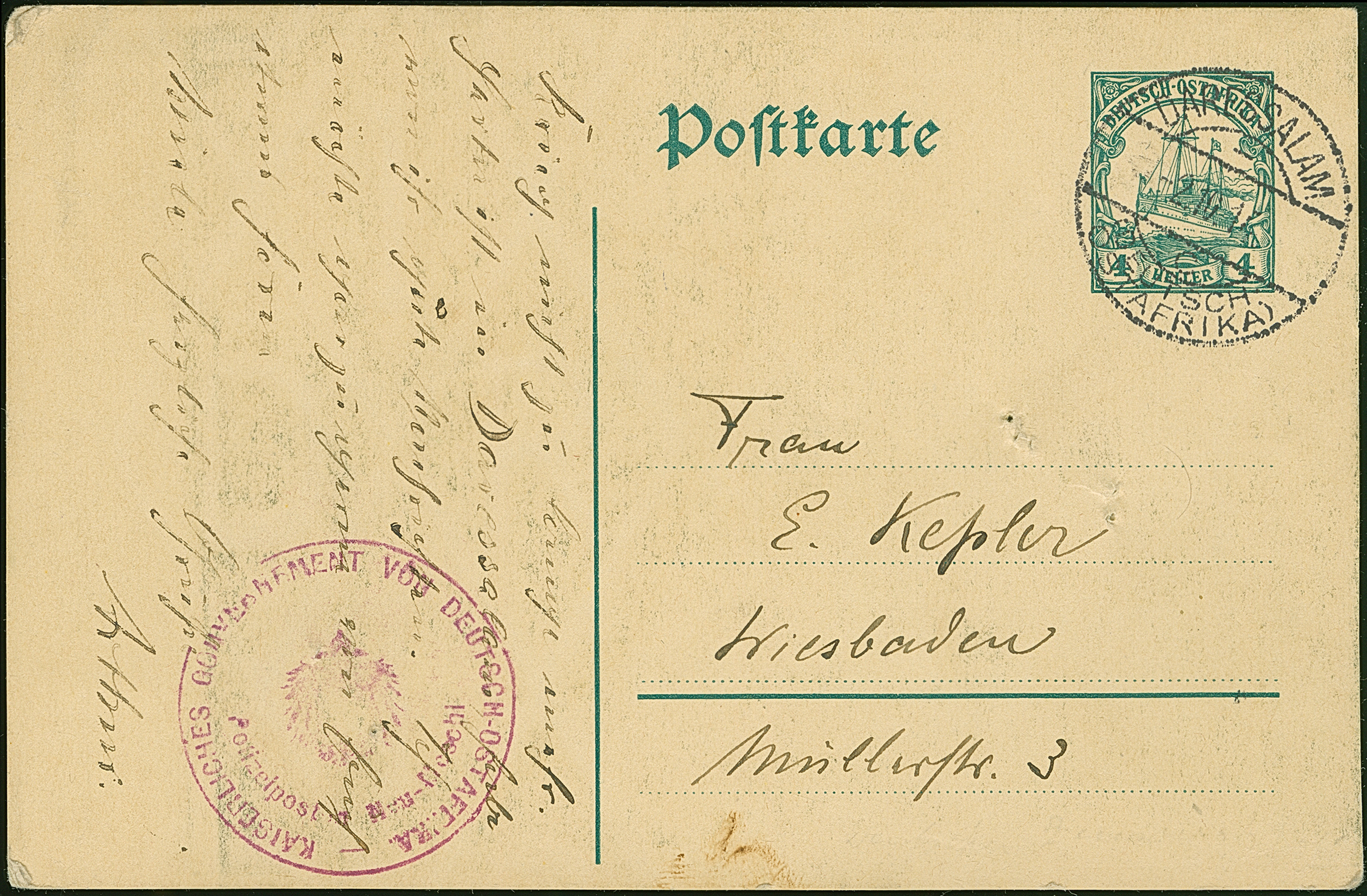 1914, “KAISERLICHES GOUVERNEMENT VON DEUTSCH OSTAFRIKA Polizeipost v. Neu.Moschi” violettes Dienstsiegel auf Ganzsachenkarte 4 H. mit Stempel “DARESSALAM (DOA) c .2.10.14” und viel Text mit Datierung “…bei Kilimandjaro 18.9.14” nach Wiesbaden. Die Karte mit kleiner Hefterlochung, amsonsten in guter Erhaltung. Das Dienstsiegel wurde vermutlich als Zensurstempel verwendet, in dieser Art hat ProFI nur zwei weitere Belege registriert