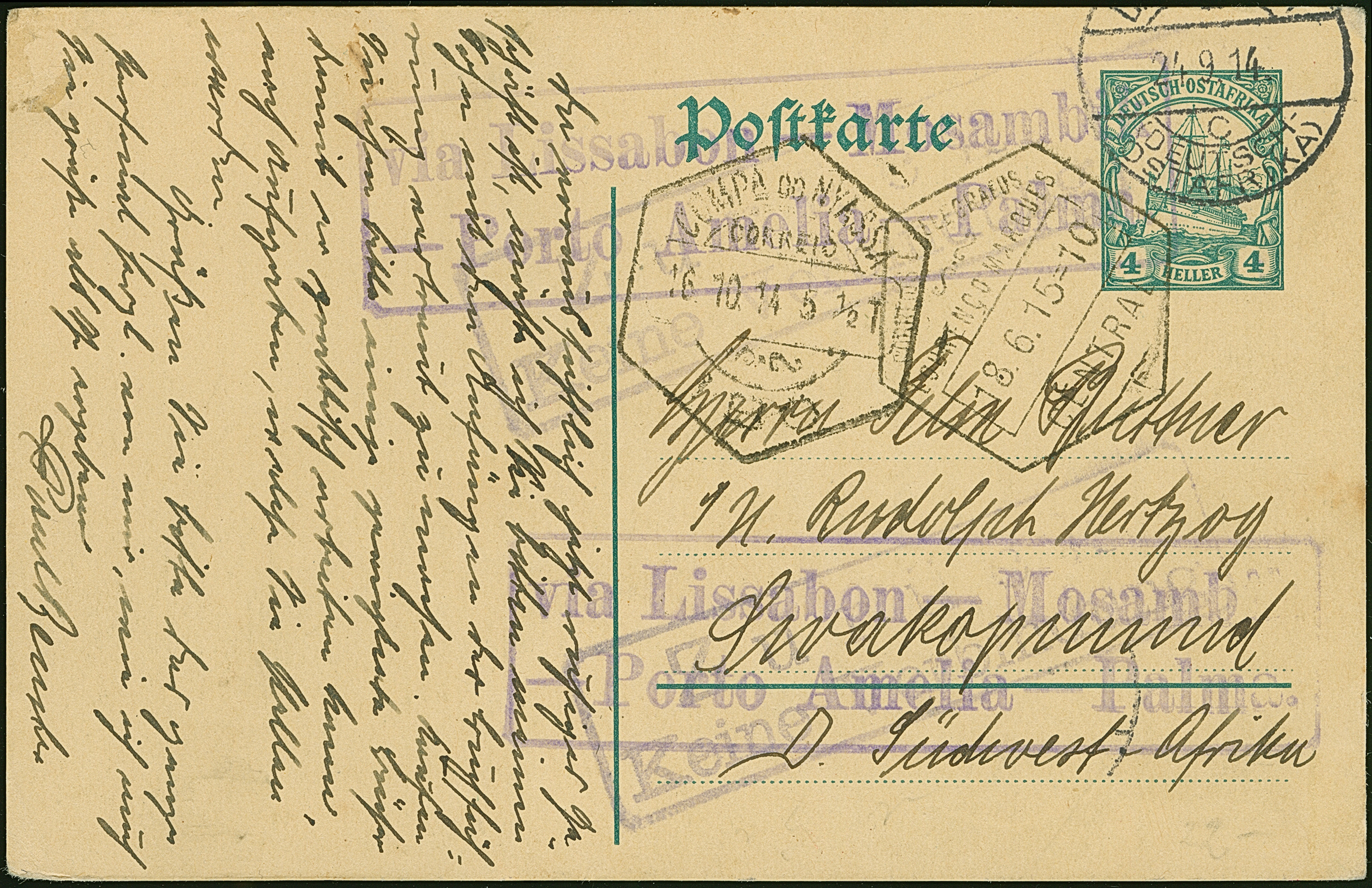 1914, Ganzsachenkarte 4 H. mit Stempel “DARESSALAM (DOA) c 24.9.14” mit viel Text und mehrfach abgeschlagenen Leitstempel “via Lissabon-Mosambik-Porto Amelia-Palma” via “COMPA DO NYASSA 15,19.14” und “LOURENCO MARQUES 18.6.15” nach Swakopmund, DSWA und retour mit Rahmenstempel “Zurück. Keine Verbindung”, in guter Erhaltung. Eine ganz ungewöhnliche Retour-Karte mit Destination DSWA