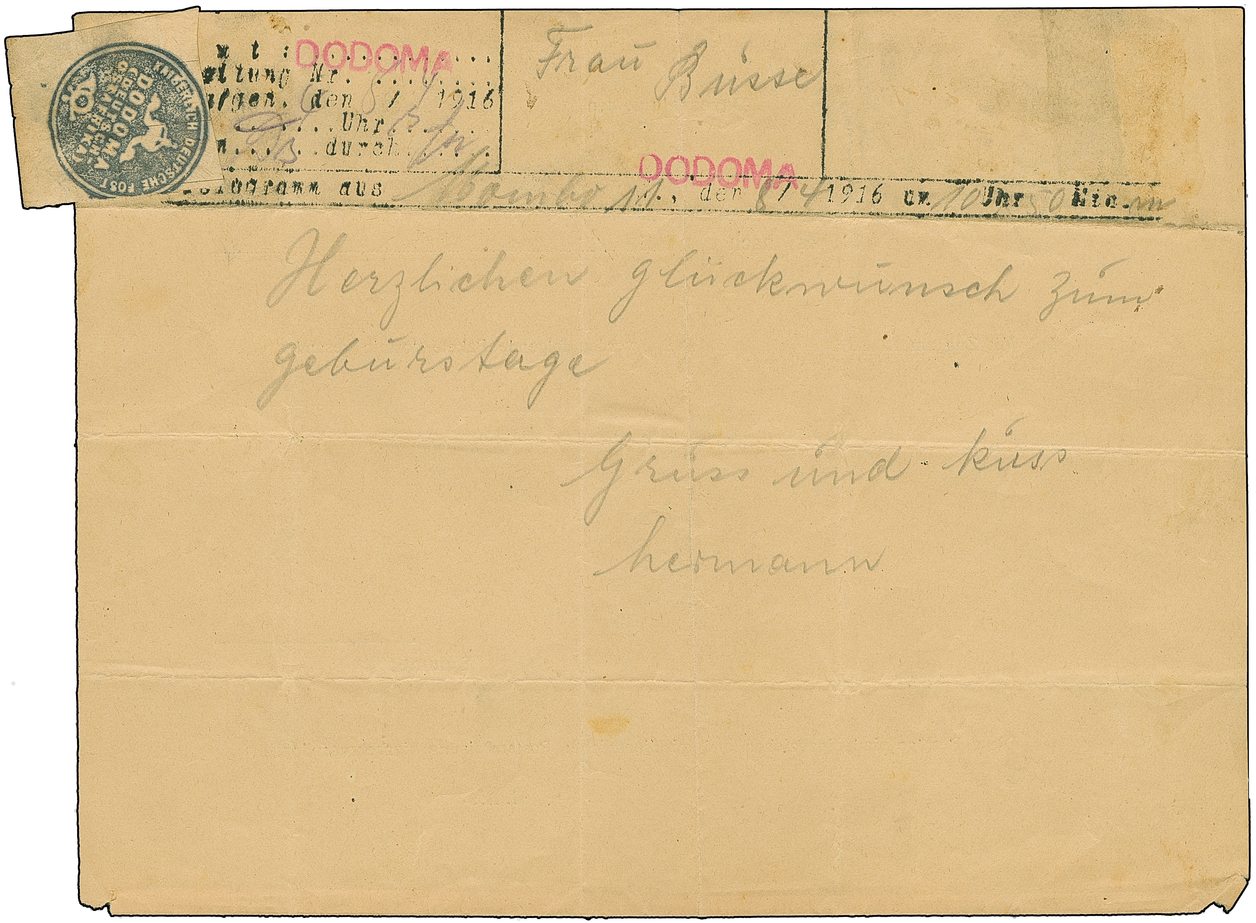 1916, provisorisches Telegramm auf Nachsende-Formular für ein Telegramm aus Mombo vom 8.4.1916 mit rotem L1 “DODOMA” und aufgeklebtem Zettel mit Dienstsiegel “KAISERLICH DEUTSCHE POST DODOMA (DOA)”. Bis auf übliche Faltsspuren in guter Erhaltung, in dieser Art selten