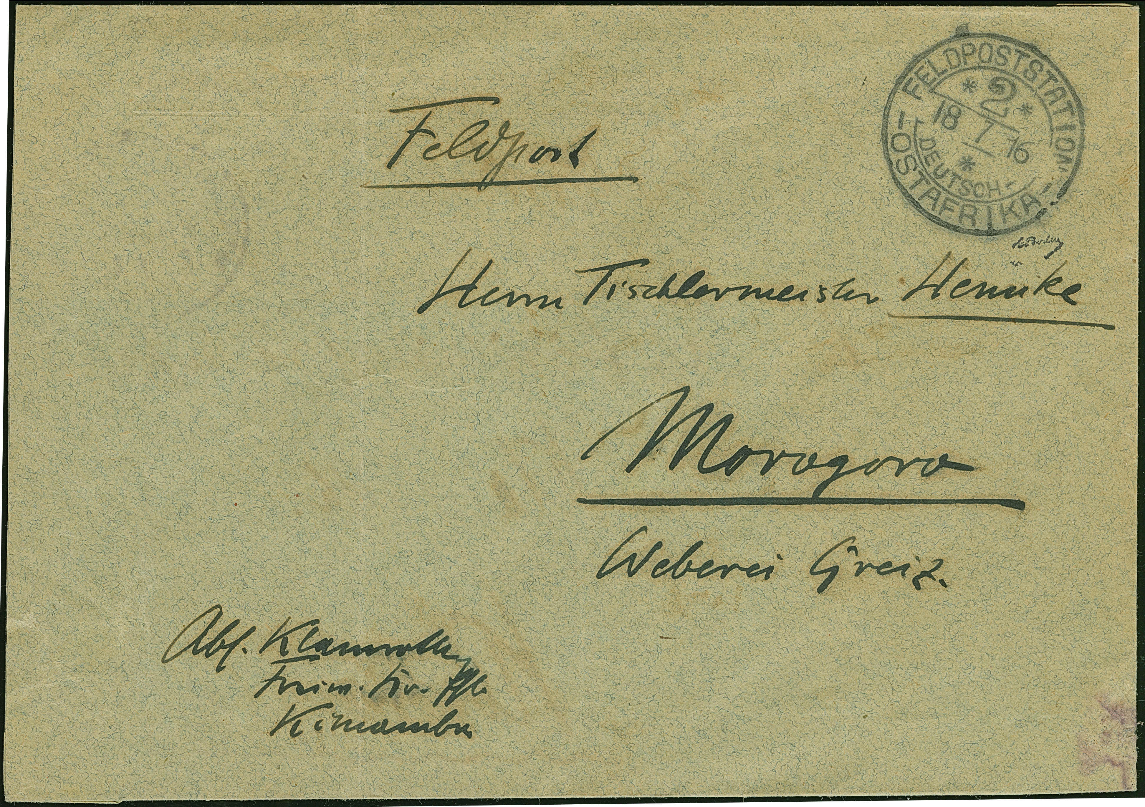 1916, “FELDPOSTSTATION DEUTSCH OSTAFRIKA 2 18.7.16” sehr klar auf doppelt verwendetem Feldpost-Umschlag (innen als Feldpostbrief mit Bahnpoststempel) mit vorderseitiger Absenderangabe aus Kimambu nach Morogoro mit Ankunftsstempel vom 19.7.16 mit kleiner Jahreszahl “16”. Der Umschlag mit senkrechter Faltung links, ansonsten in guter Erhaltung. Ein sehr schöner Bedarfsbrief mit diesem besseren Feldpoststempel, signiert E. Boden
