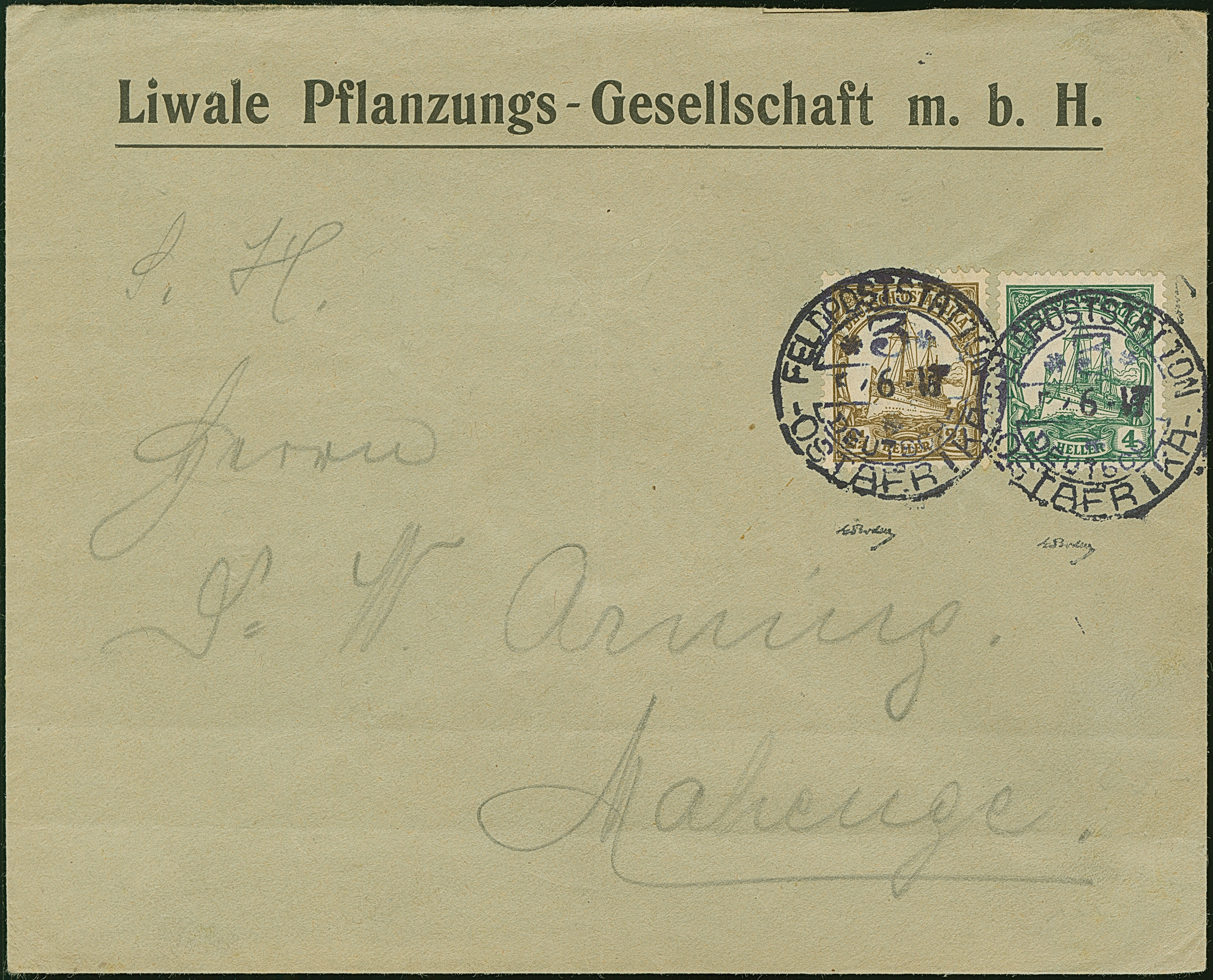 1917, “FELDPOSTSTATION DEUTSCH OSTAFRIKA 3 5.6.17” zweimal klar auf Kaiseryacht 2½ und 4 H. mit Wasserzeichen auf Vordruckbrief “Liwale Pflanzungs-Gesellschaft m.b.H.” nach Mahenge. Der Umschlag mit Faltspuren, ansonsten in guter Erhaltung. Eine seltene Verwendung auf Firmenbrief, signiert E. Boden