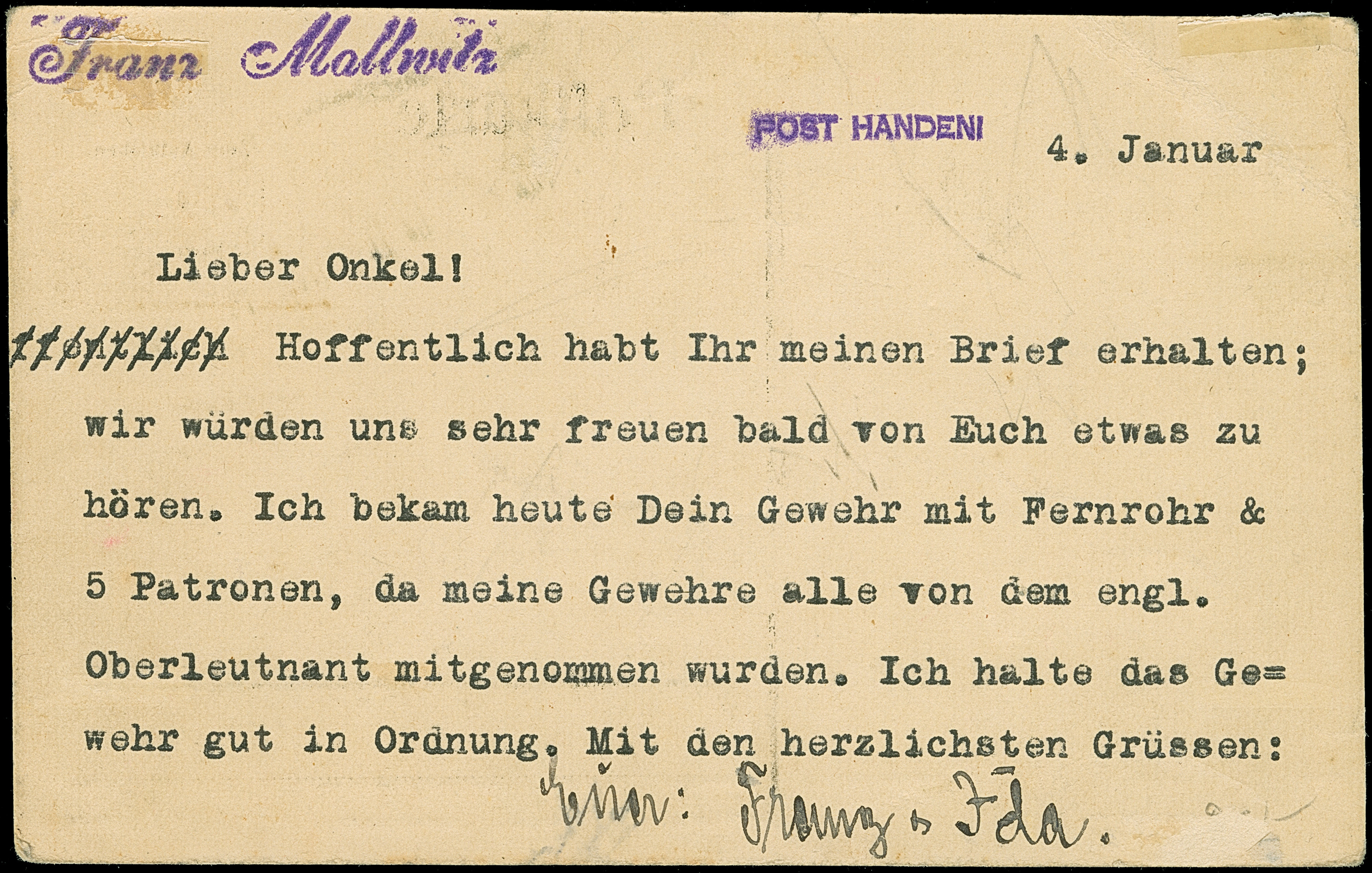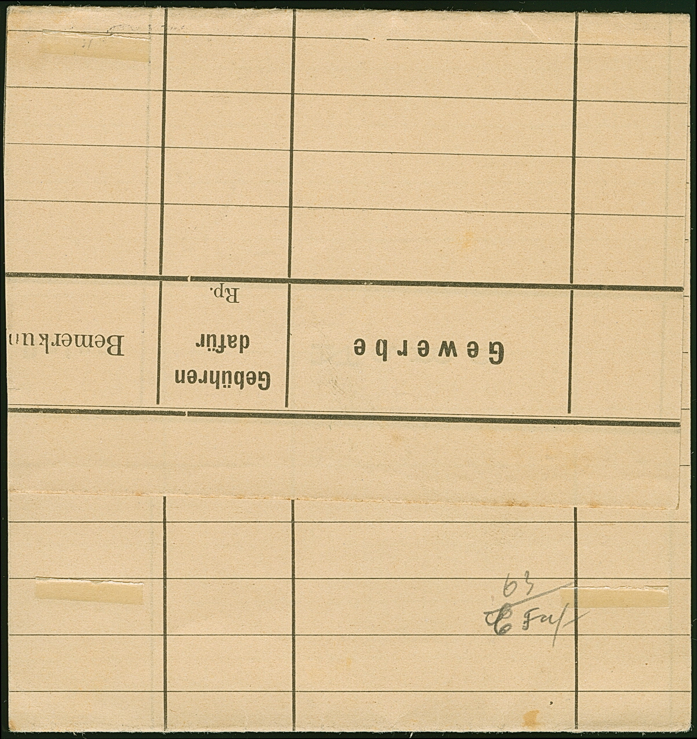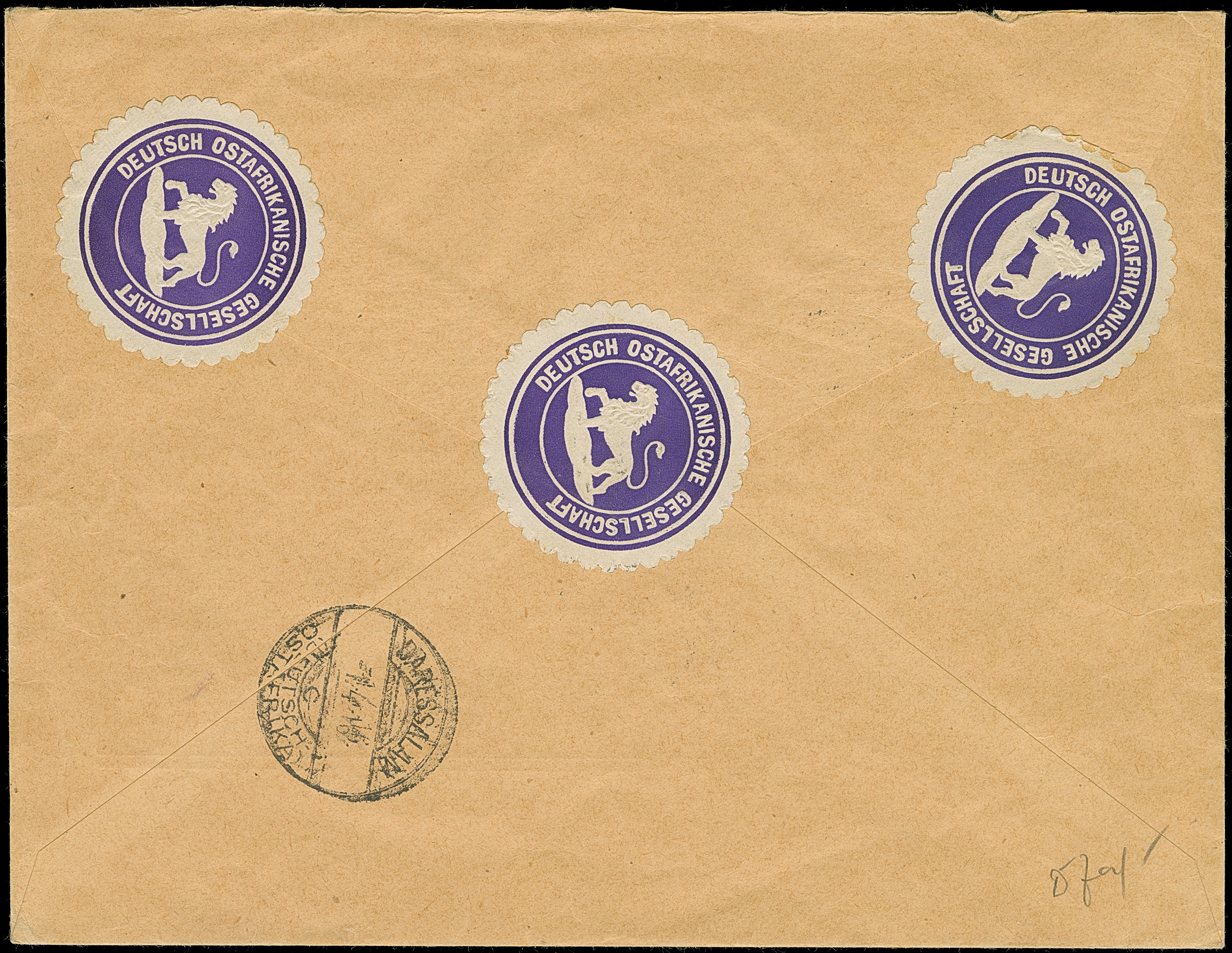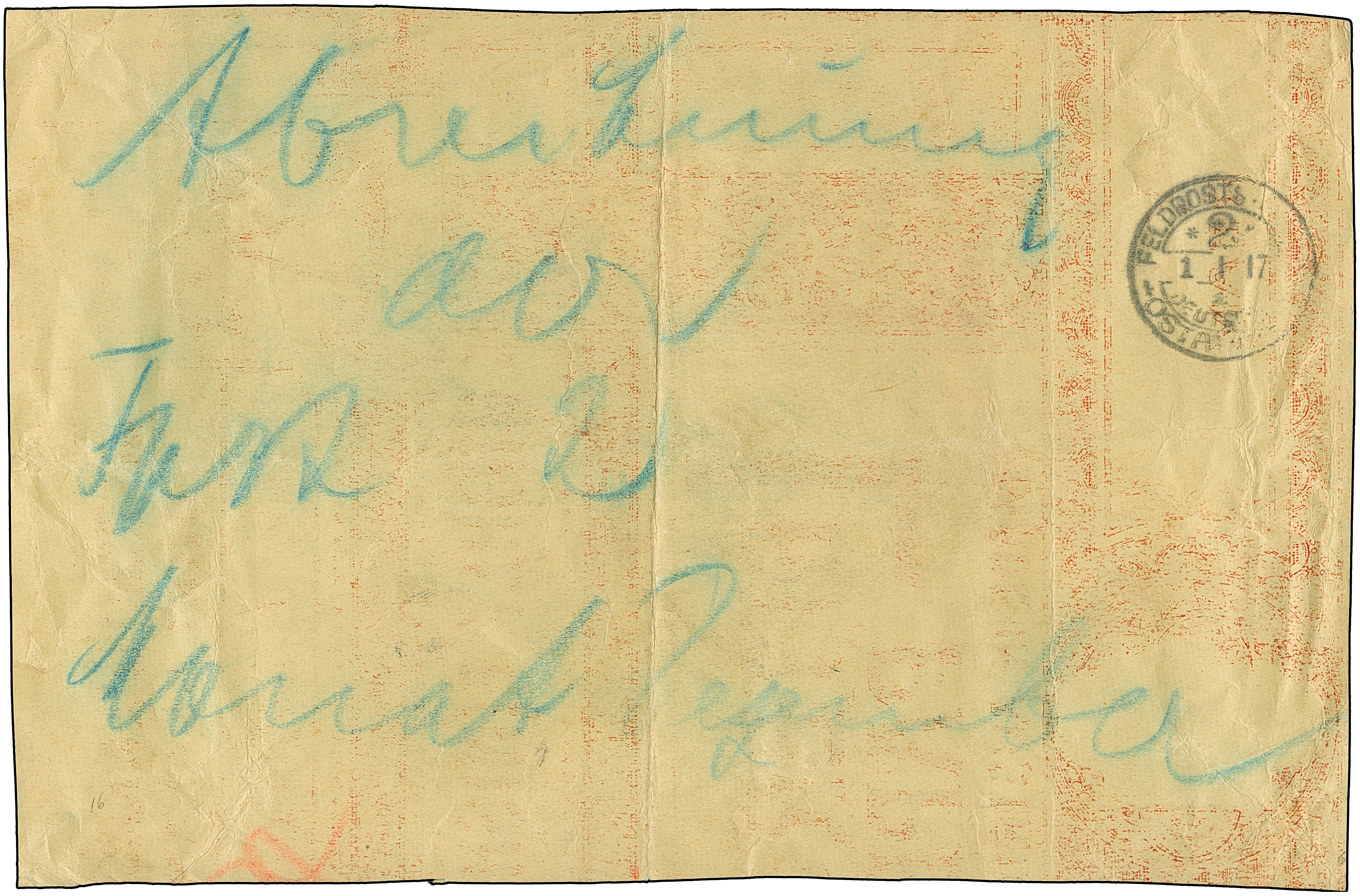 1917, “FELDPOSTSTATION DEUTSCH OSTAFRIKA 2 1.1.17” auf großformatigem Deckblatt einer vermutlich provisorischen Abrechnung der Feldpoststation 2 für Monat Dezember. Das rückseitig mit englischer Firmenwerbung bedruckte Deckblatt hat Falt- und Randspuren, ansonsten in guter Erhaltung und in dieser Art eine sehr ungewöhnliche Verwendung des besseren Feldpoststempels462