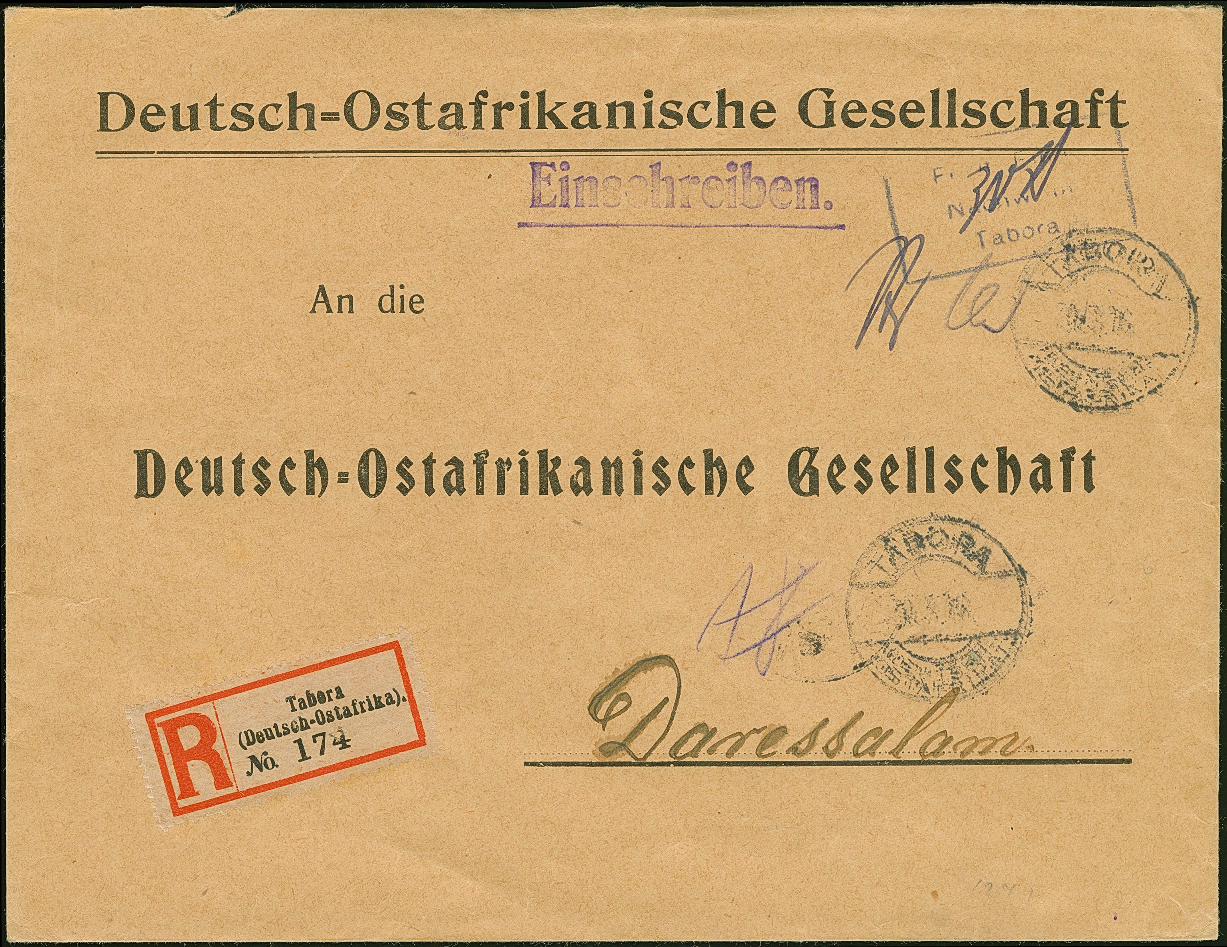 1916, “Fr. lt. Einn. Nachw. in Tabora” violetter Rahmenstempel mit handschriftlichem Portovermerk “30 H.” auf R-Vordruckbrief “Deutsch-Ostafrikanische Gesellschaft” mit undeutlichem Poststempel “TABORA DOA 30.3.16” nach Daressalam mit Ankunftsstempel vom 1.4.1916, in guter Erhaltung