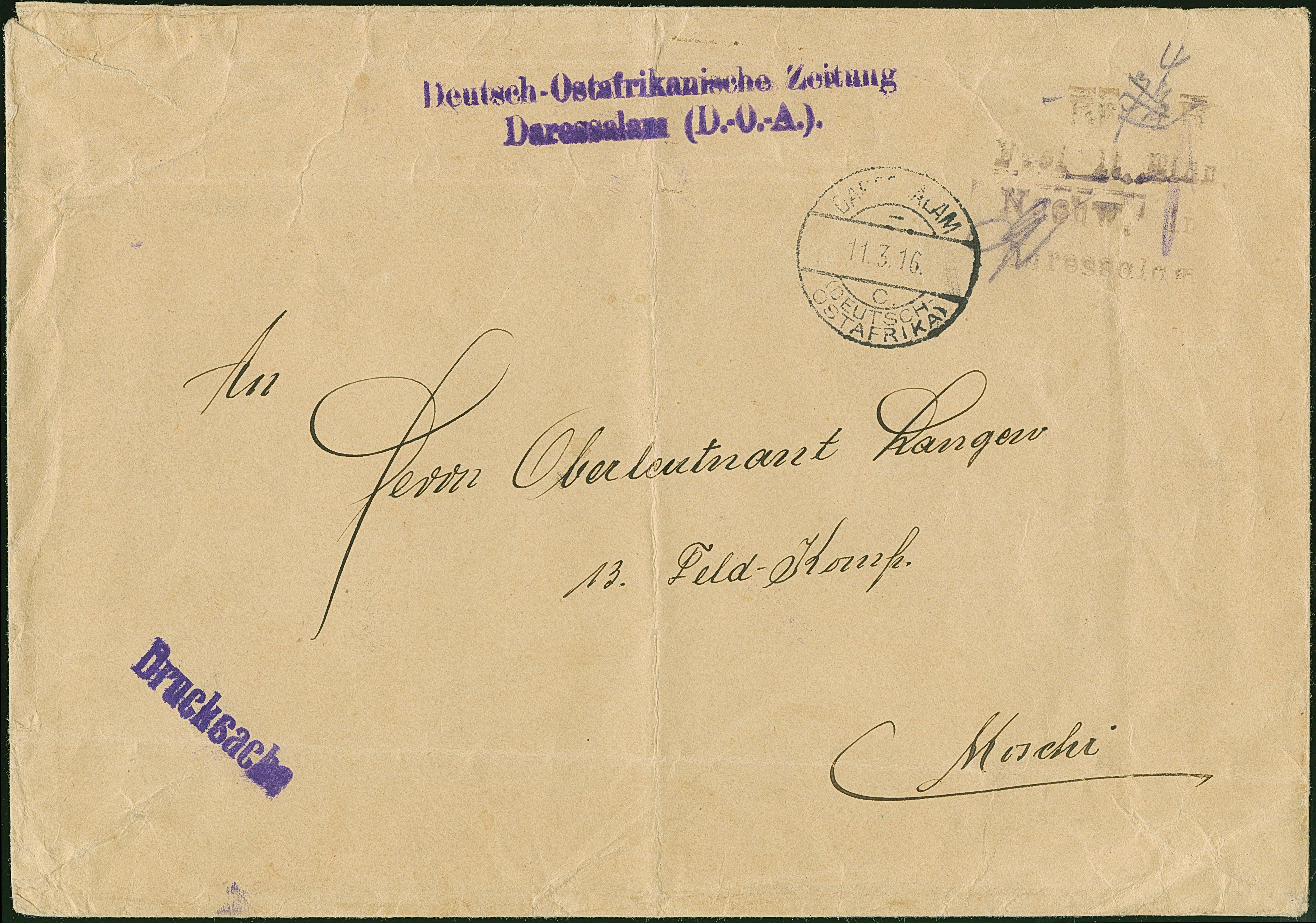 1916, “Rp H. Frei lt. Einn. Nachw. in Daressalam” violetter L4 recht klar mit handschriftlich geändertem Portovermerk von “7½” in “4” (Heller) auf großformatigem Druchsachenumschlag von “DARESSELAM (DOA) c 11.3.16” und violettem Absender-L2 "Deutsch-Ostafrikanische Zeitung Daressalam (DOA) nach Moschi. Der Umschlag mit Falt- und Randfehlern, ansonsten in guter Erhaltung. Eine nicht häufige Barfreimachung auf Drucksachenumschlag