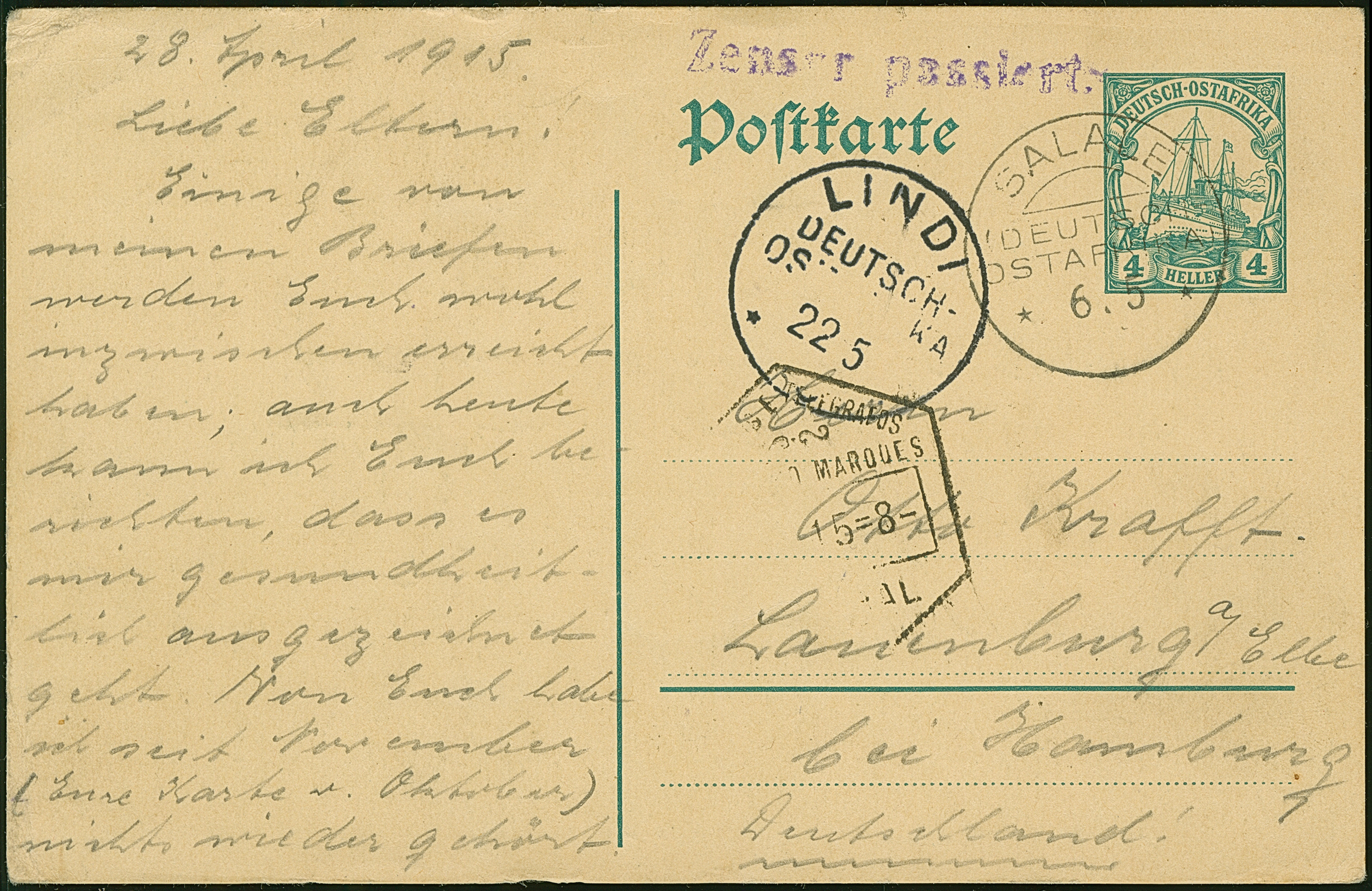 1915, Ganzsachenkarte 4 H. mit Stempel “SALALE (DOA) 6.5.” (ohne Jahreszahl) und viel Text via “LINDI DOA 22.5.15” mit violettem Zensur-L1 “Zensur passiert” und “LOURENCO MAQUES” nach Lauenburg in einwandfreier Erhaltung. Interessante Karte mit seltenem Aufgabe- und Zensurstempel