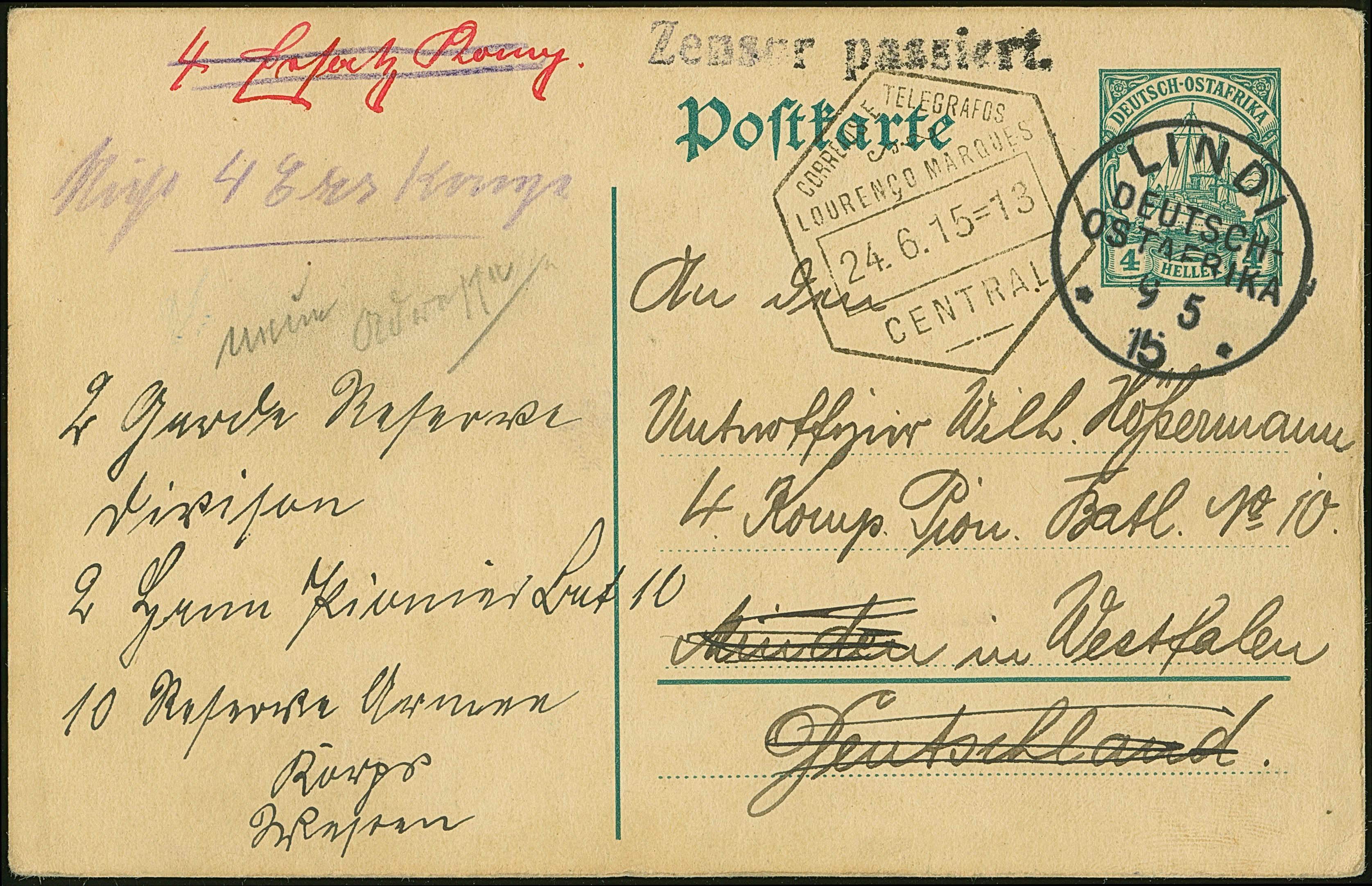1915, Ganzsachenkarte 4 H. mit Stempel “LINDI DOA 9.5.15” mit viel Text und schwarzem Zensur-L1 “Zensur passiert” via “LOURENCO MARQUES 24.6.15” an einen Unteroffizier in Minden mit Nachsendung, in guter Erhaltung