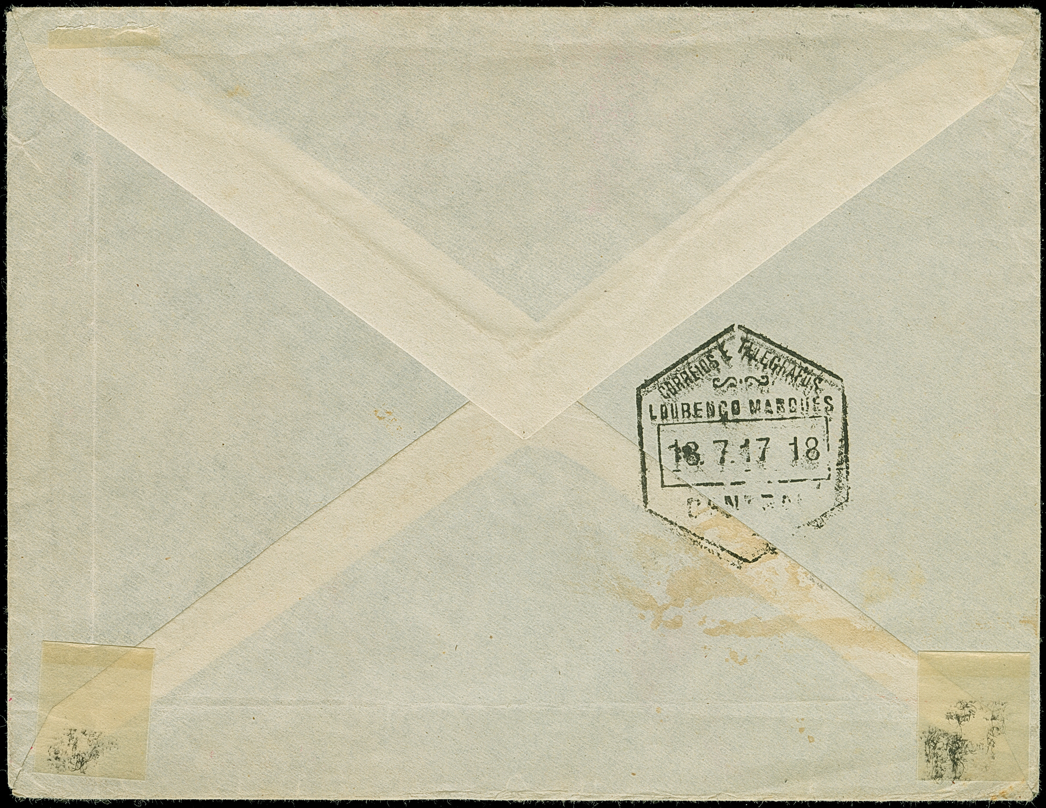 1917, “PROVINCIA DE MOCAMBINQUE REPARTICA DE INFORMACOES QUARTEL GENERAL” roter Ovalstempel auf Kriegsgefangenen-Brief mit rotem Zensurstempel “PASSOU RELA CENSURA LOURENCO MARQUES” und franz. Ovalstempel “OUVERT Par L'AUTORITÉ MILITAIRE 203” sowie rückseitigem Poststempel “LOURENCO MARQUES 16.7.17” nach Hamburg. Der Umschlag mit Beförderungsspuren im Rand, ansonsten in guter Erhaltung