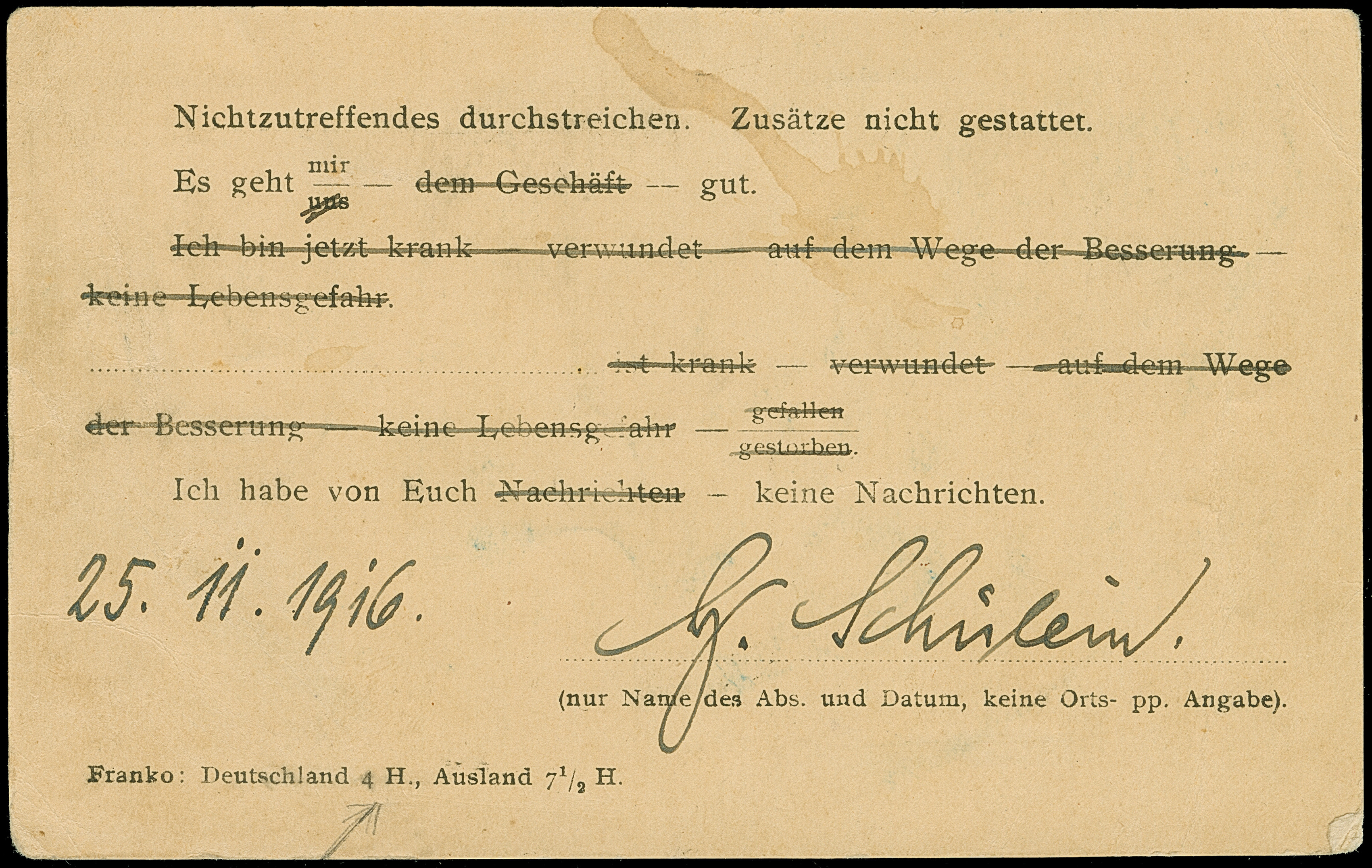 1916, “F.P.O. No. 306 18.DE.16” klar auf Kaiseryacht 4 H. mit Wasserzeichen auf Vordruckkarte eines Internierten mit rückseitigem Zurduck “Franko: Deutschland 4 H., Ausland 7½ H.” und vorderseitigem Zensurstempel “PASSED BY CENSOR No. 3285” nach Deutschland. Die Karte mit kleinen Randspuren, ansonsten in guter Erhaltung. Eine ganz ungewöhnliche und sehr seltene Verwendung