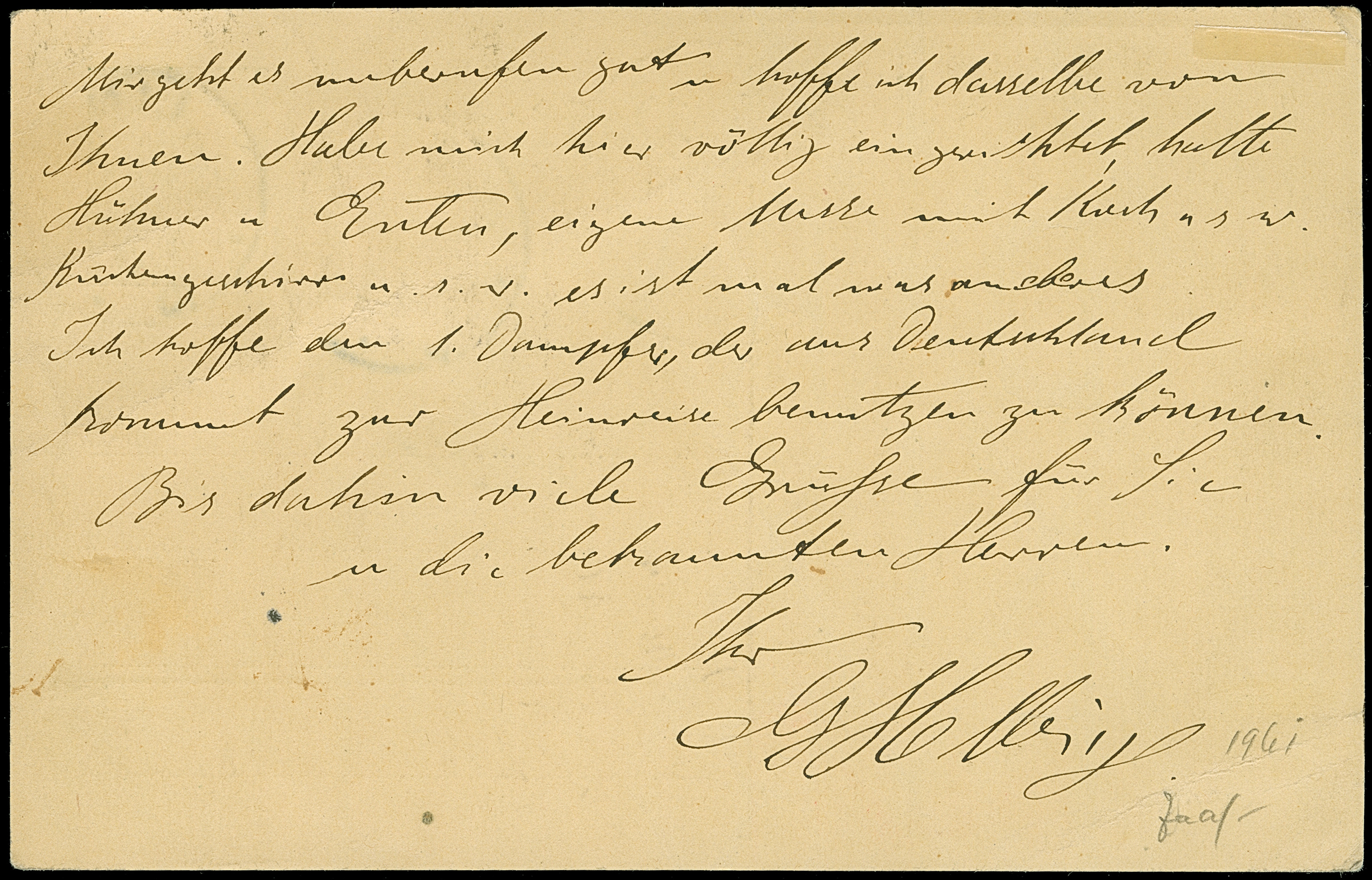 "KISAKI 12/7 95", sehr schöner klarer Abschlag auf Ganzsachenkarte 5 P. auf 10 Pfg. mit kurzem Text nach Hamburg, nachgesandt nach Cuxhaven. Ein sehr schönes Belegstück dieses äußerst seltenen Stempels; ProFi hat nur 6 weitere Ganzstücke registriert.