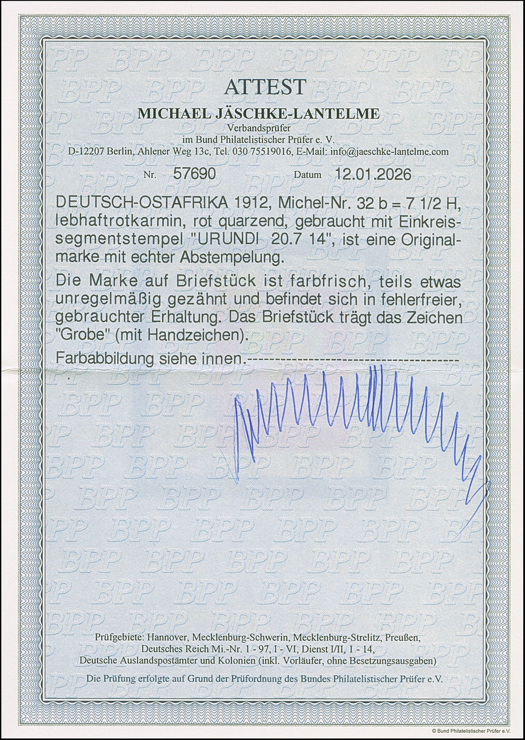 "URUNDI 20.7 14" sauber und voll auf 7½ H. mit Wz. auf Briefstück. Bis auf etwas unregelmäßige Zähnung tadellos. Signiert Grobe und Fotoattest Jäschke-L. BPP (2026)