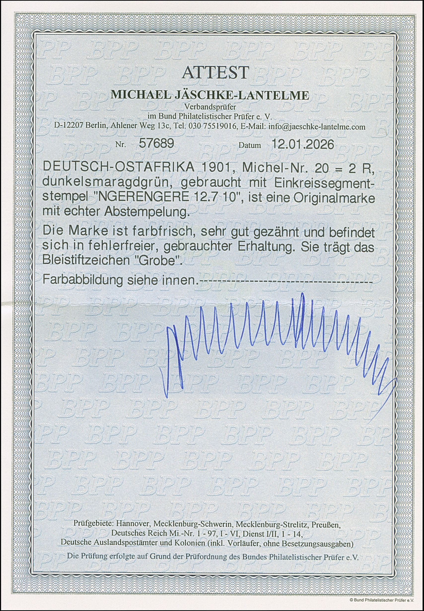"NGERENGERE 12.7.10" glasklar und voll auf 2 R. Einwandfrei. Signiert Grobe und Fotoattest Jäschke-L. BPP (2026)