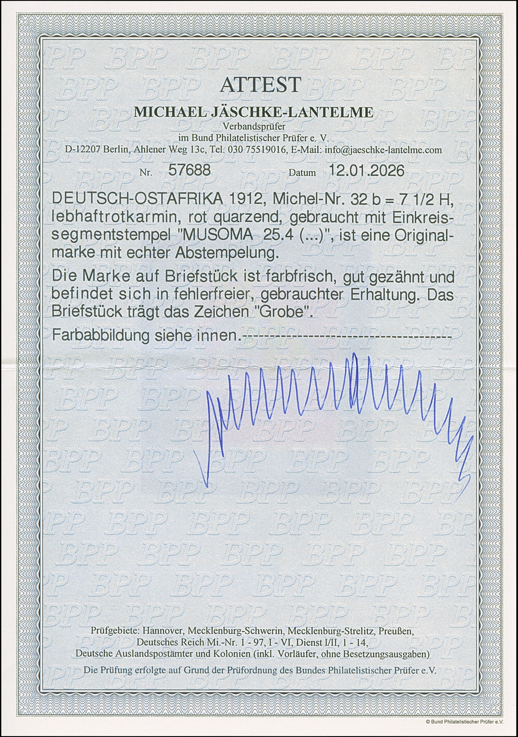 "MUSOMA 25/4.." sauber auf 7½ H. mit Wz. Einwandfrei. Signiert Grobe und Fotoattest Jäschke-L. BPP (2026)