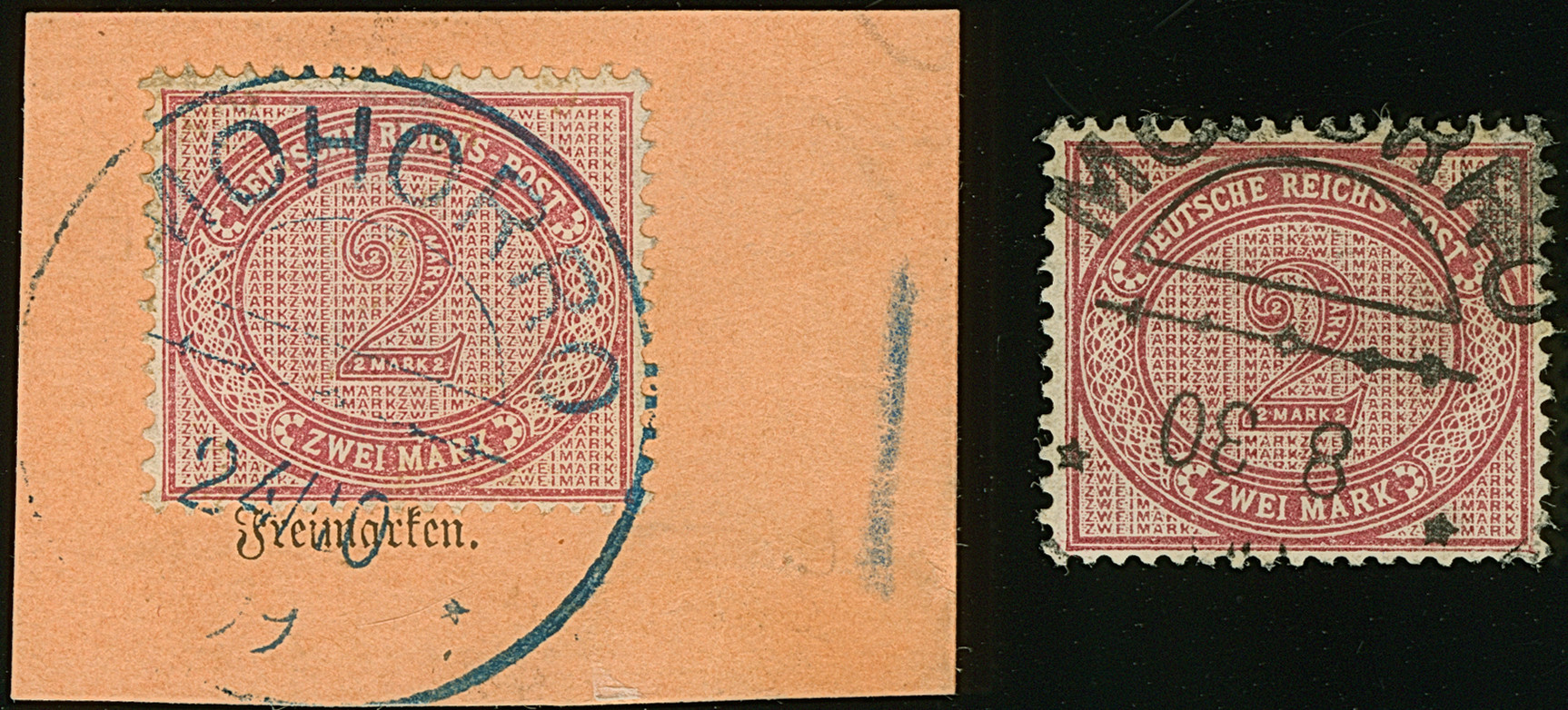 "MOHORRO 24/10 99" in blau auf 2 M. auf Postanweisung Ausschnitt, dazu der gleiche Stempel in schwarz mit kopfstehendem Datum auf 2 M.