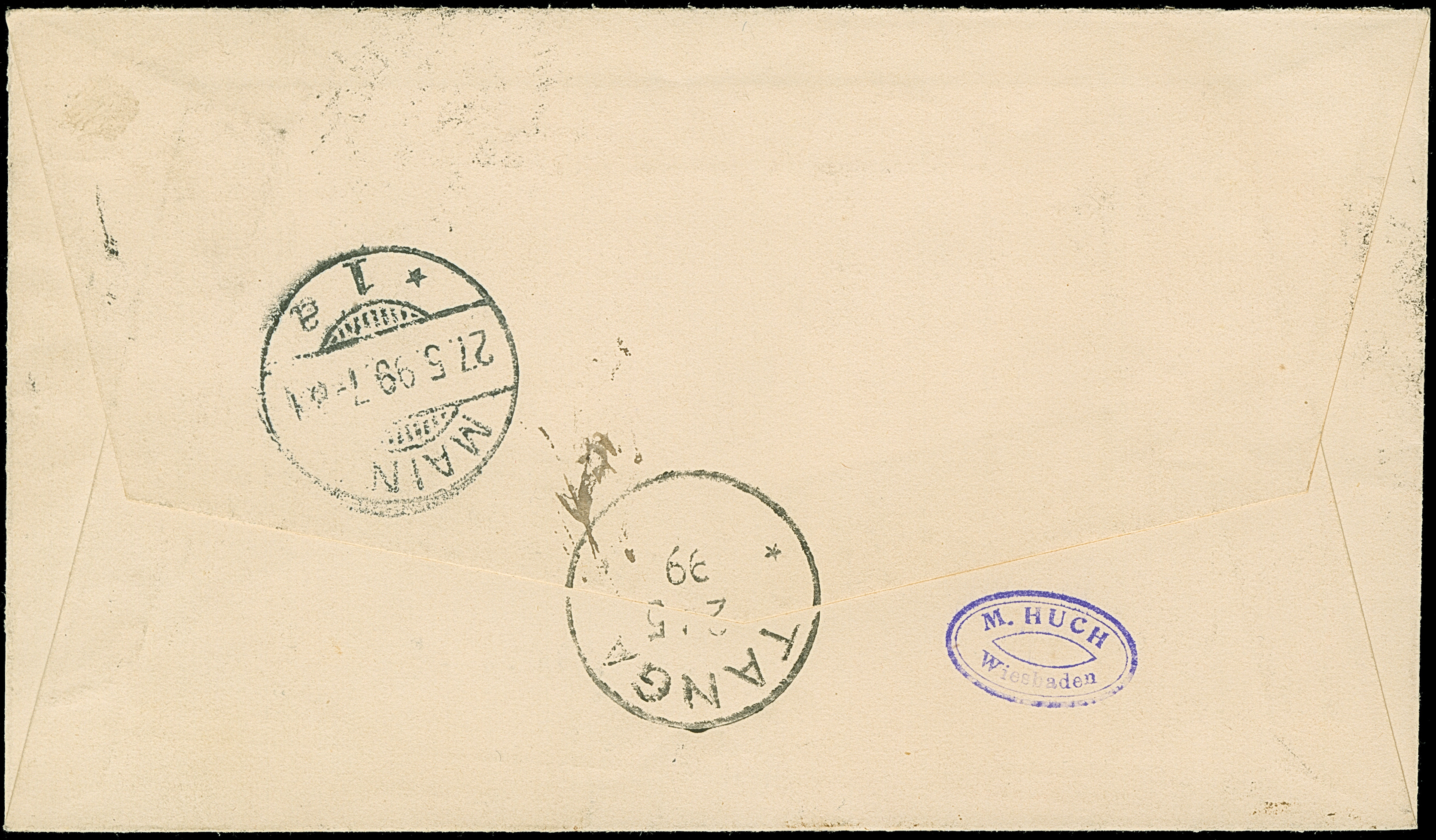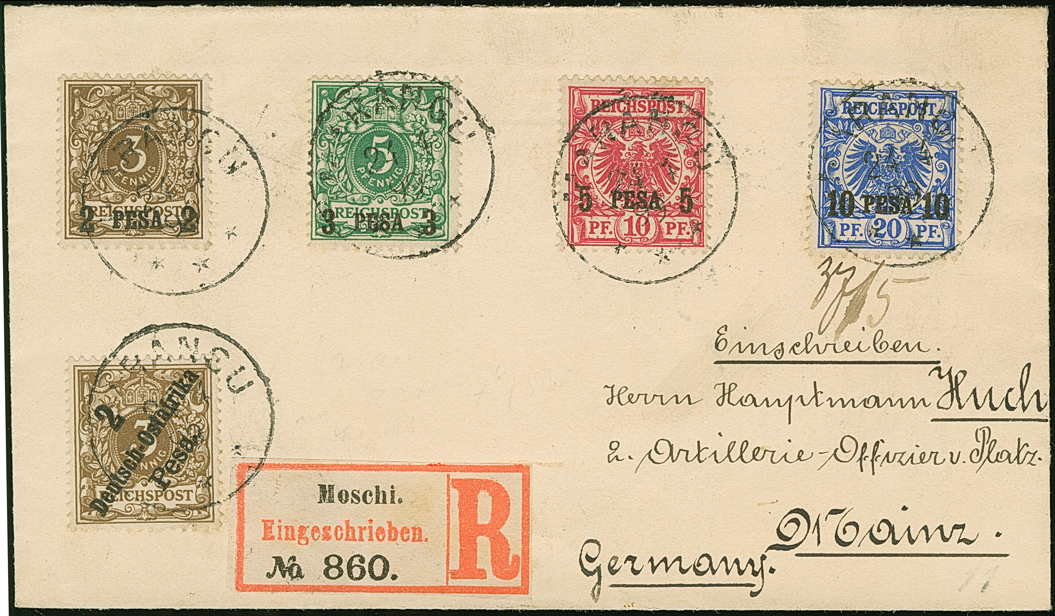 "MARANGU 24/4 99" sauber auf 1893, 2 - 10 P. und 1896, 2 P., auf kleinem R-Brief mit Aushilfs-R-Zettel von Moschi, an Huch, Mainz, mit Durchgangsstempel von Tanga und Ankunftsstempel. Es sind nur ganz wenige R-Briefe von Marangu registriert.